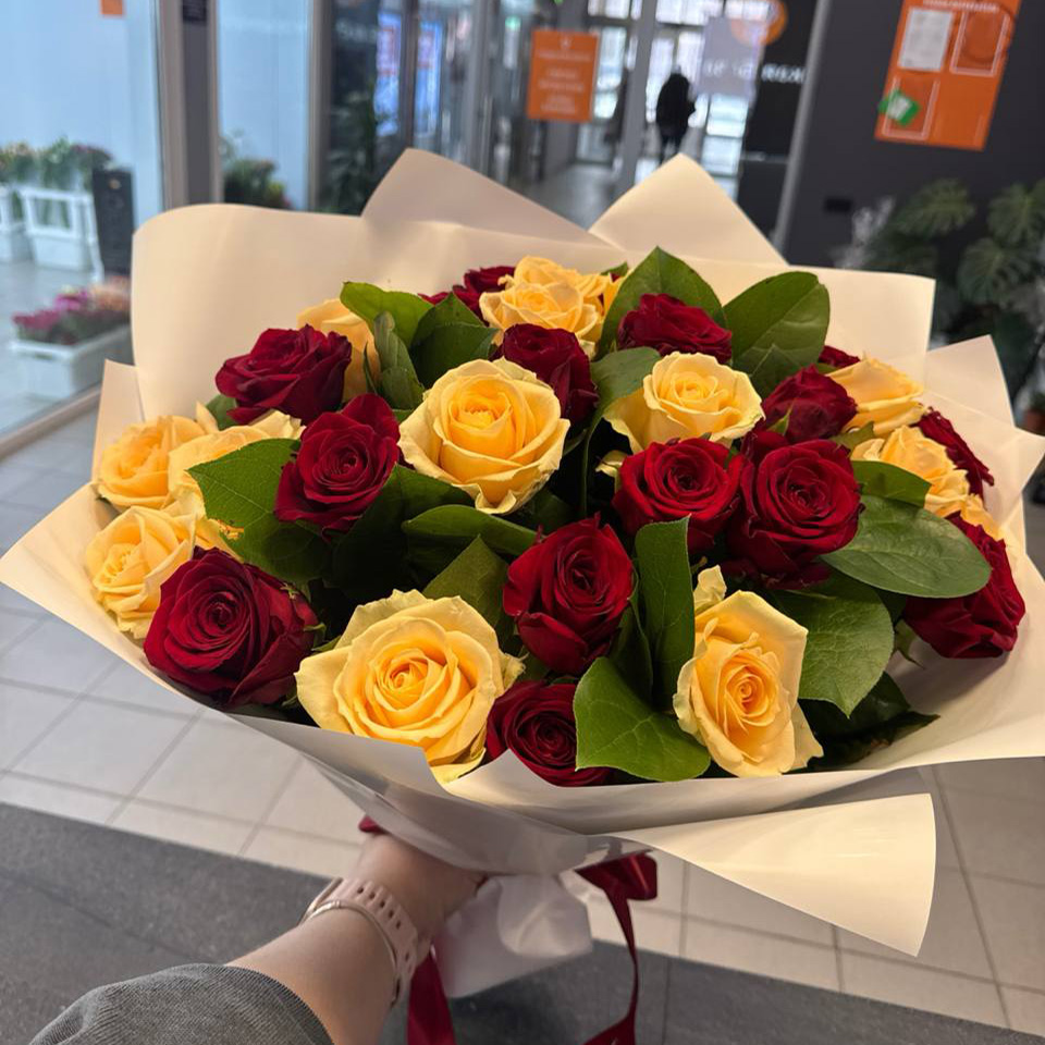 Дополнительно: Букет просто огонь! Всем рекомендую. Цветы свежие и красивые, доставка быстрая. И очень круто, что два цвета в одном букете, девочка-флорист посоветовала. Девушка в восторге) ещё вернусь!