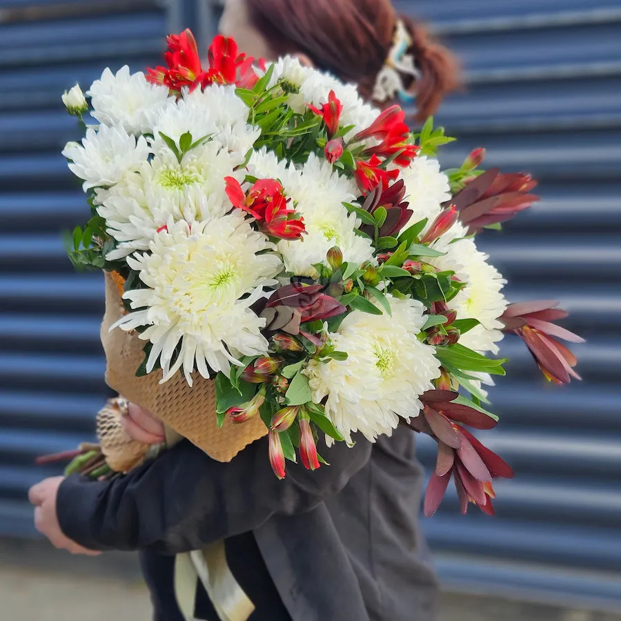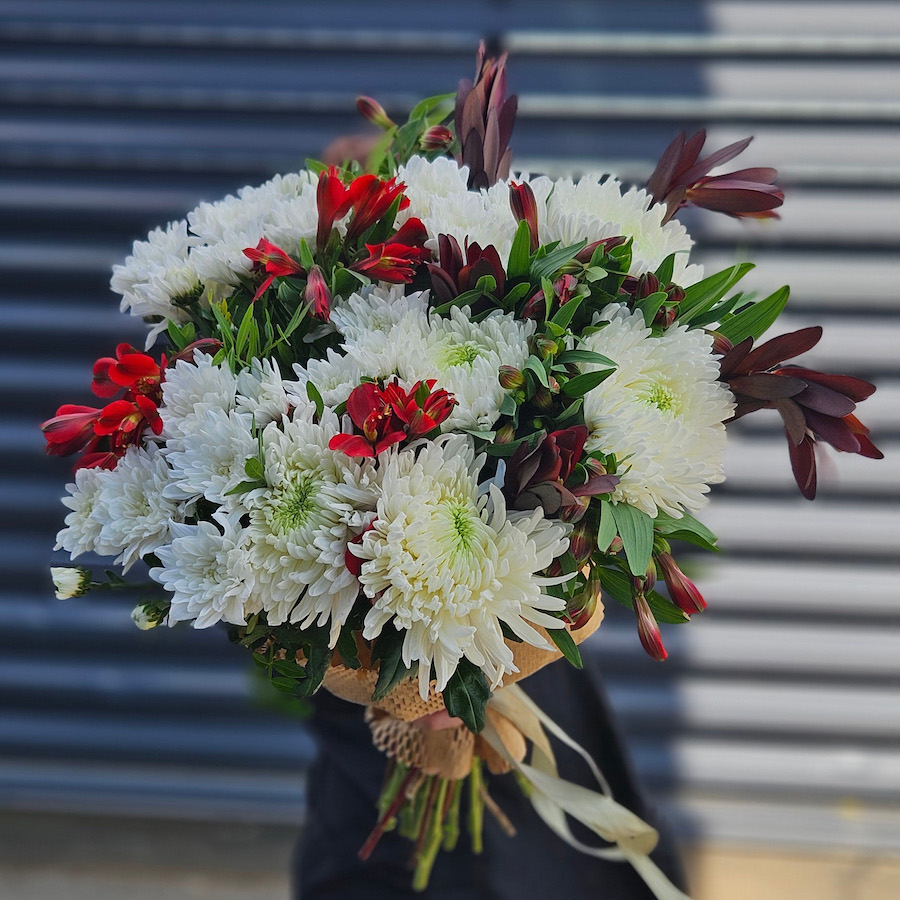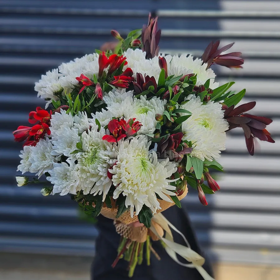 Большой букет хризантем, альстромерий и сафари
