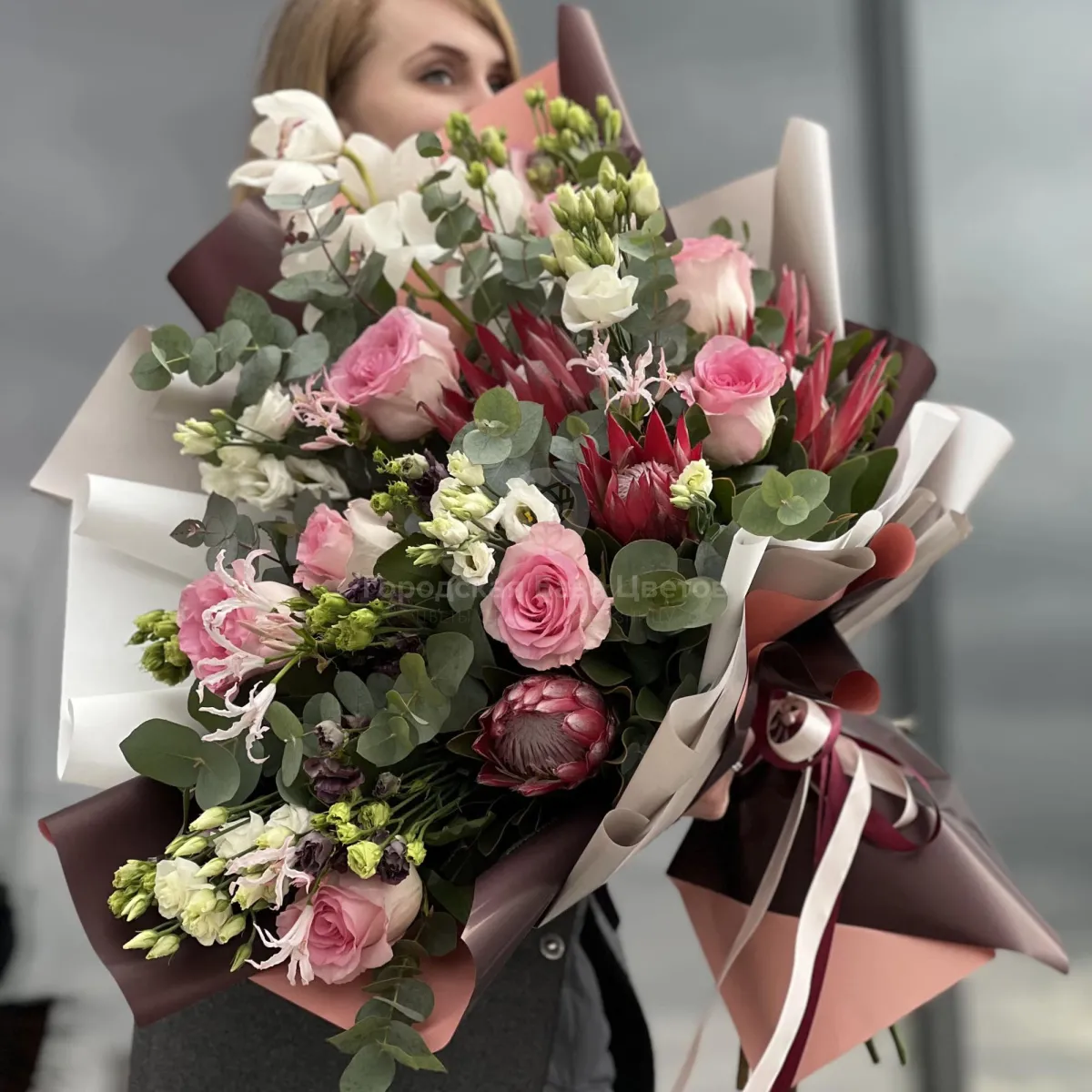 Дополнительно: Флорист предложил добавить зелень и белых роз — не думал, что это так красиво. Получилось нестандартно и очень нежно.