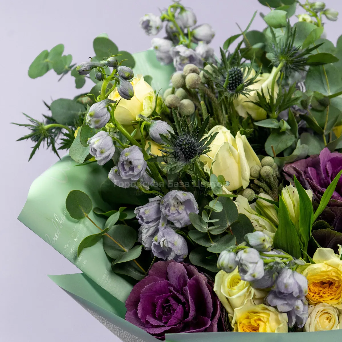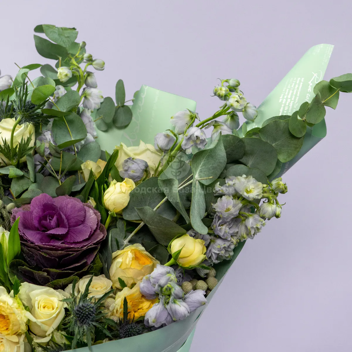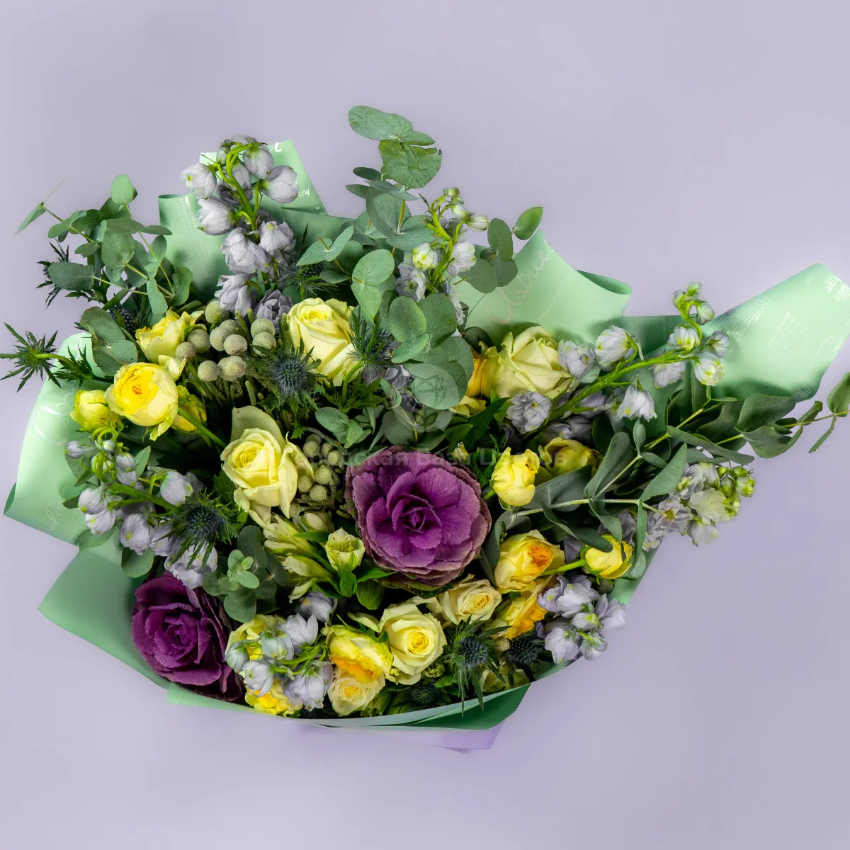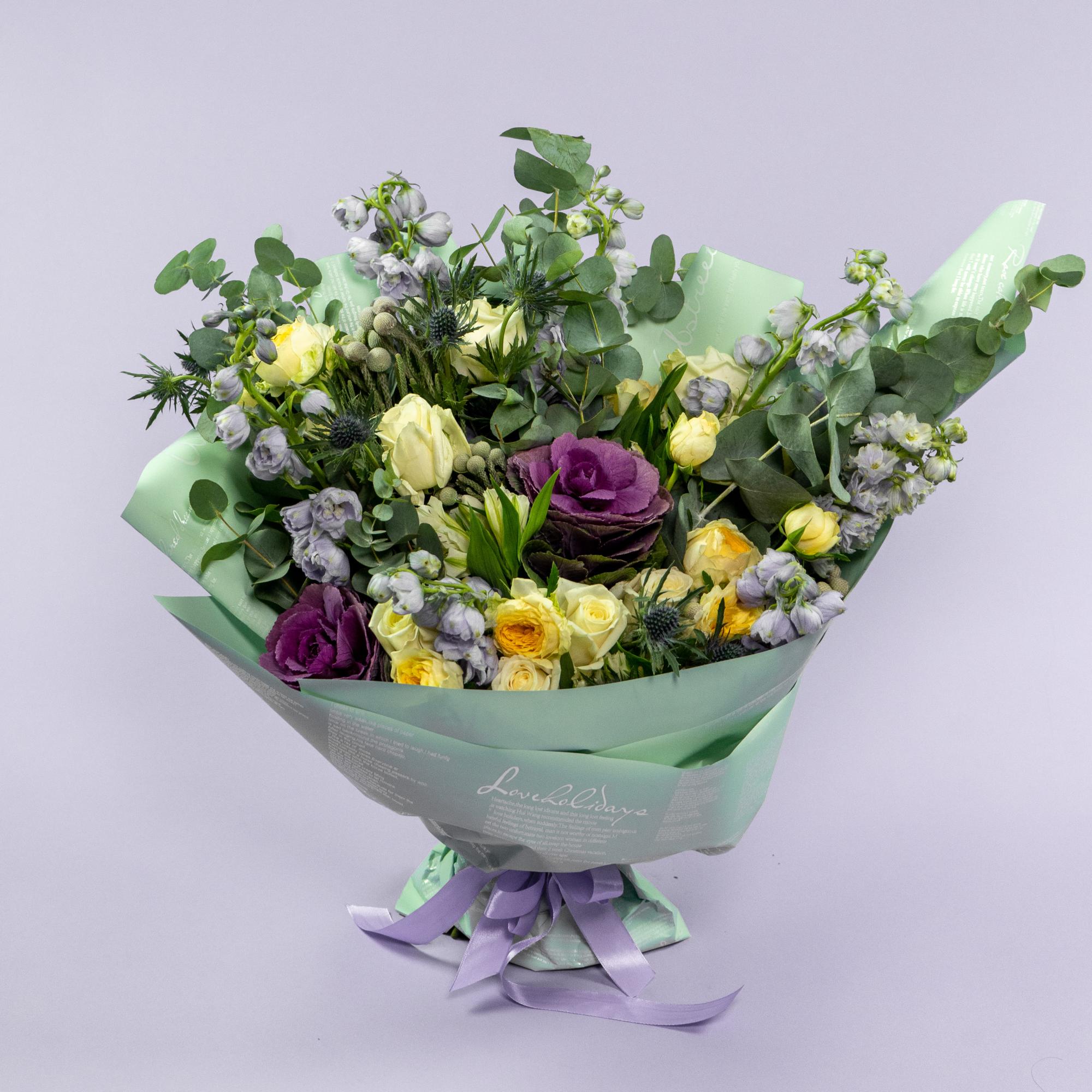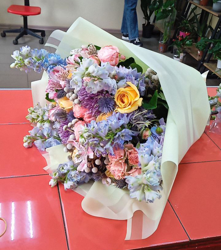 Букет из роз микс и дельфиниумов