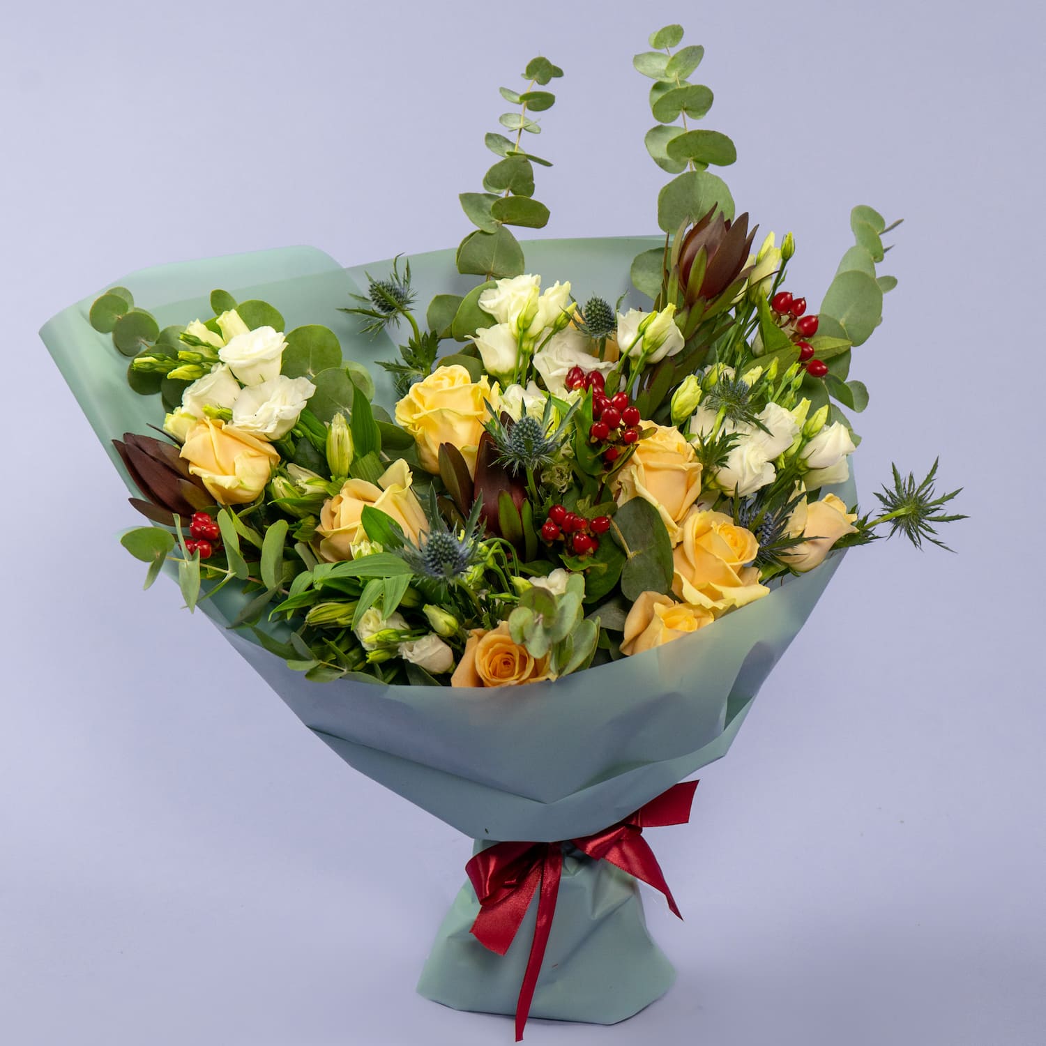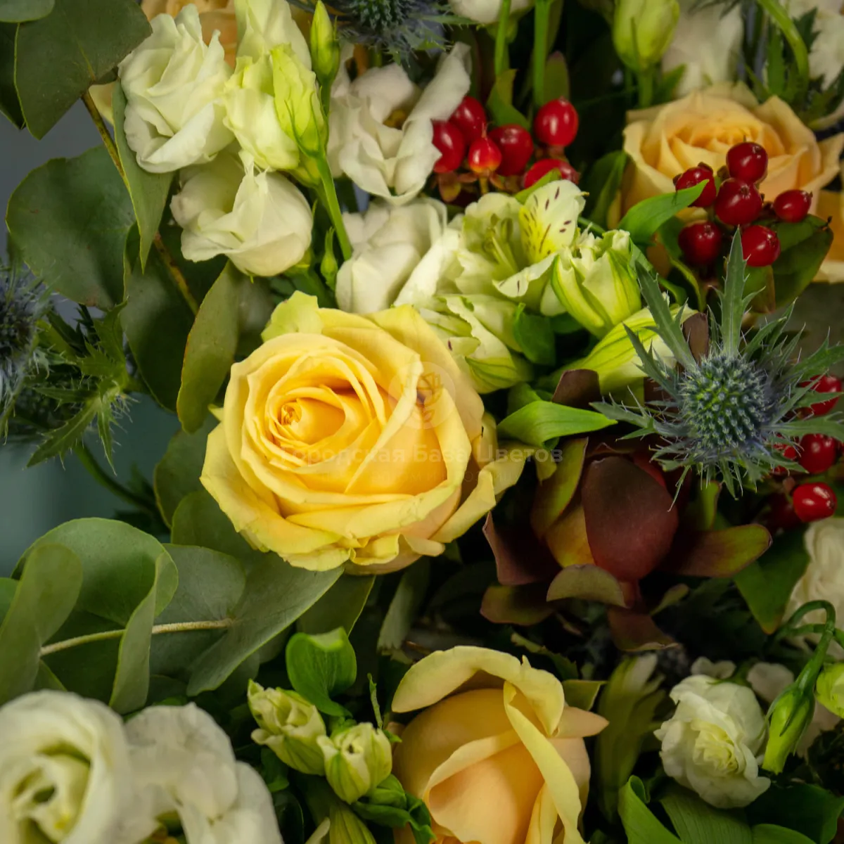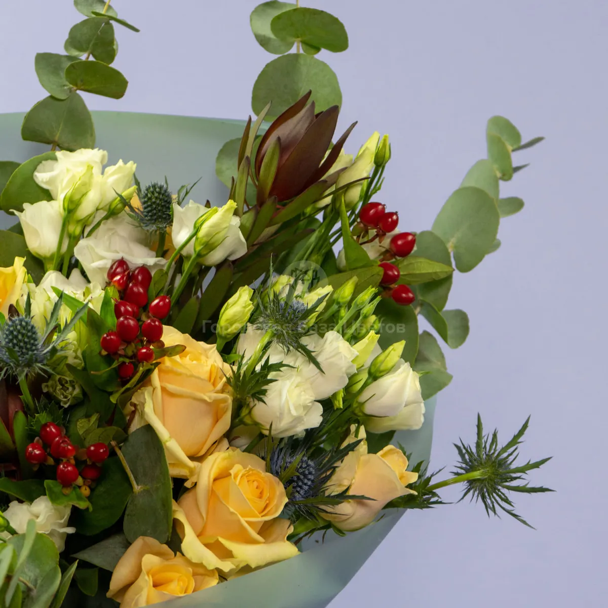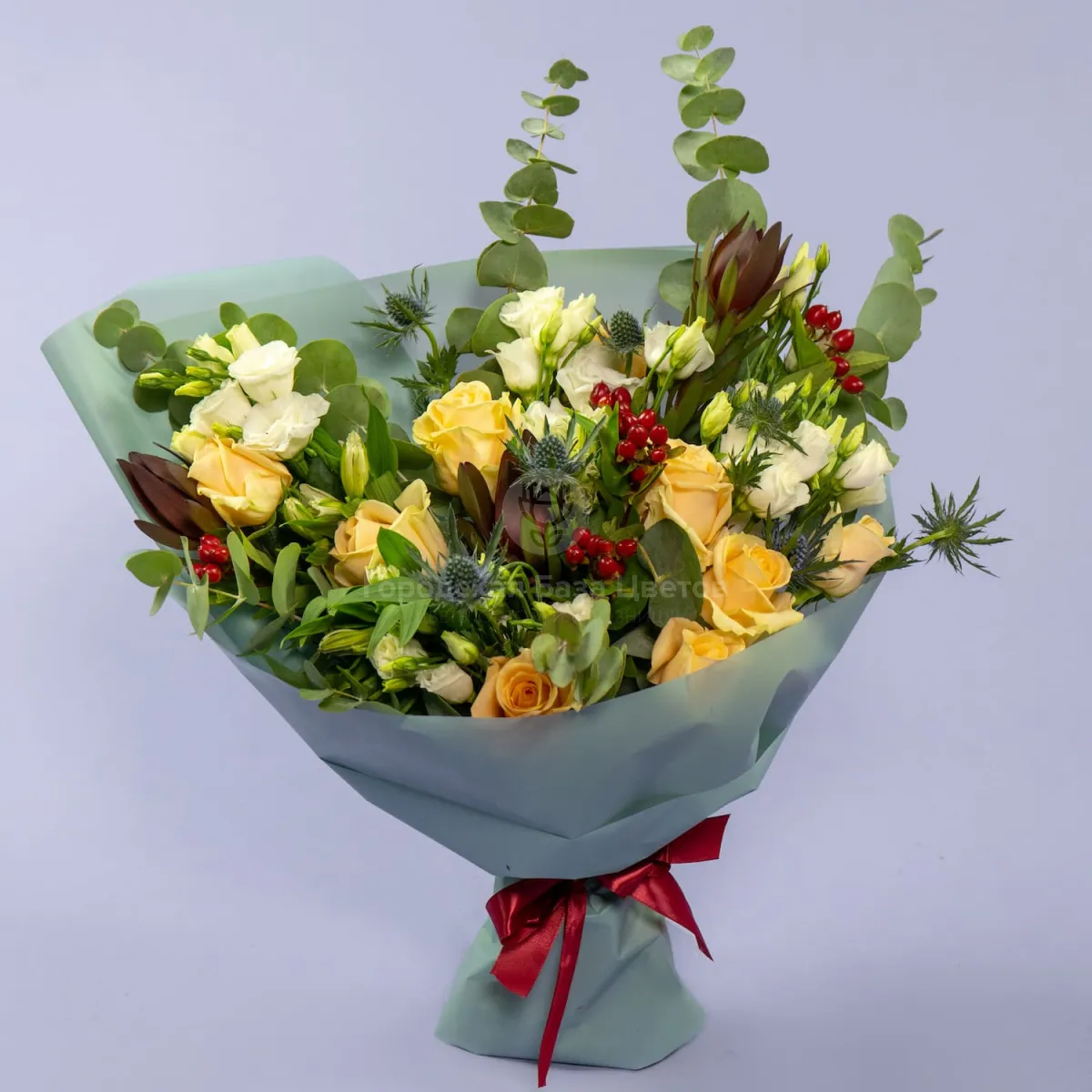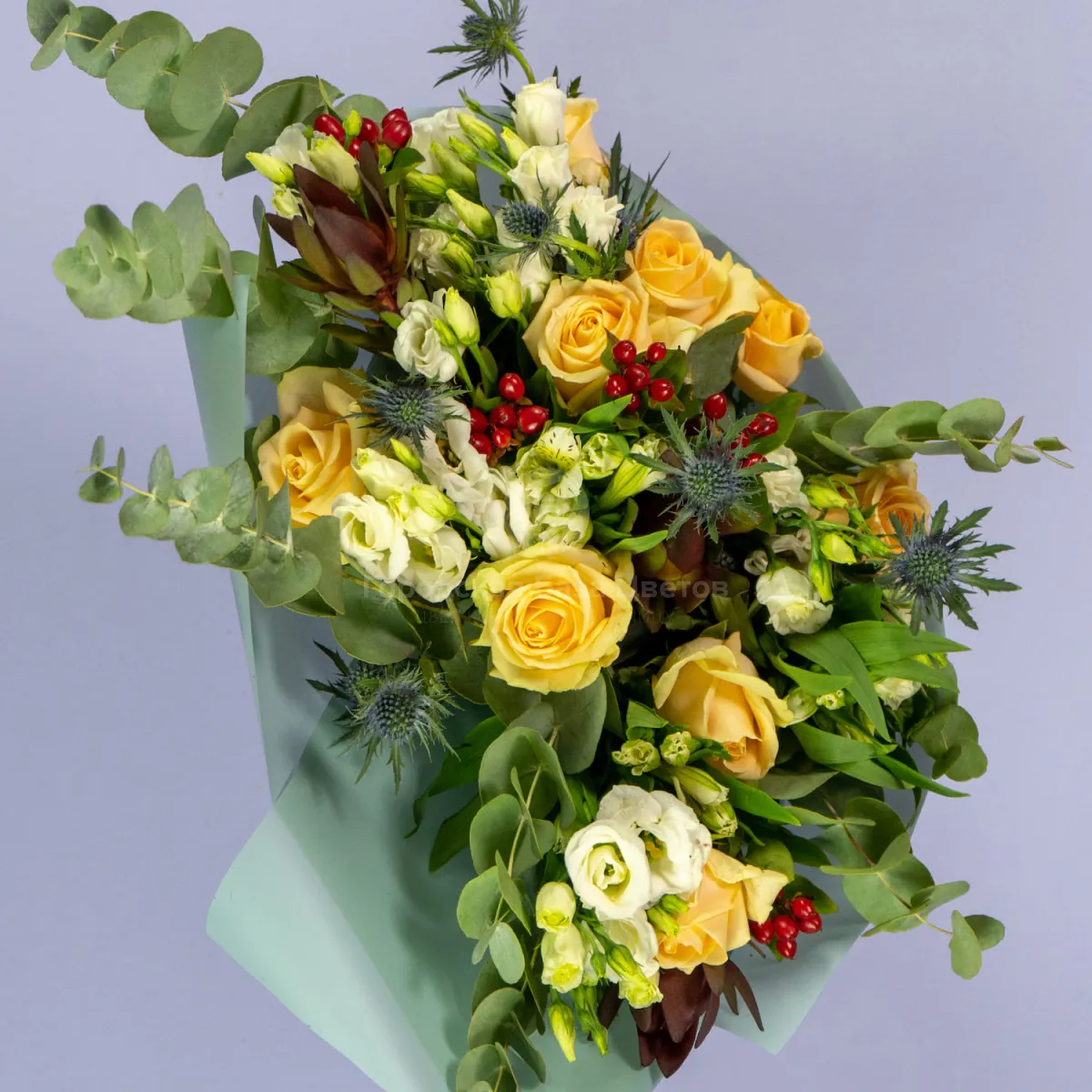 Букет из 9 роз, эустом и эрингиумов