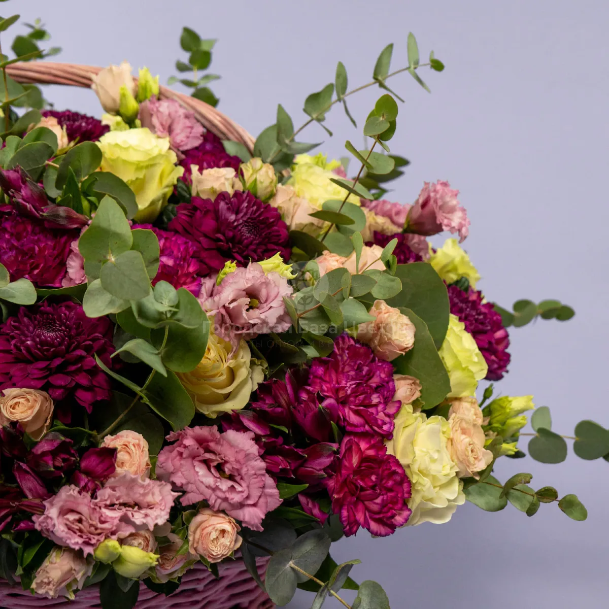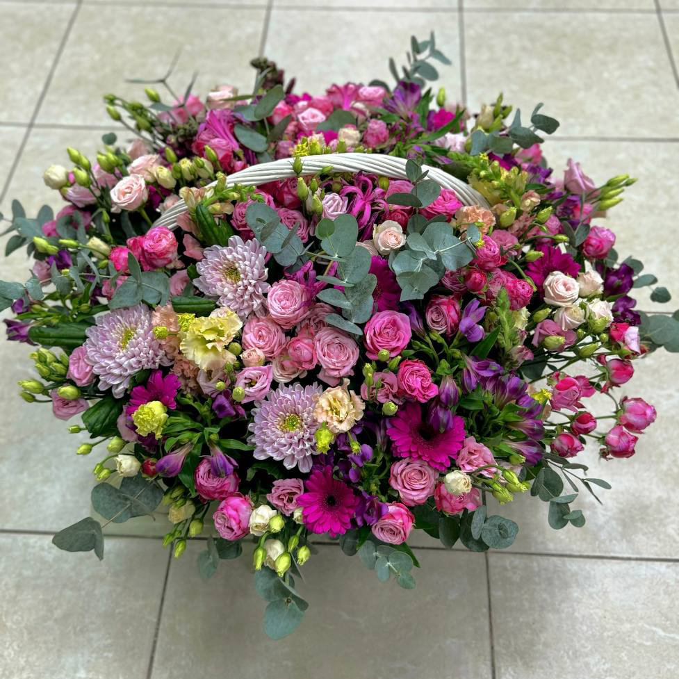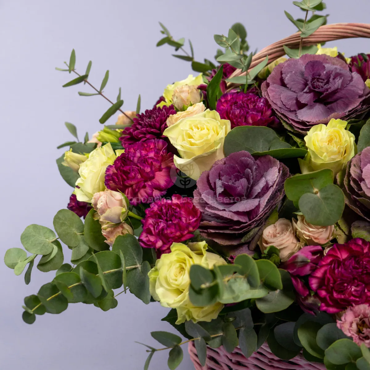 Розы микс и гвоздики в корзине