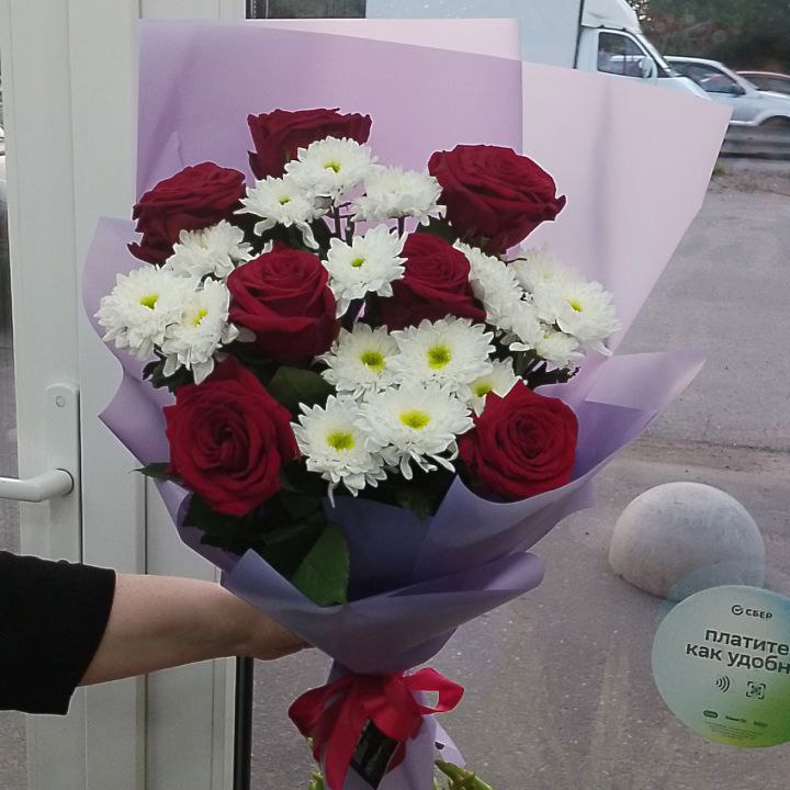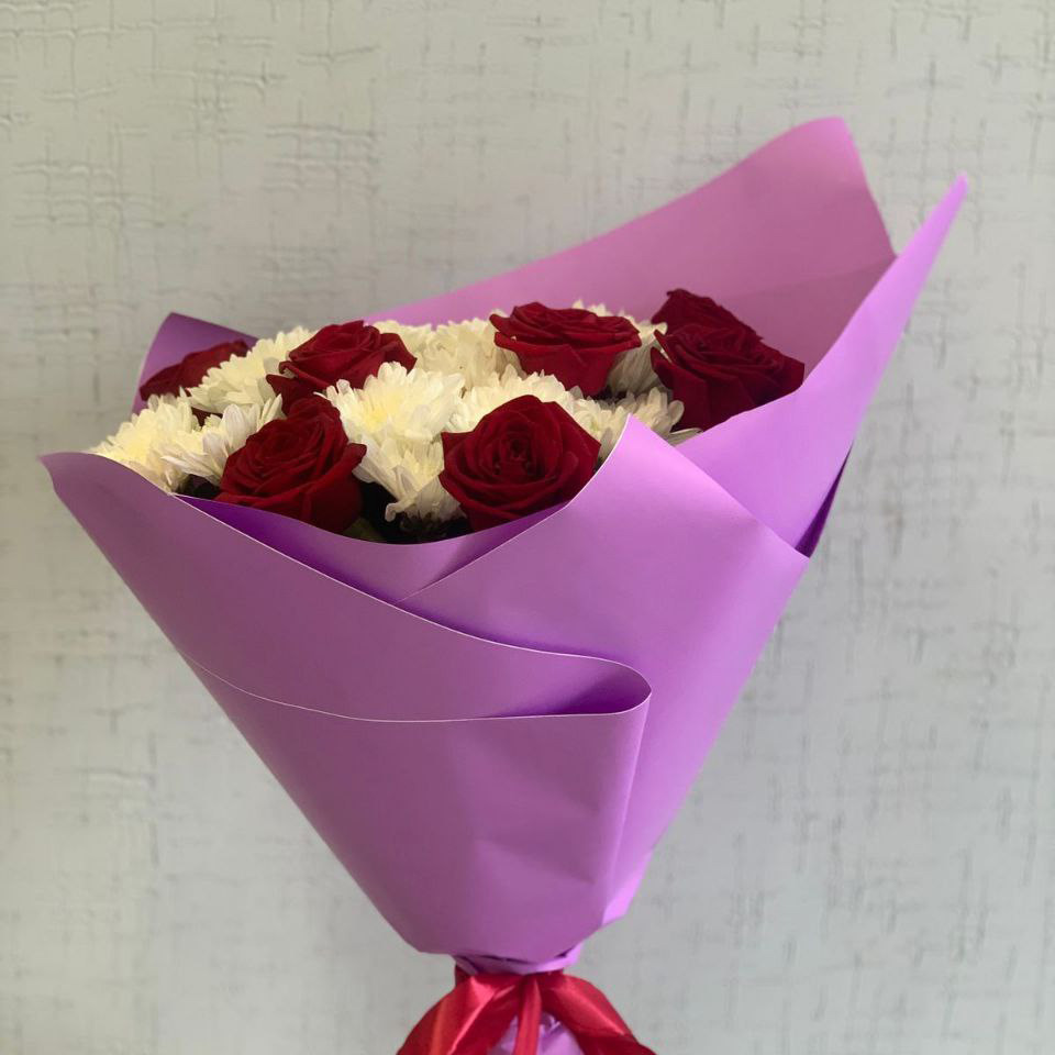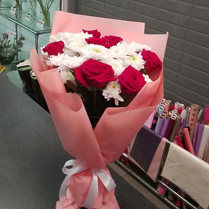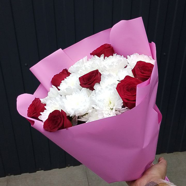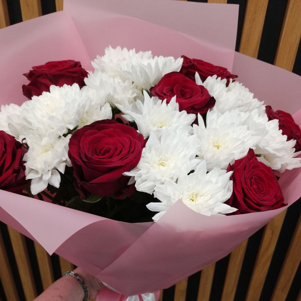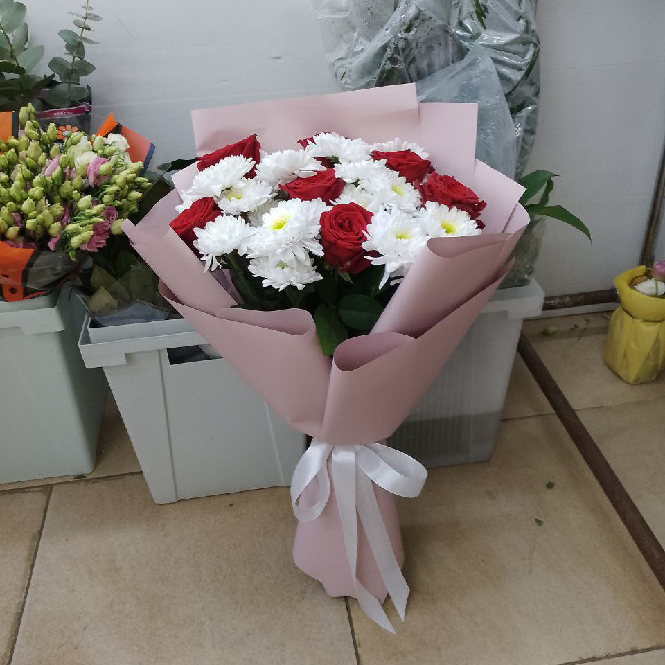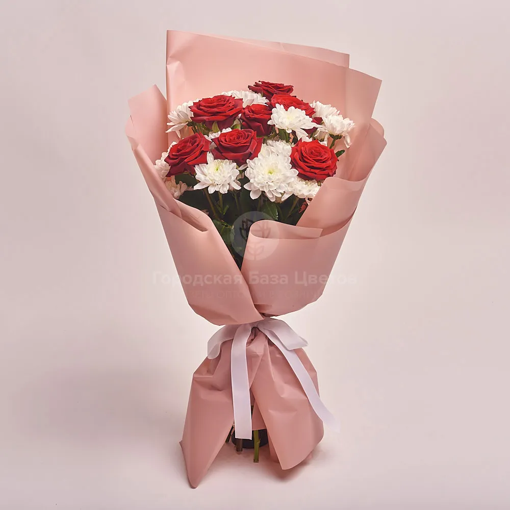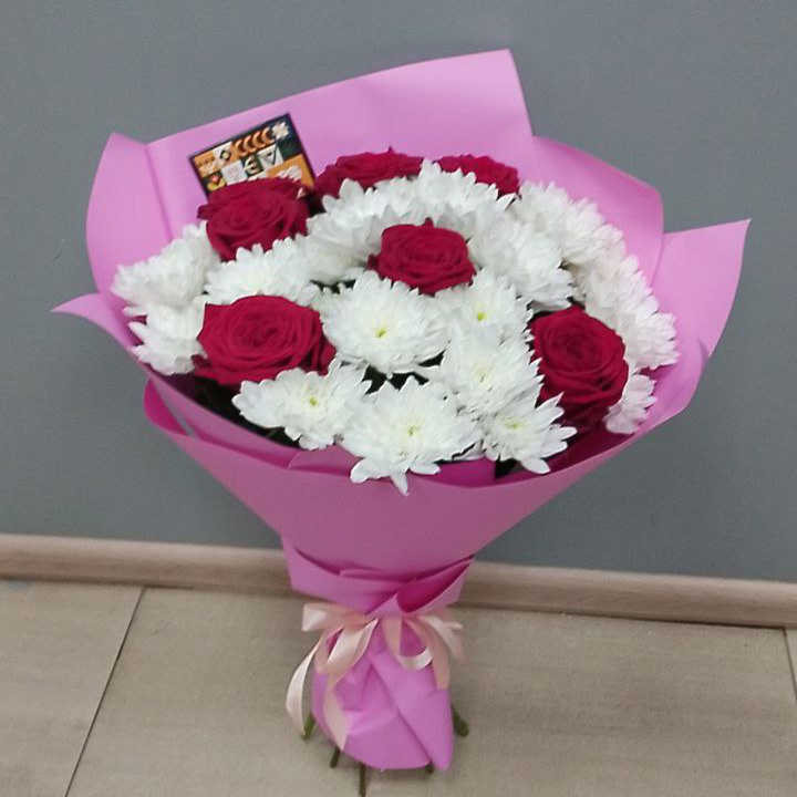 Букет из хризантем и красных роз (60 см)