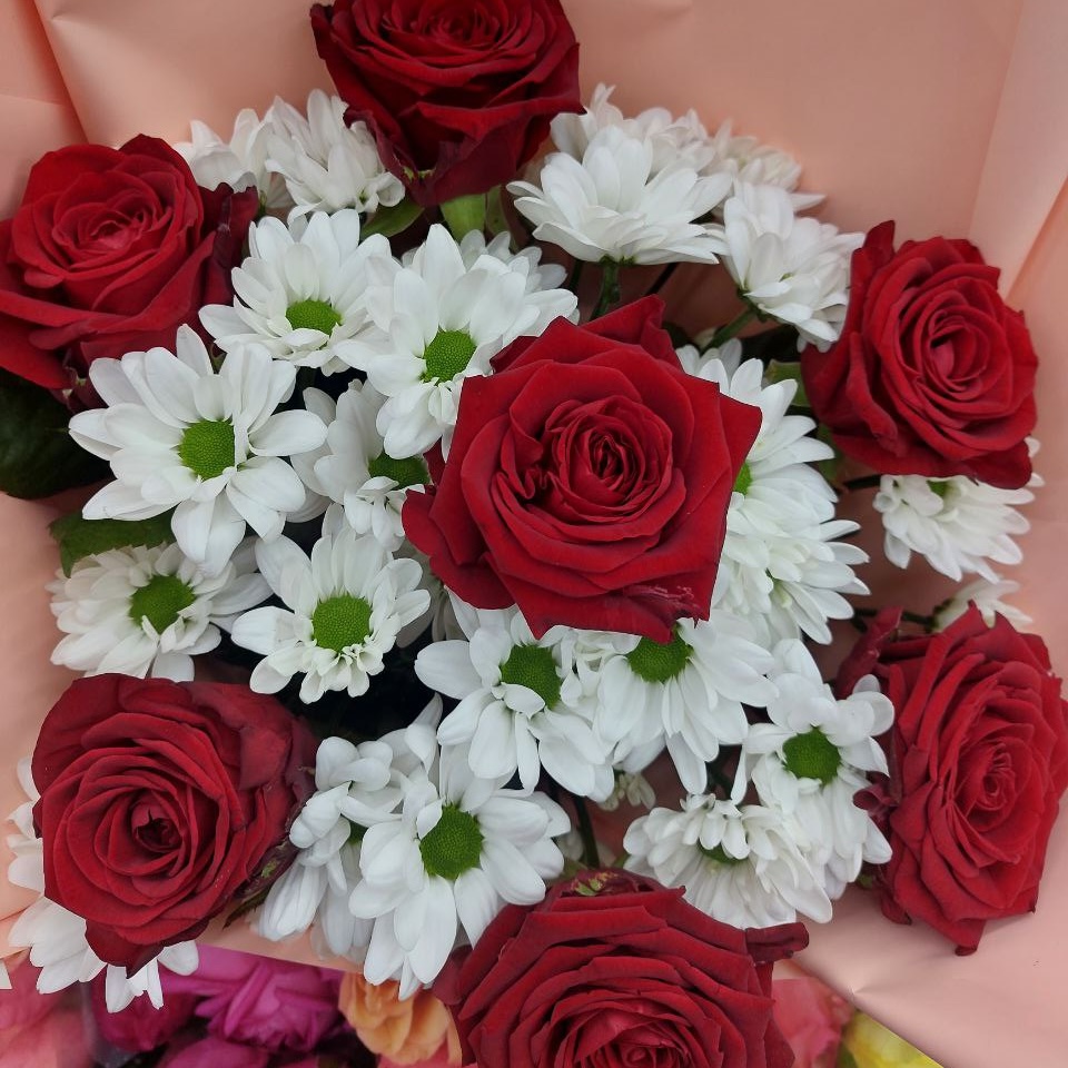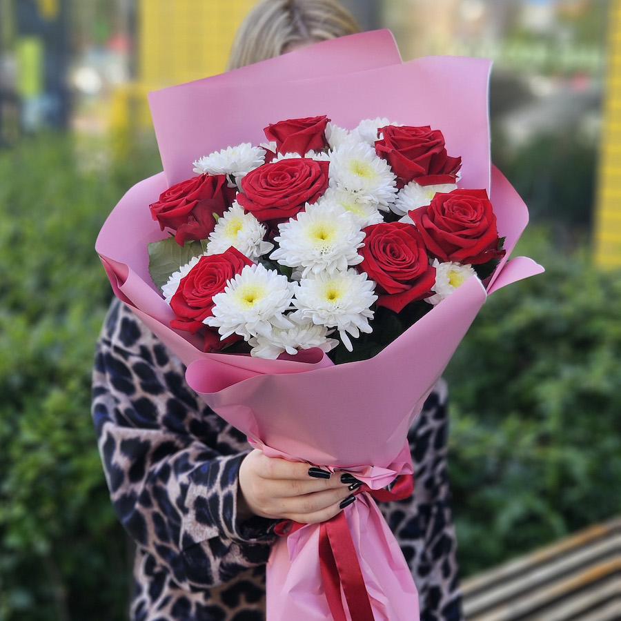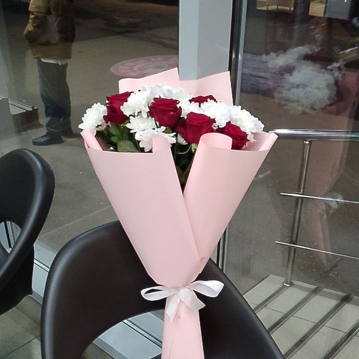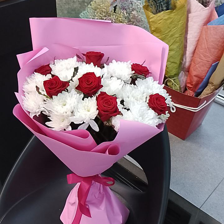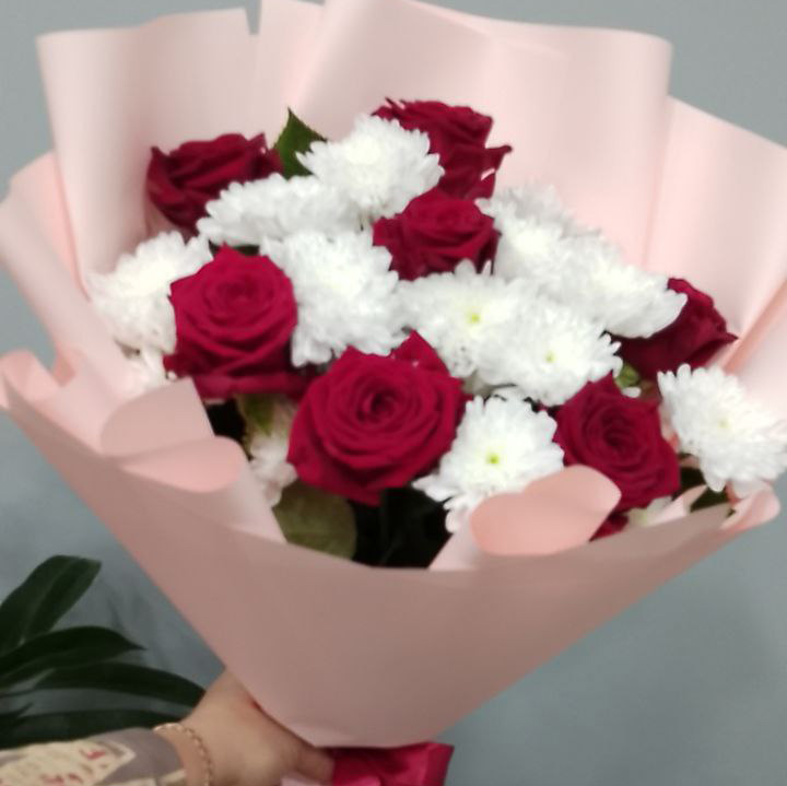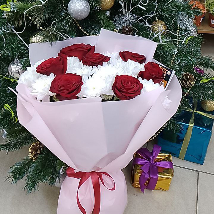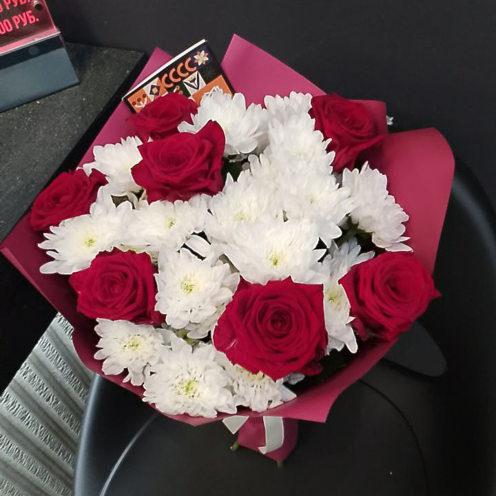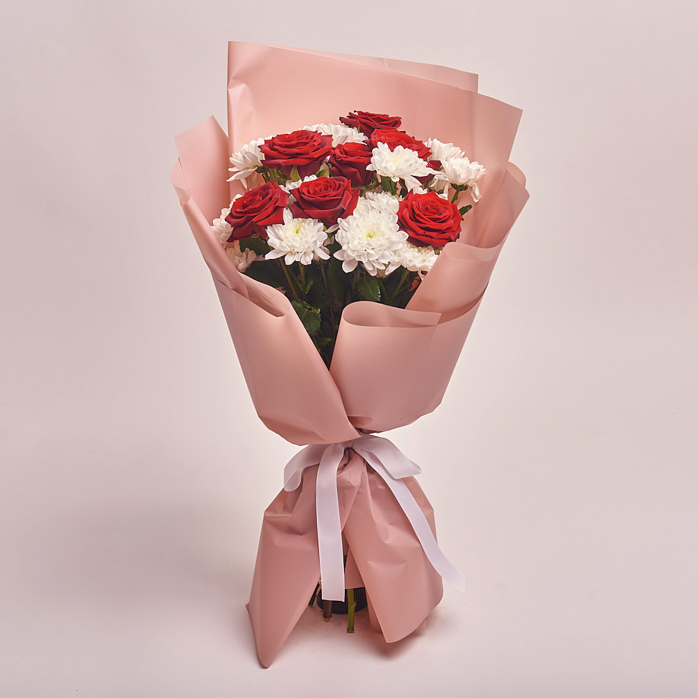 Букет из хризантем и красных роз (60 см)