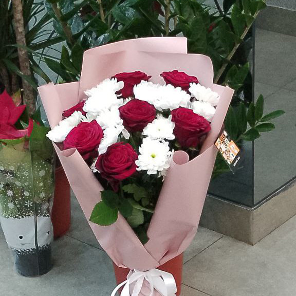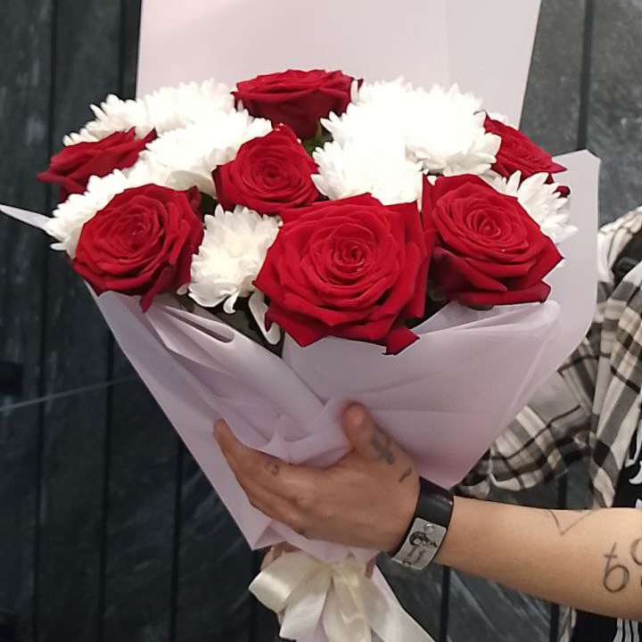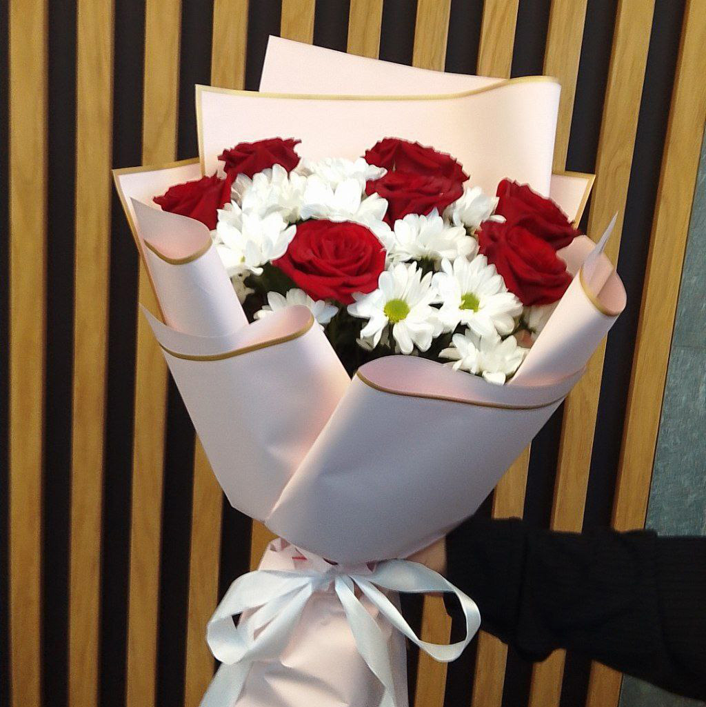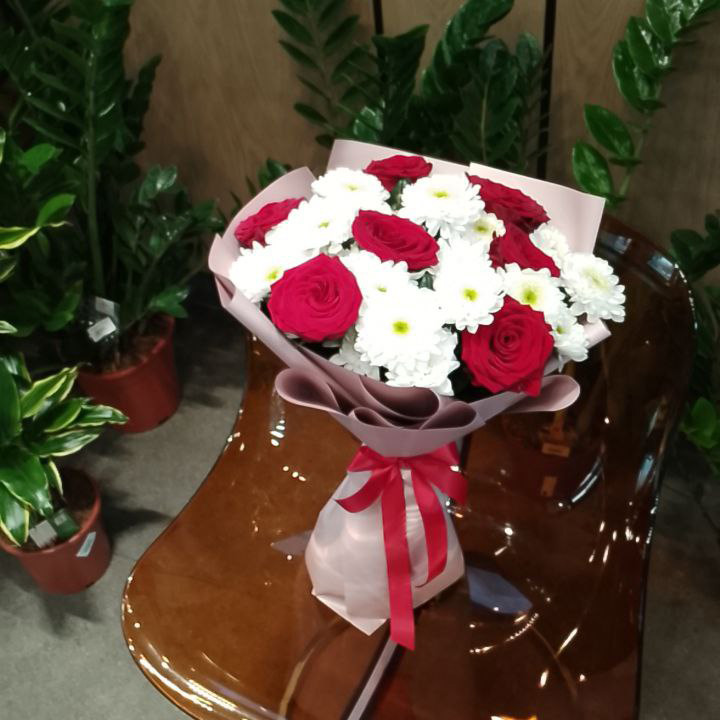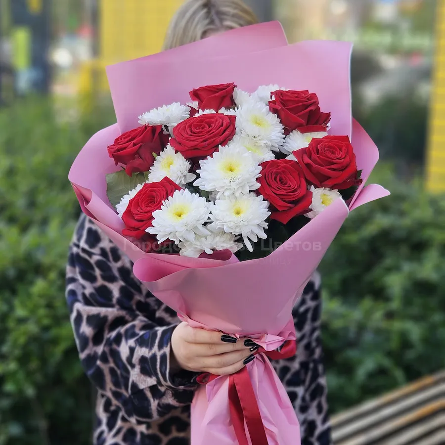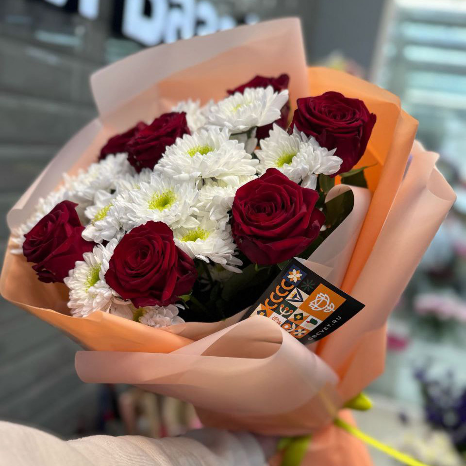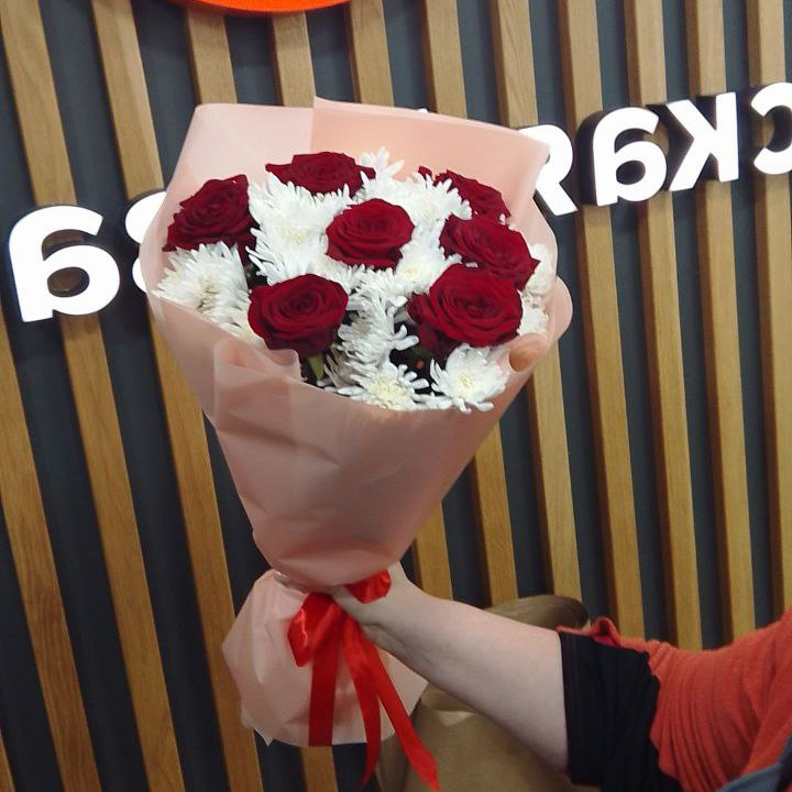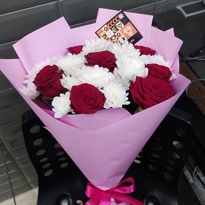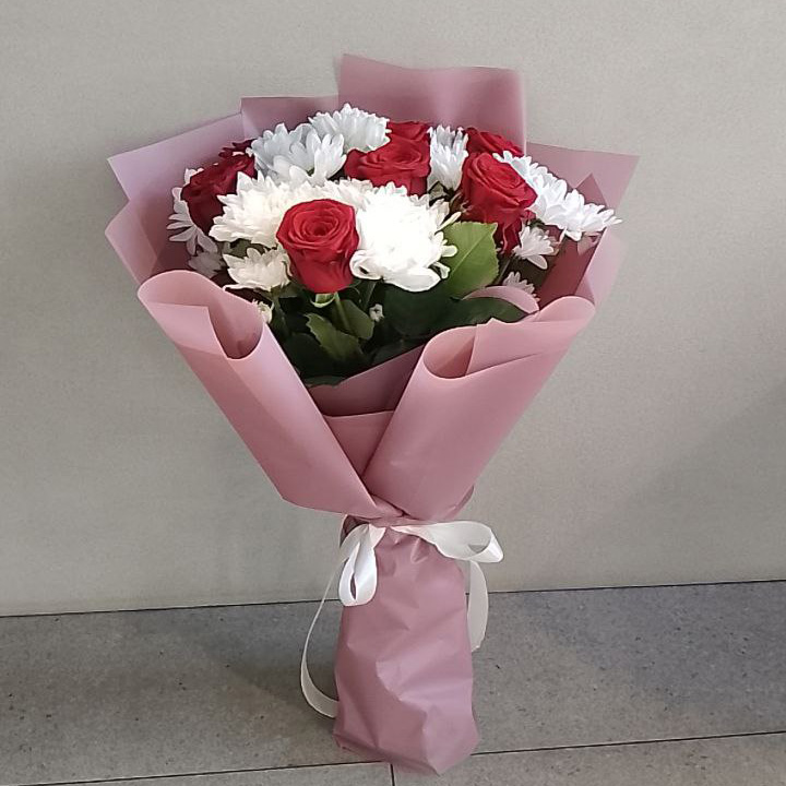 Букет из хризантем и красных роз (60 см)