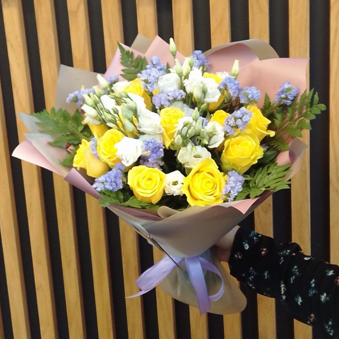 Букет из эустом, папоротника и роз
