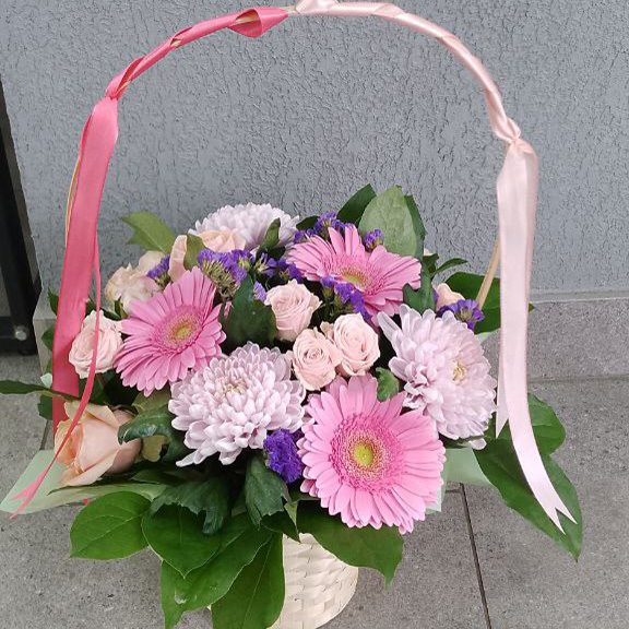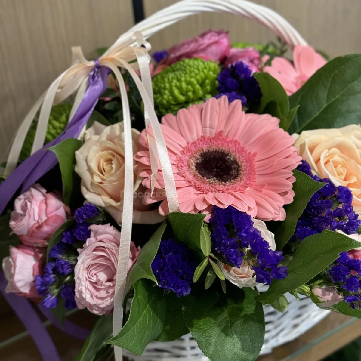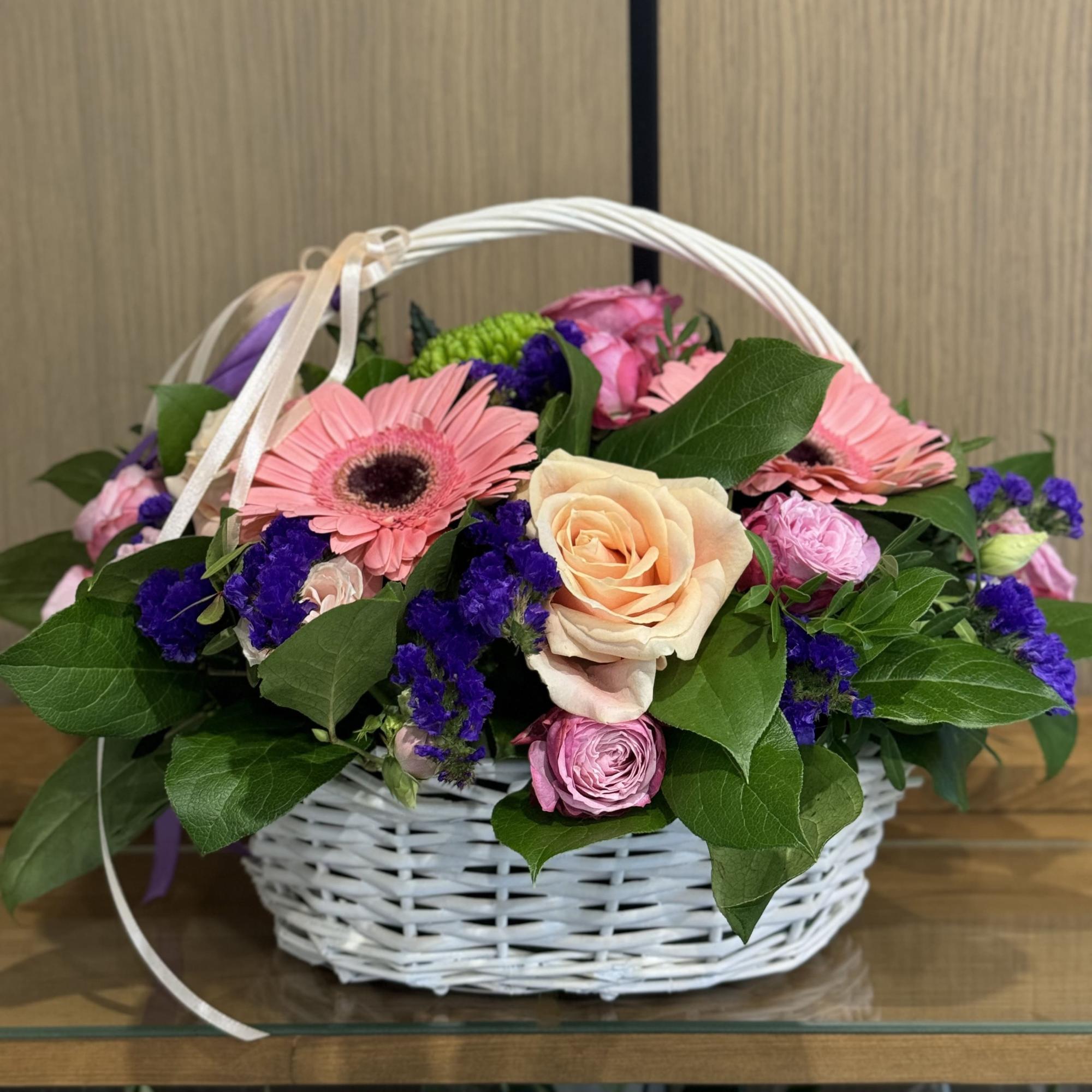 Герберы, хризантемы и розы в коробке