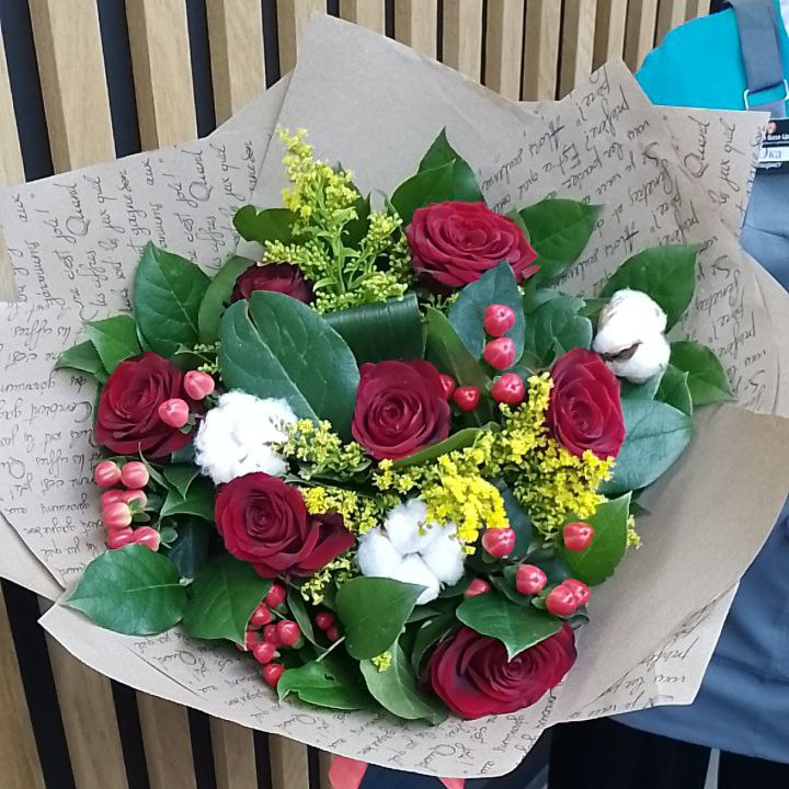 Букет из гиперикума, роз и аспидистра