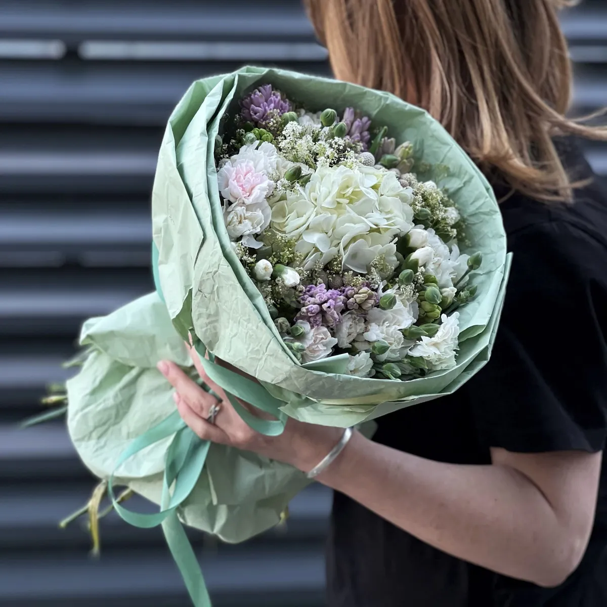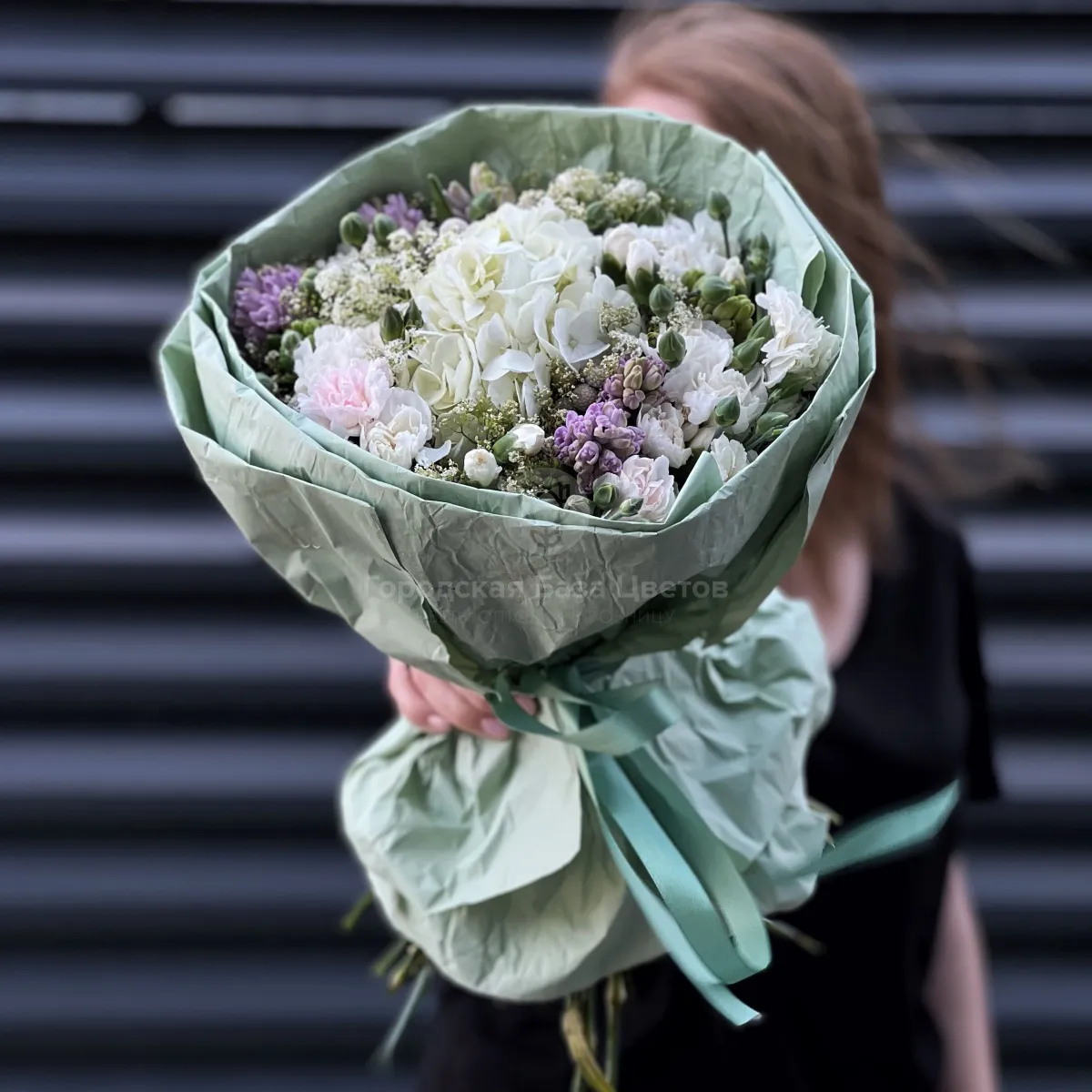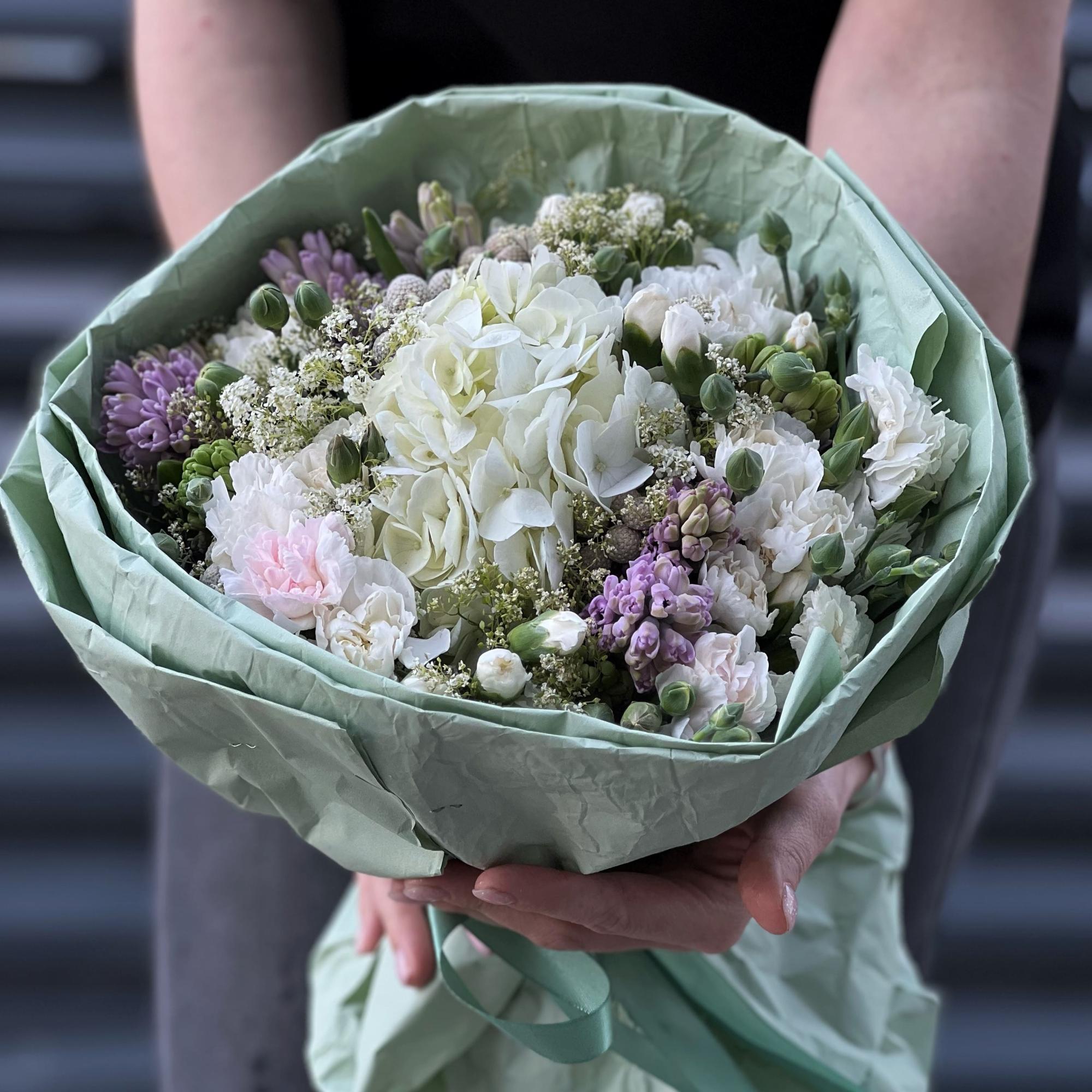 Огромный букет из гвоздик, гипсофил и гиацинтов