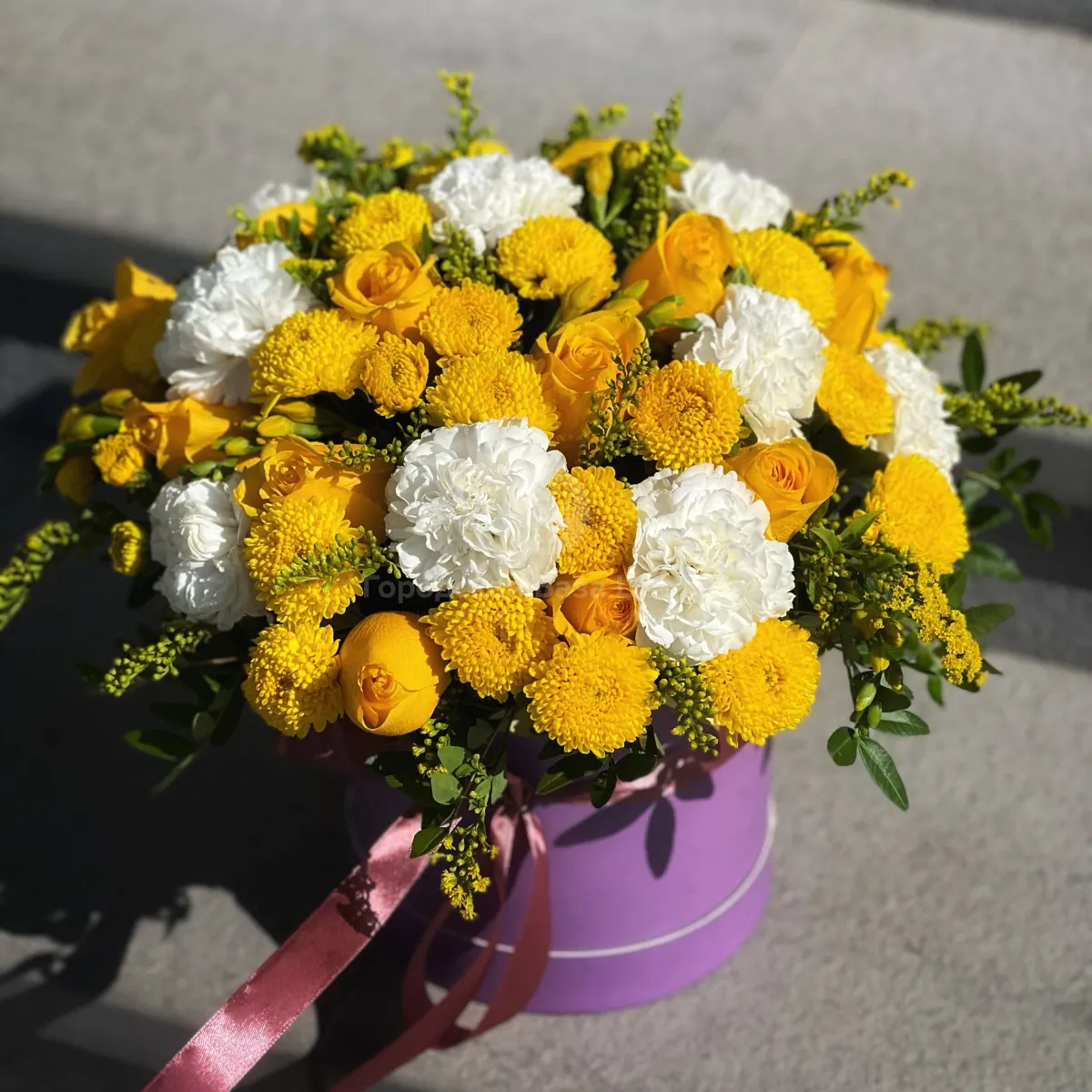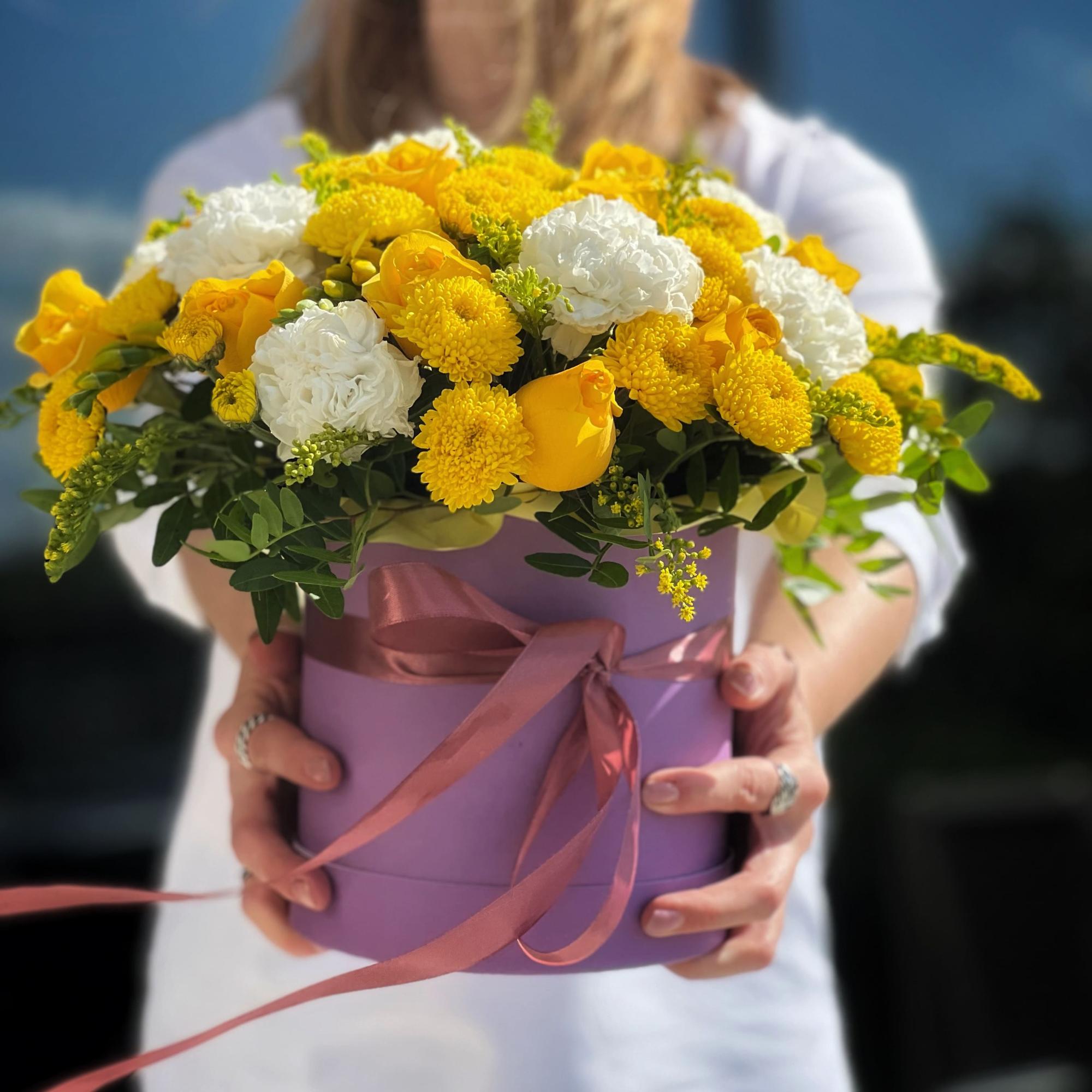 Гвоздики, розы и хризантемы в коробке