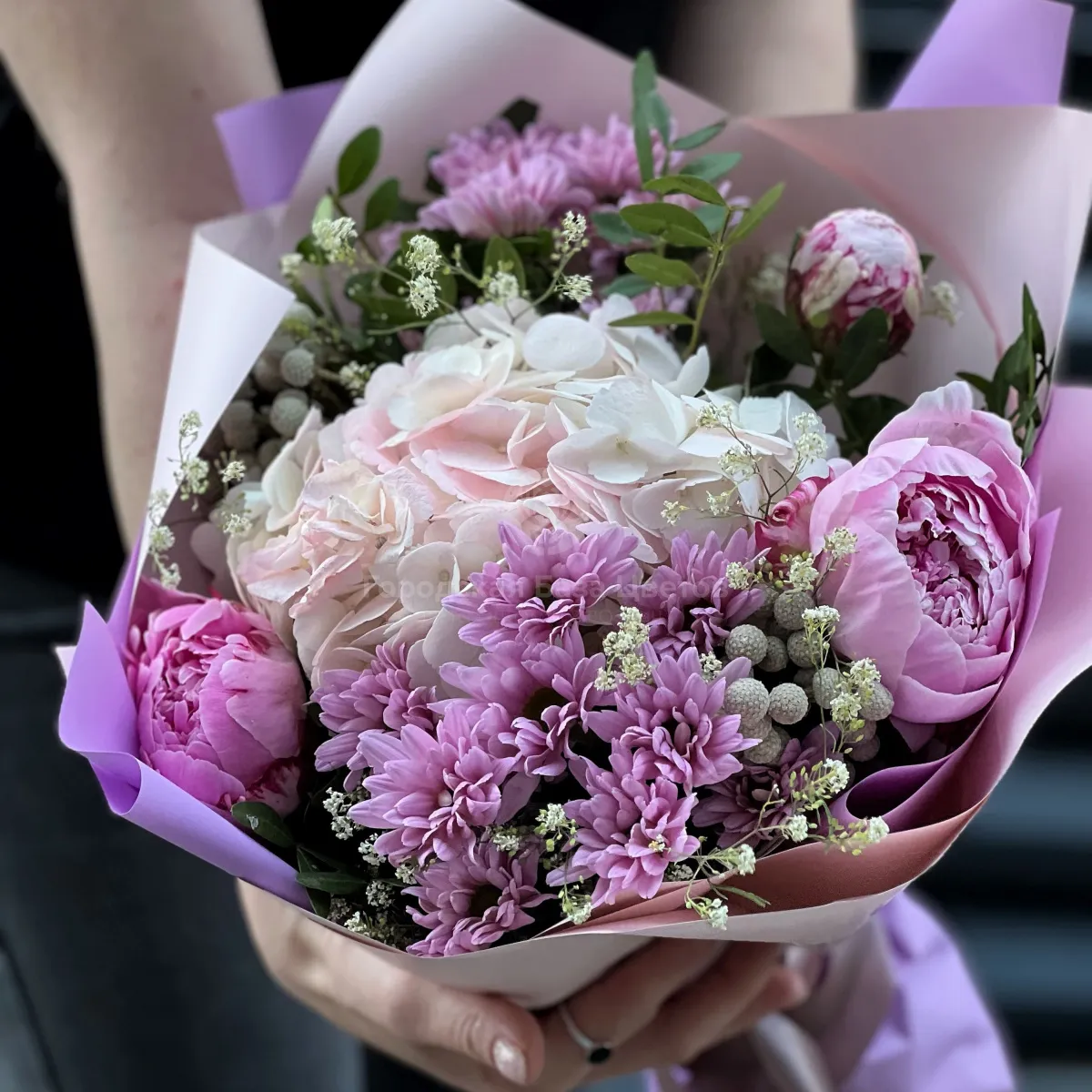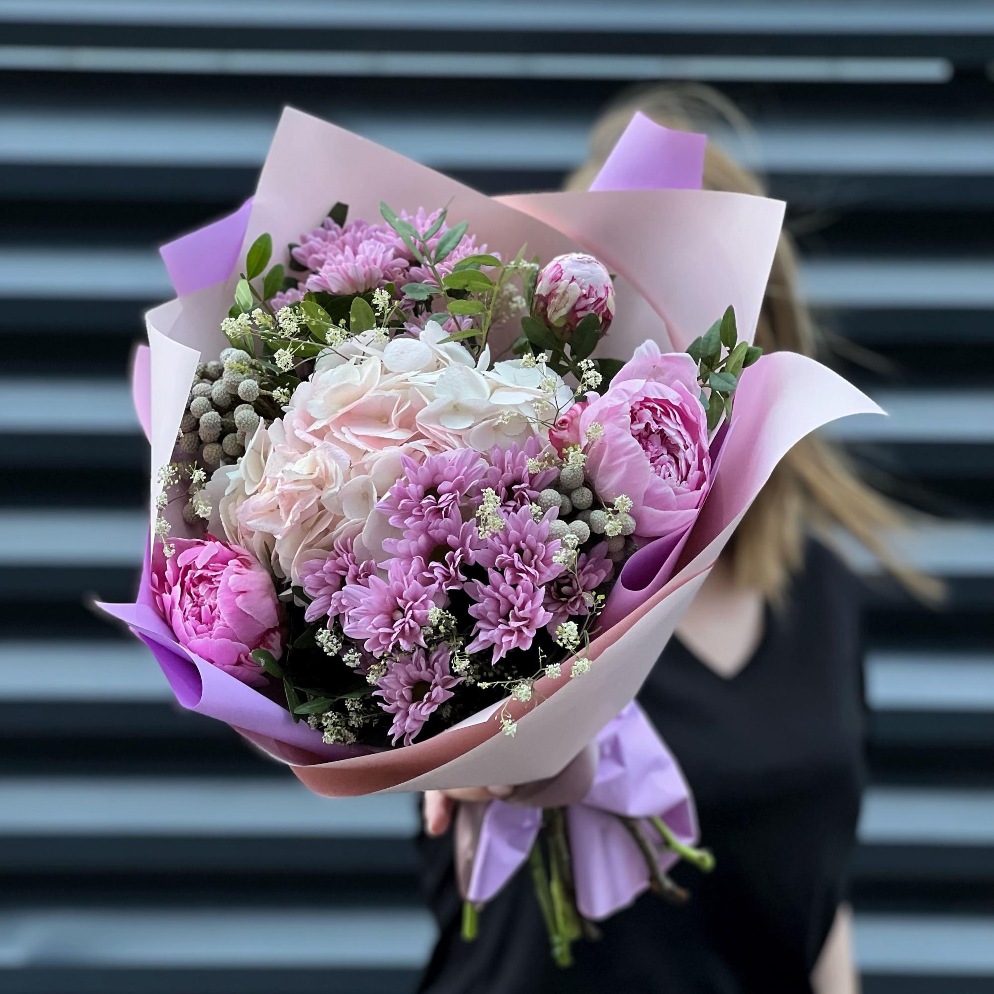 Огромный букет из хризантем и брунии