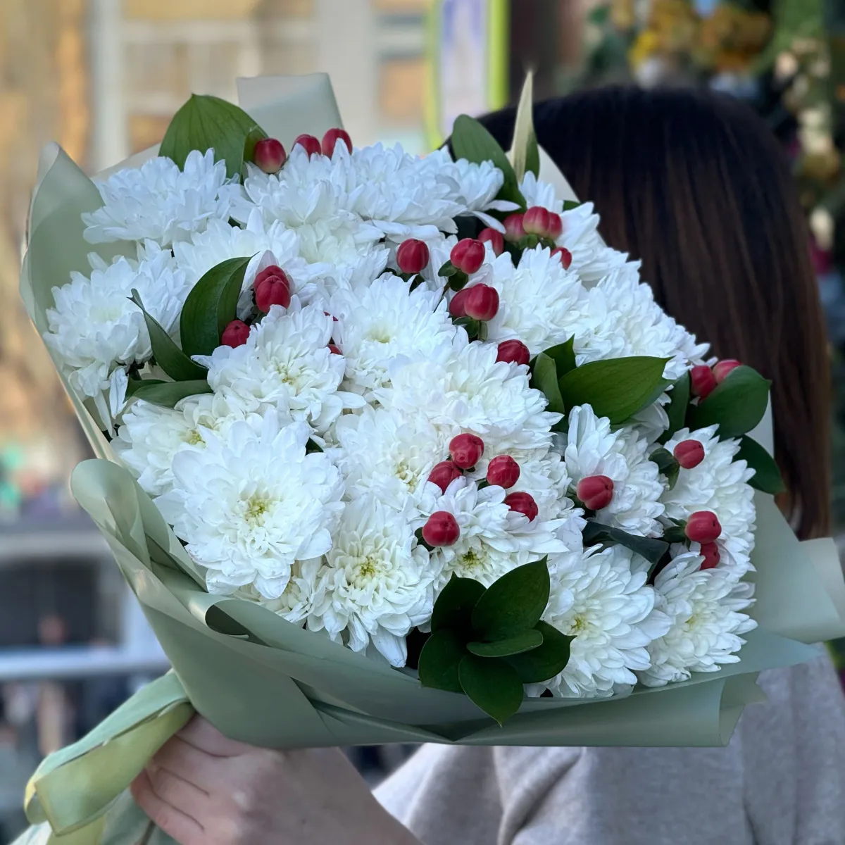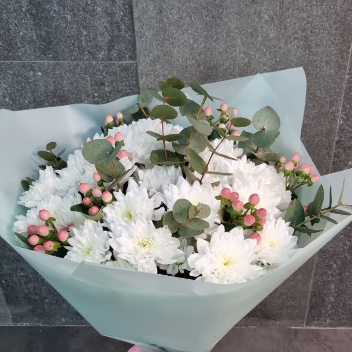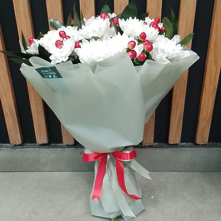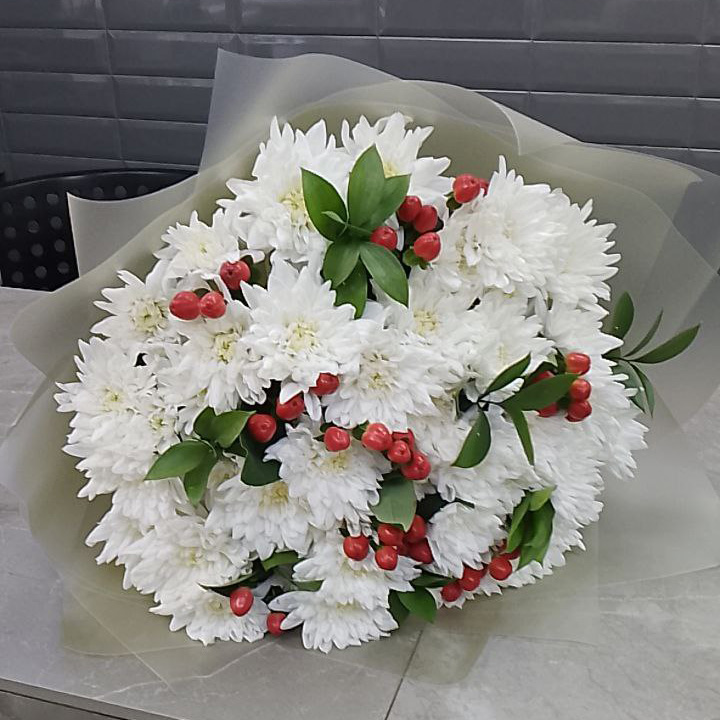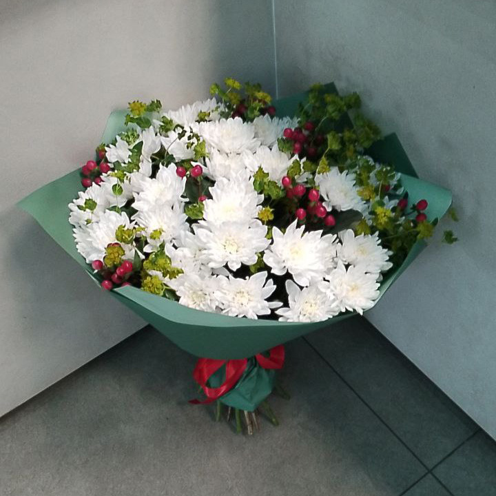 Букет из хризантем и гиперикума