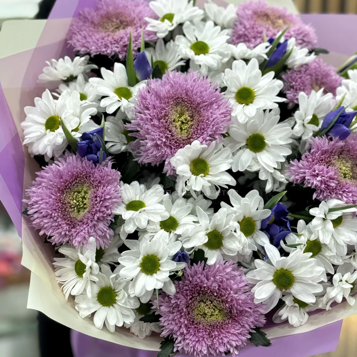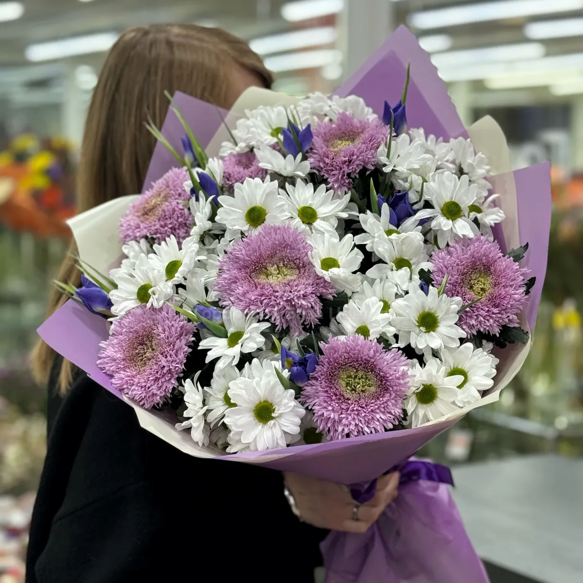 Большой букет из хризантем и ирисов
