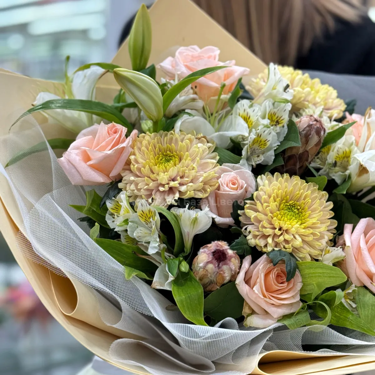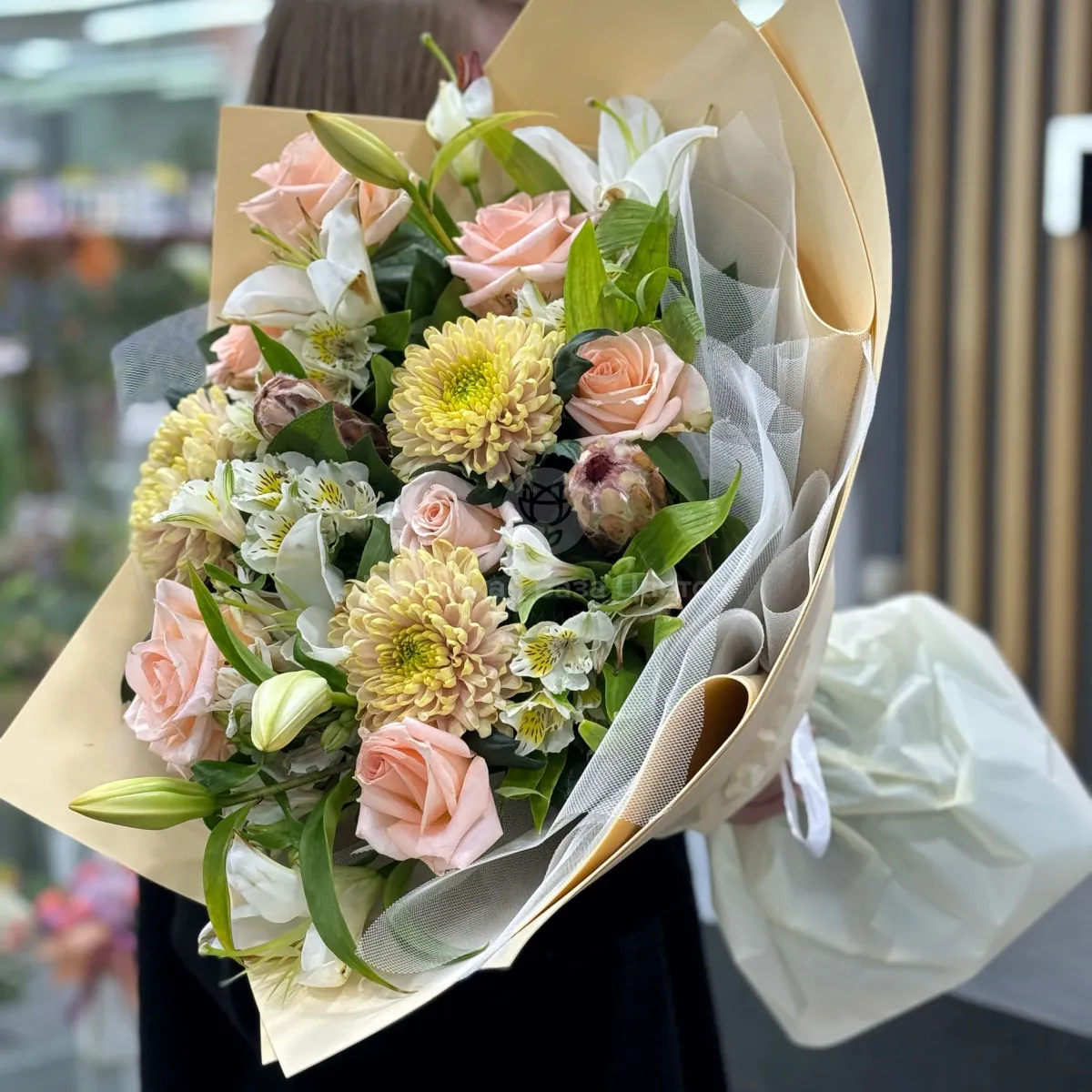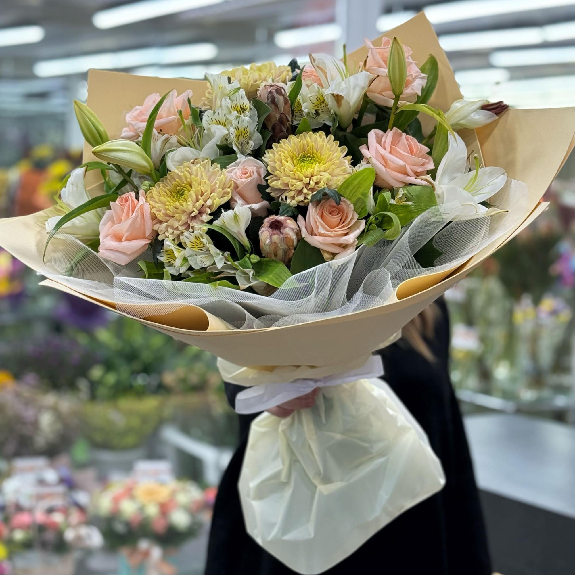 Огромный букет из хризантем, роз и альстромерии