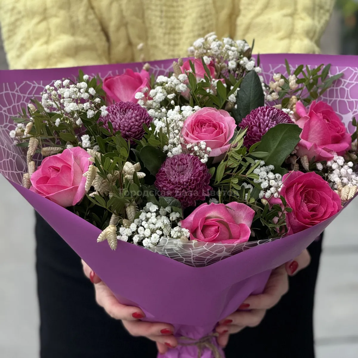 Букет из хризантем, роз и гипсофил