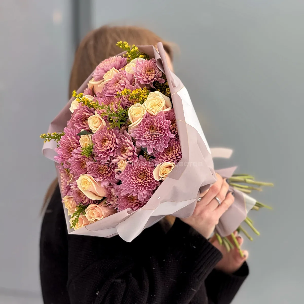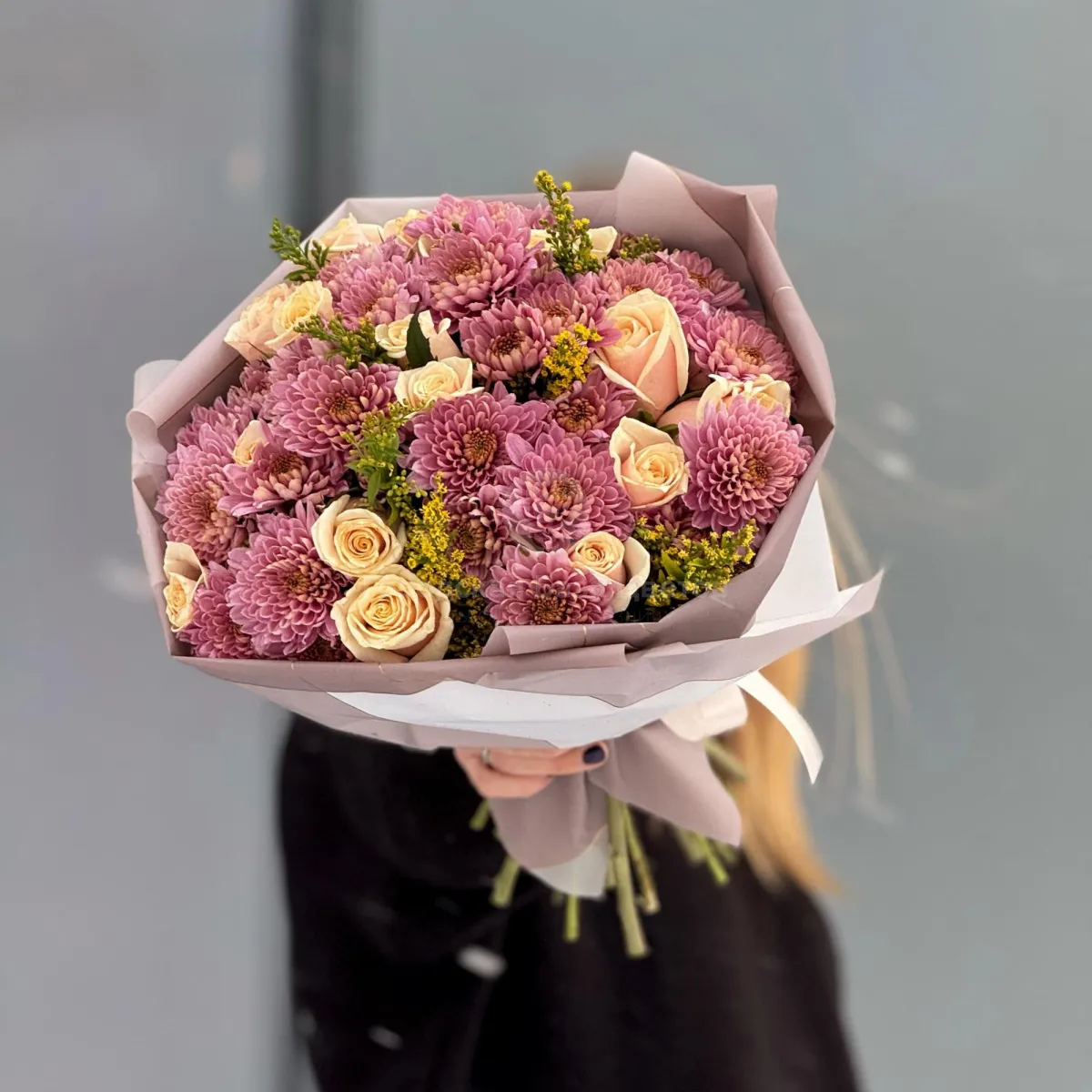 Огромный букет из хризантем, роз и солидаго