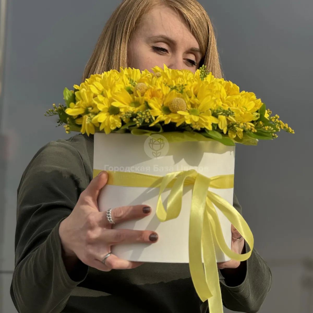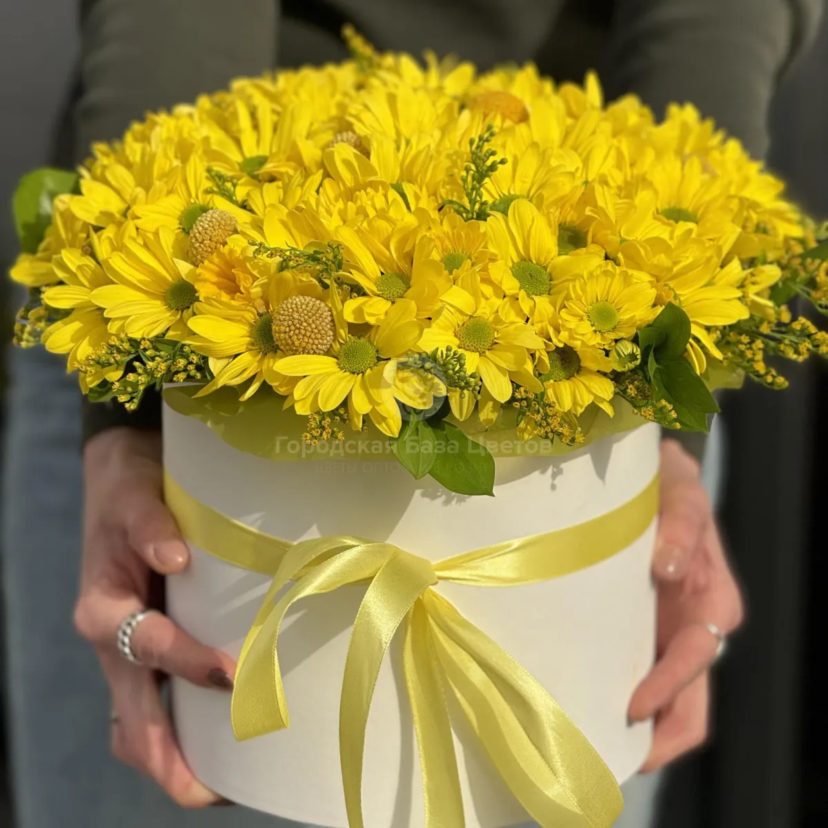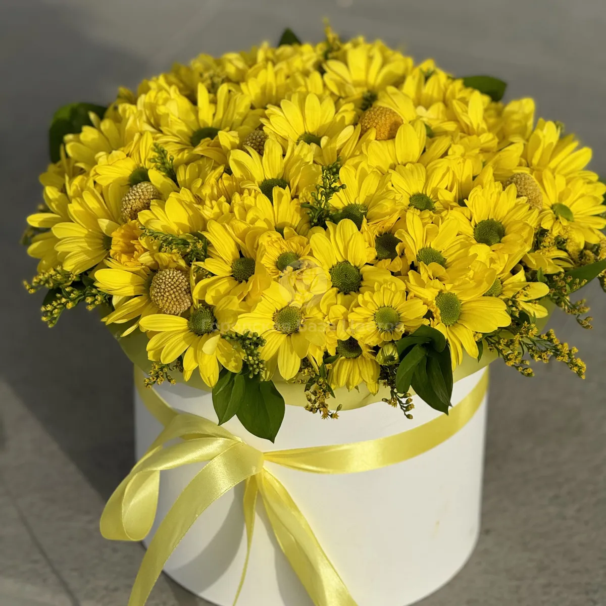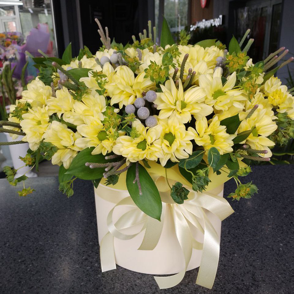 Хризантемы, солидаго и краспедии в коробке