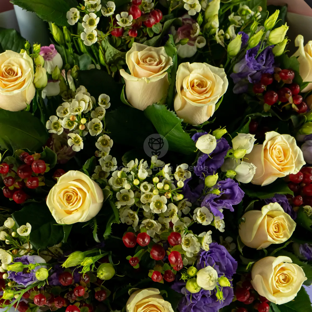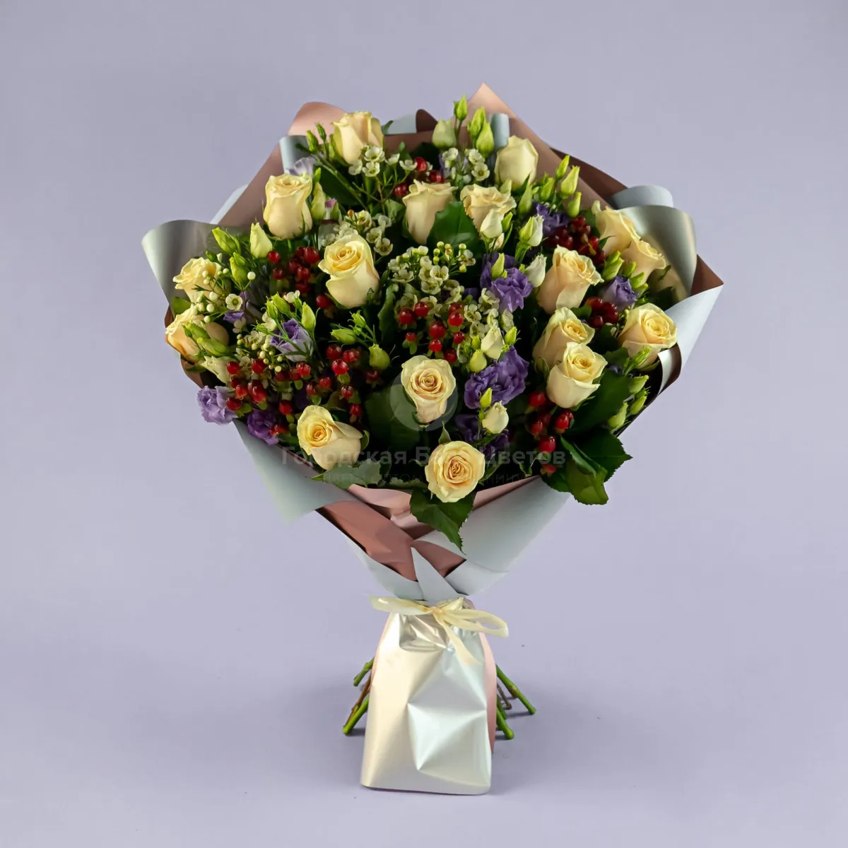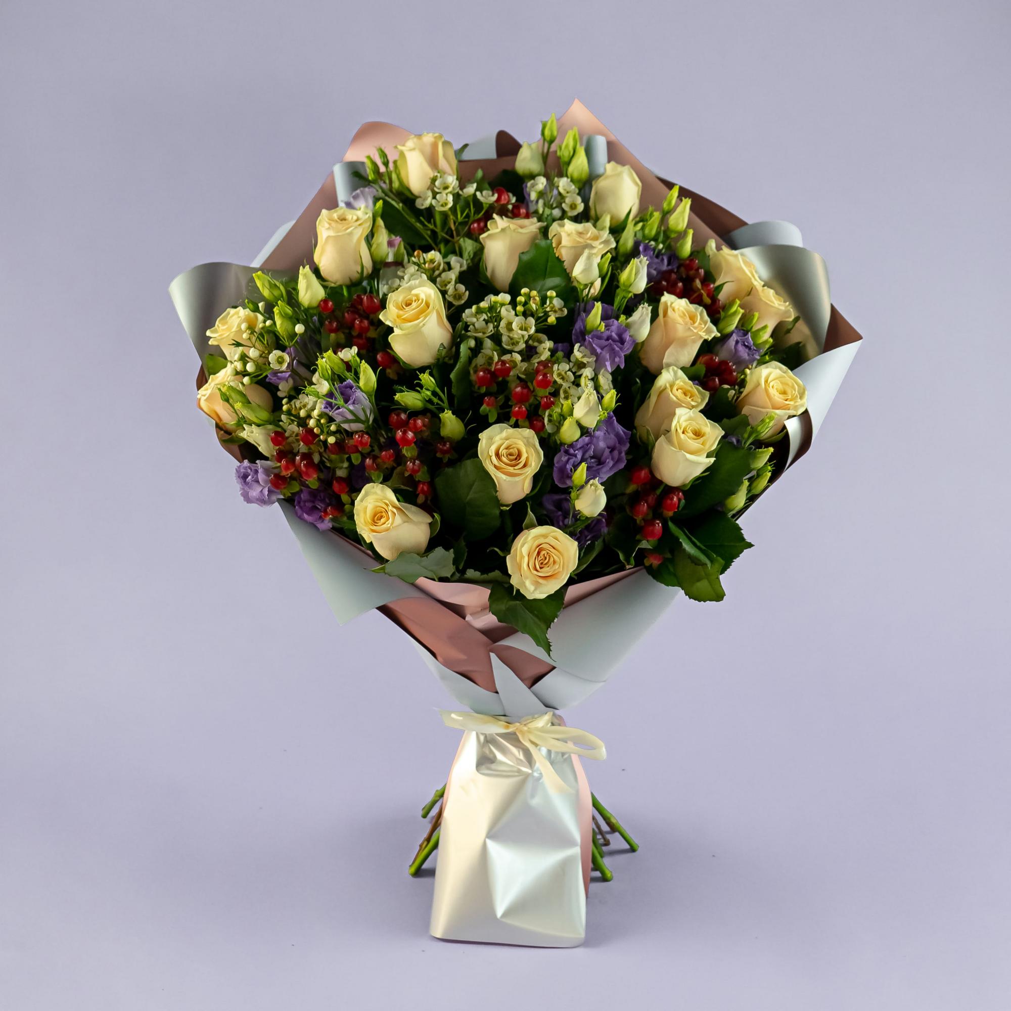 Букет из кремовых роз и эустом