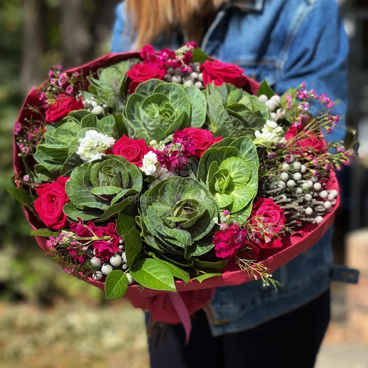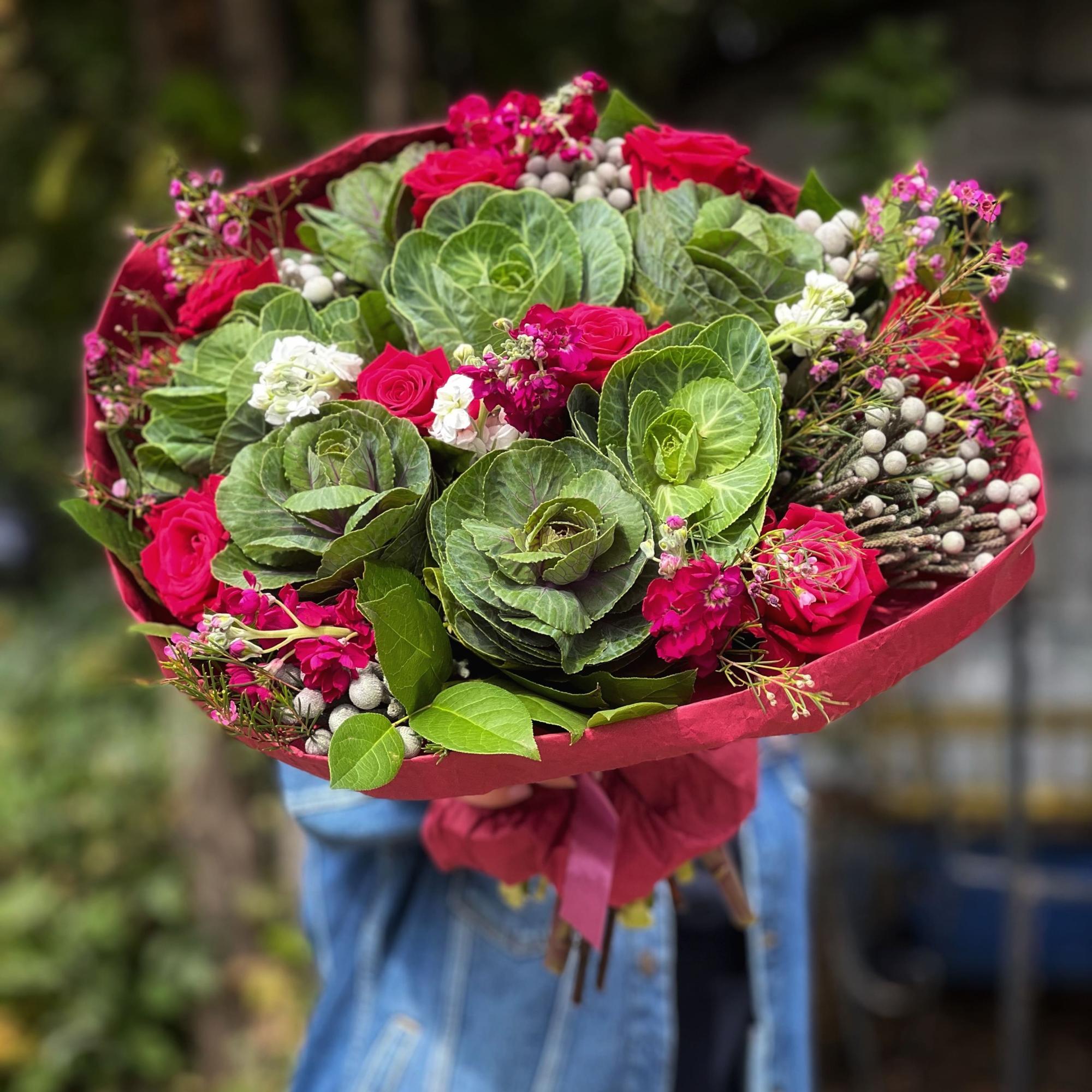 Огромный букет из роз, брасики и брунии