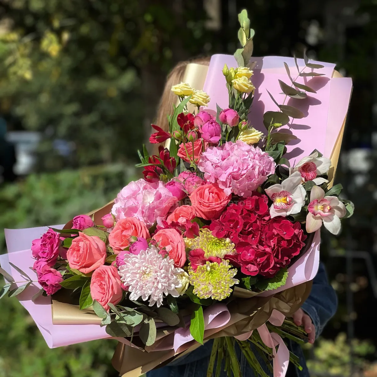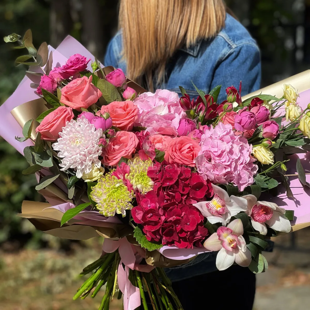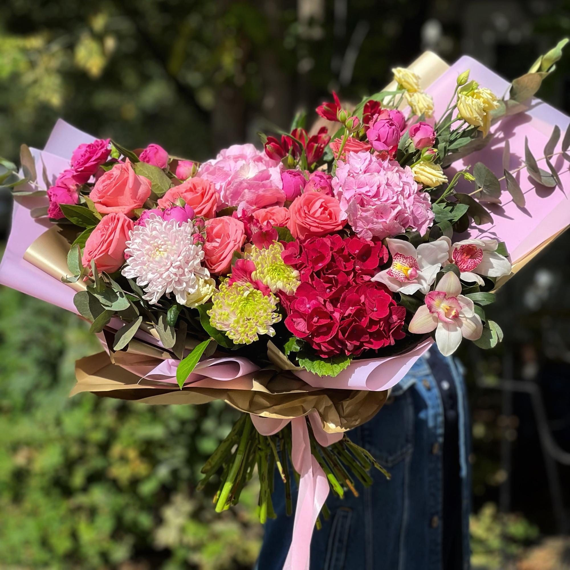 Огромный букет из роз, эустом и альстромерии