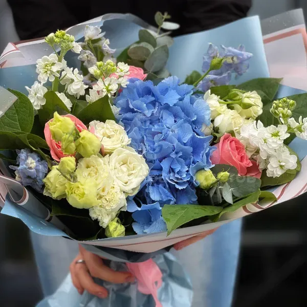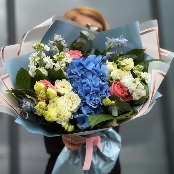 Большой букет из роз, эустом и гортензии