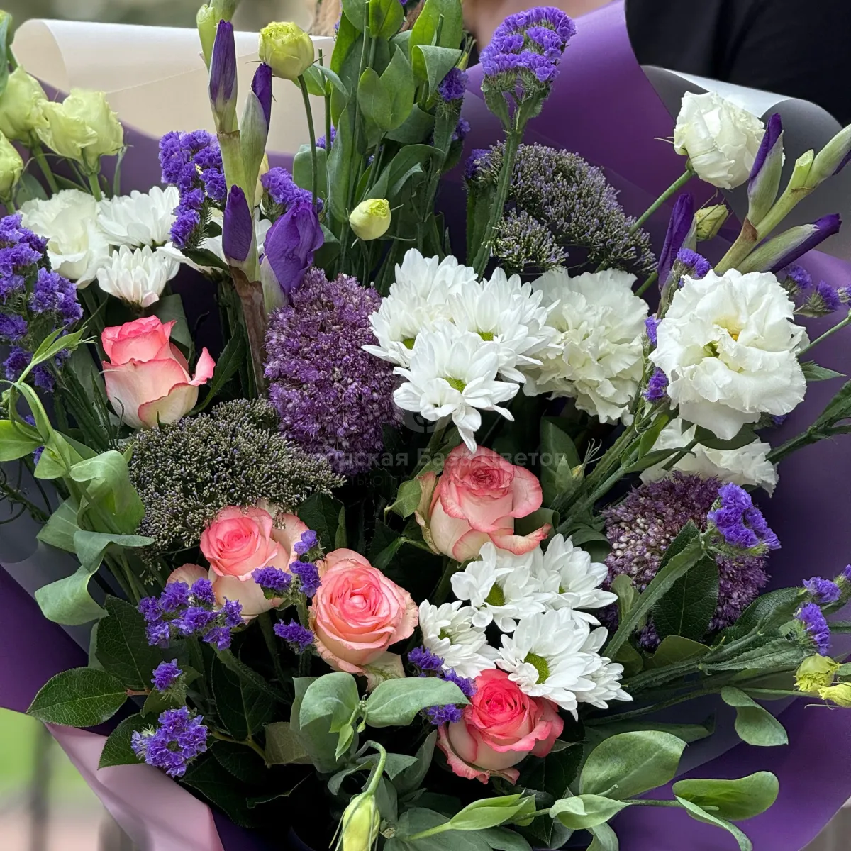 Огромный букет из роз, эустом и хризантем
