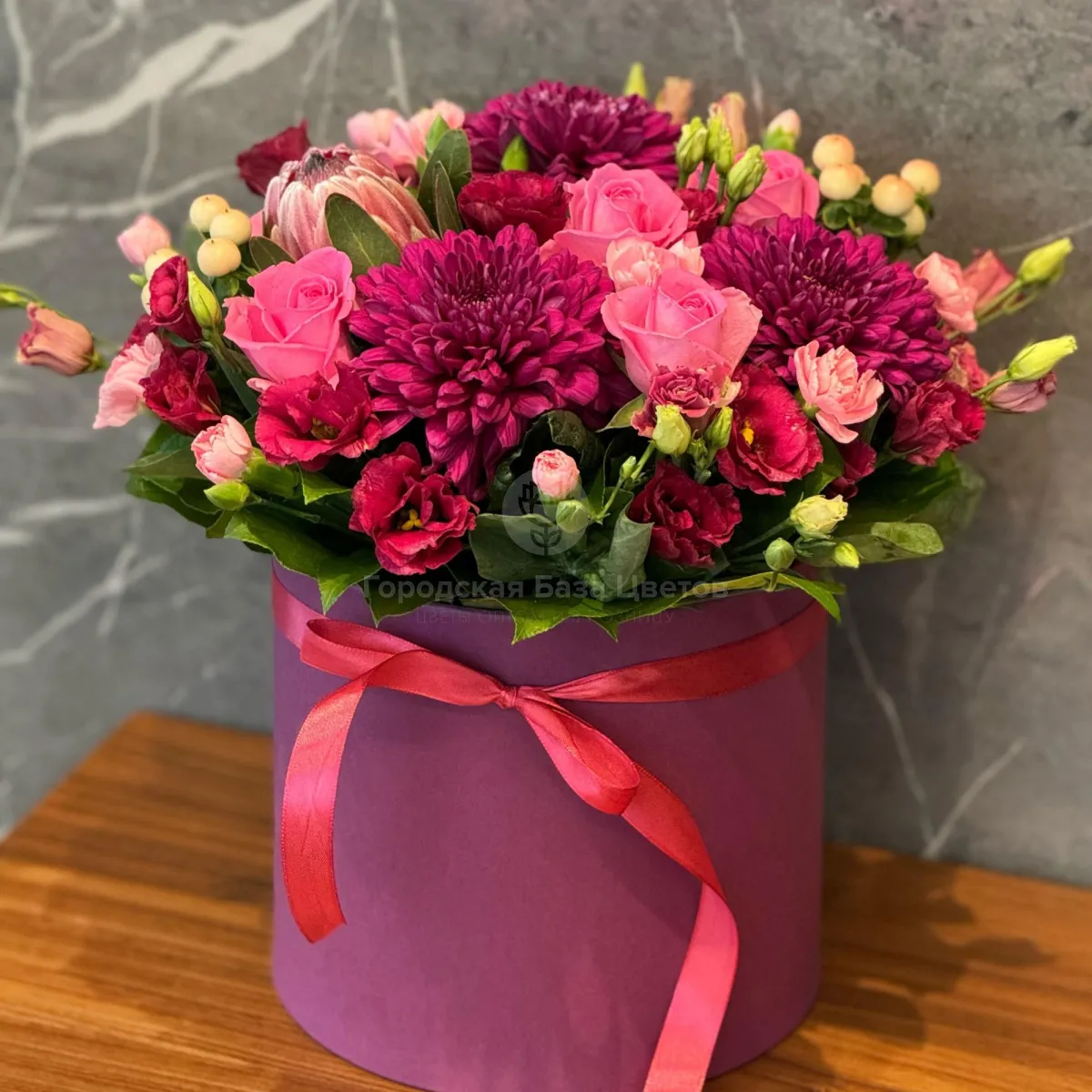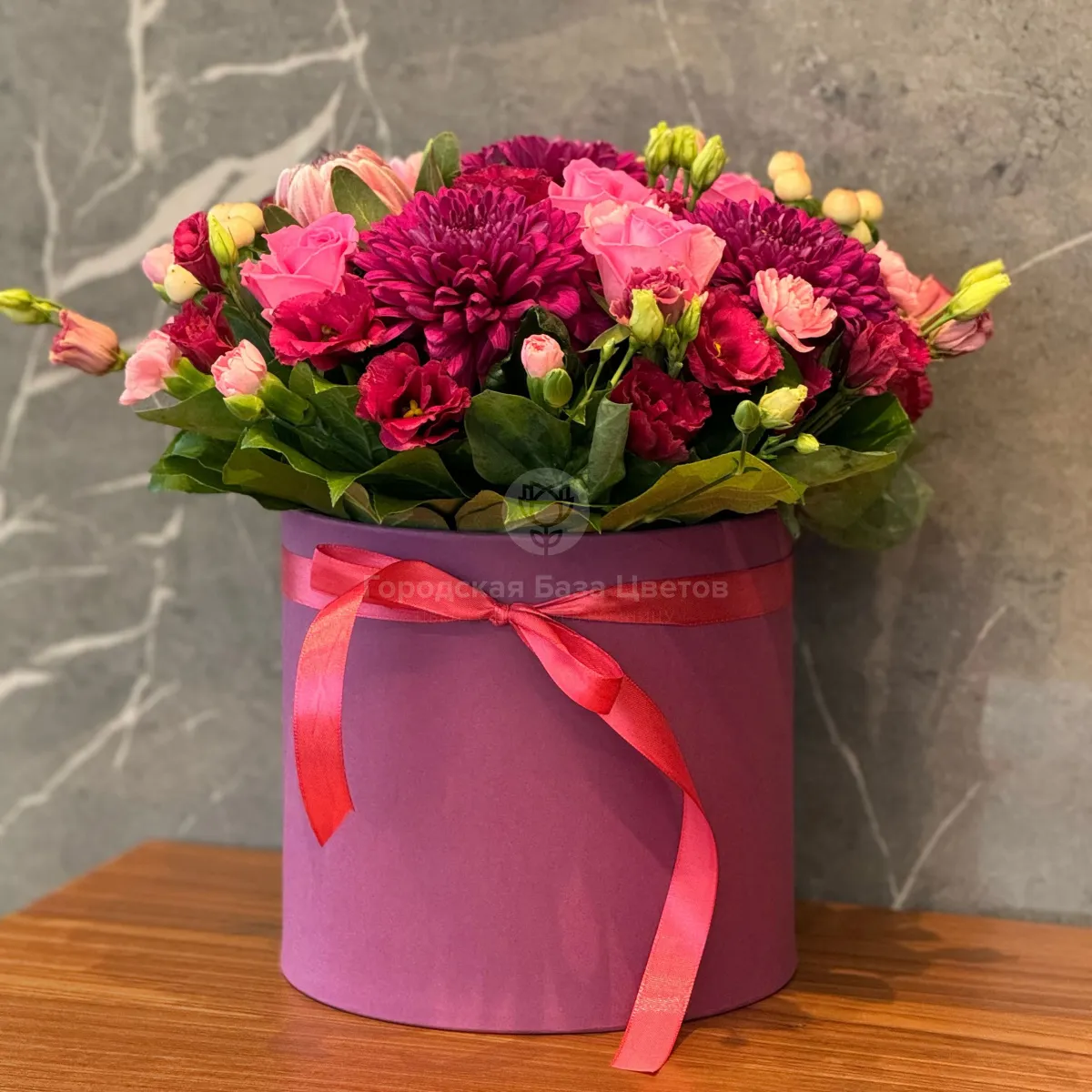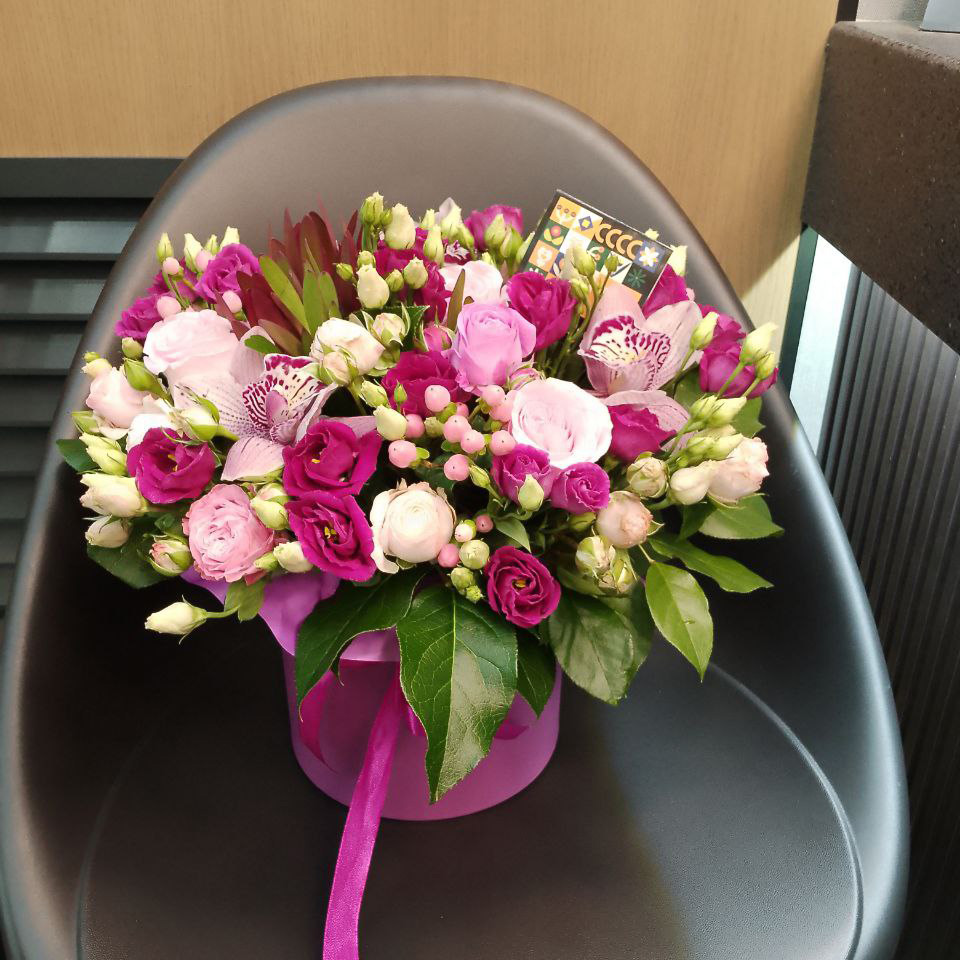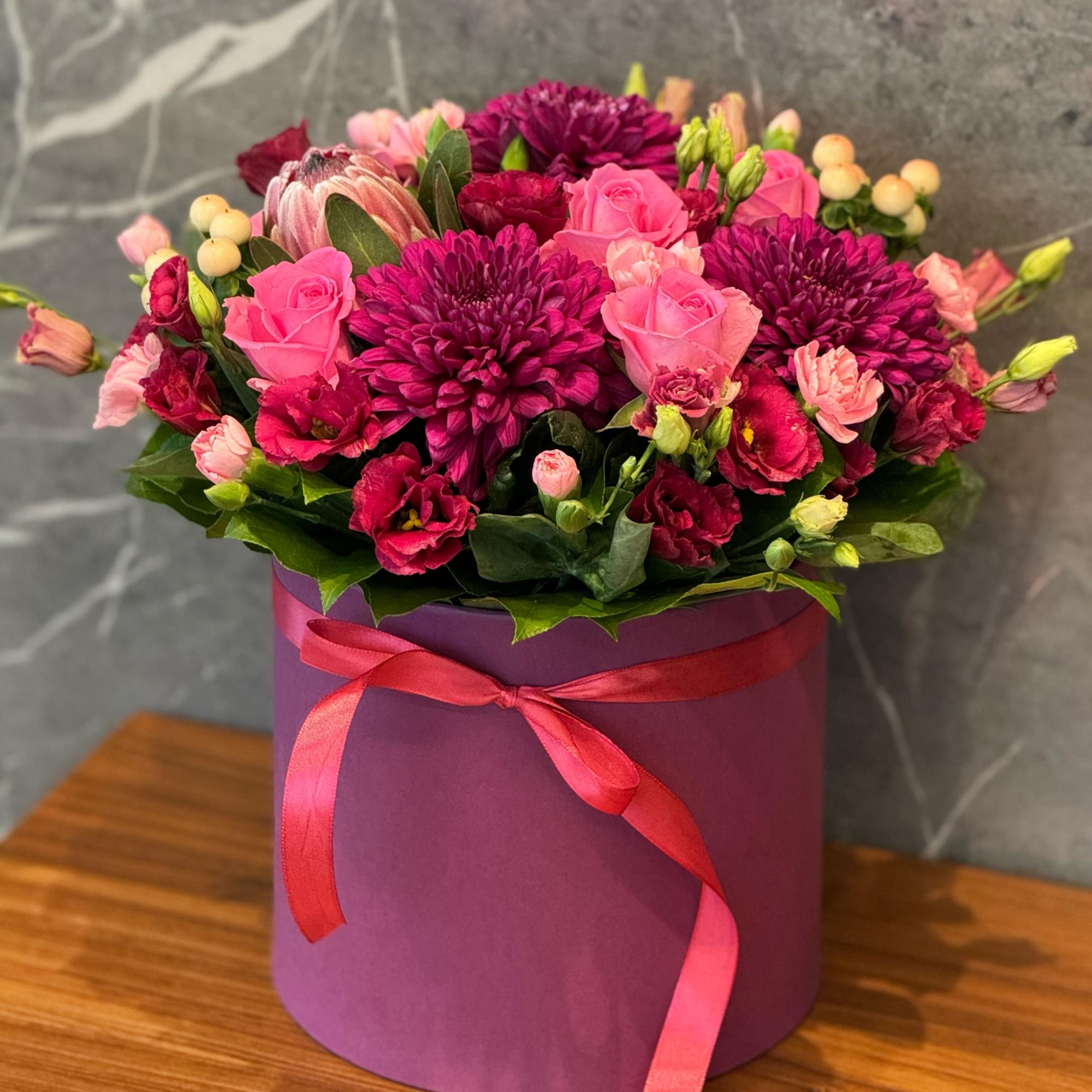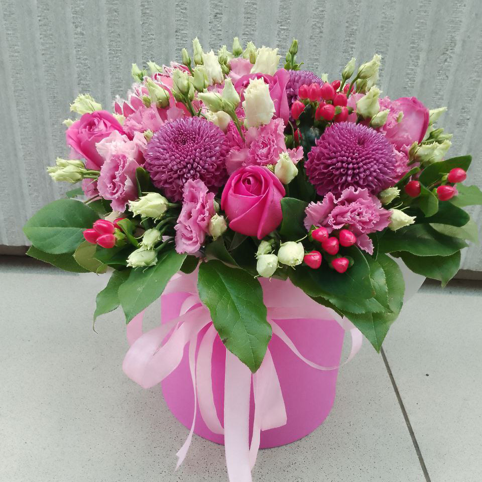 Розы, эустомы и хризантемы в коробке