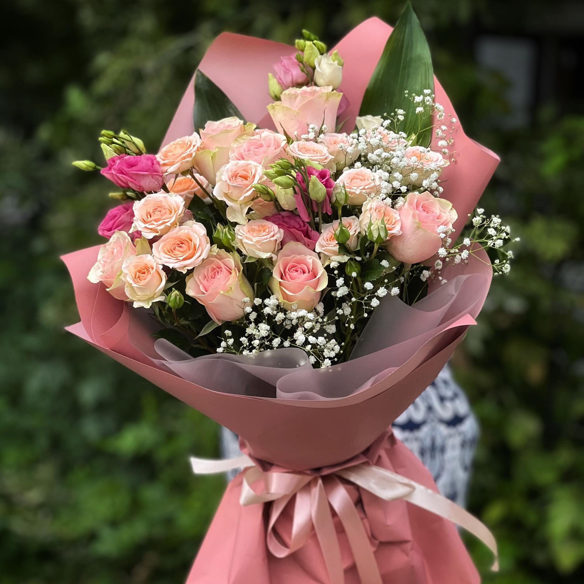 Огромный букет из роз и эустом микс (50 см)