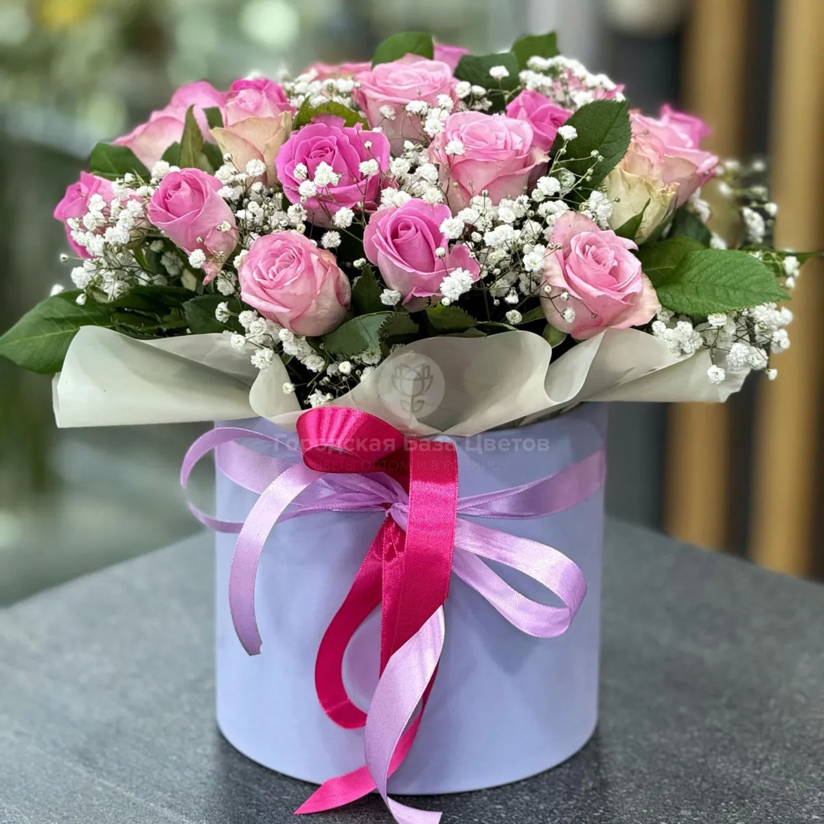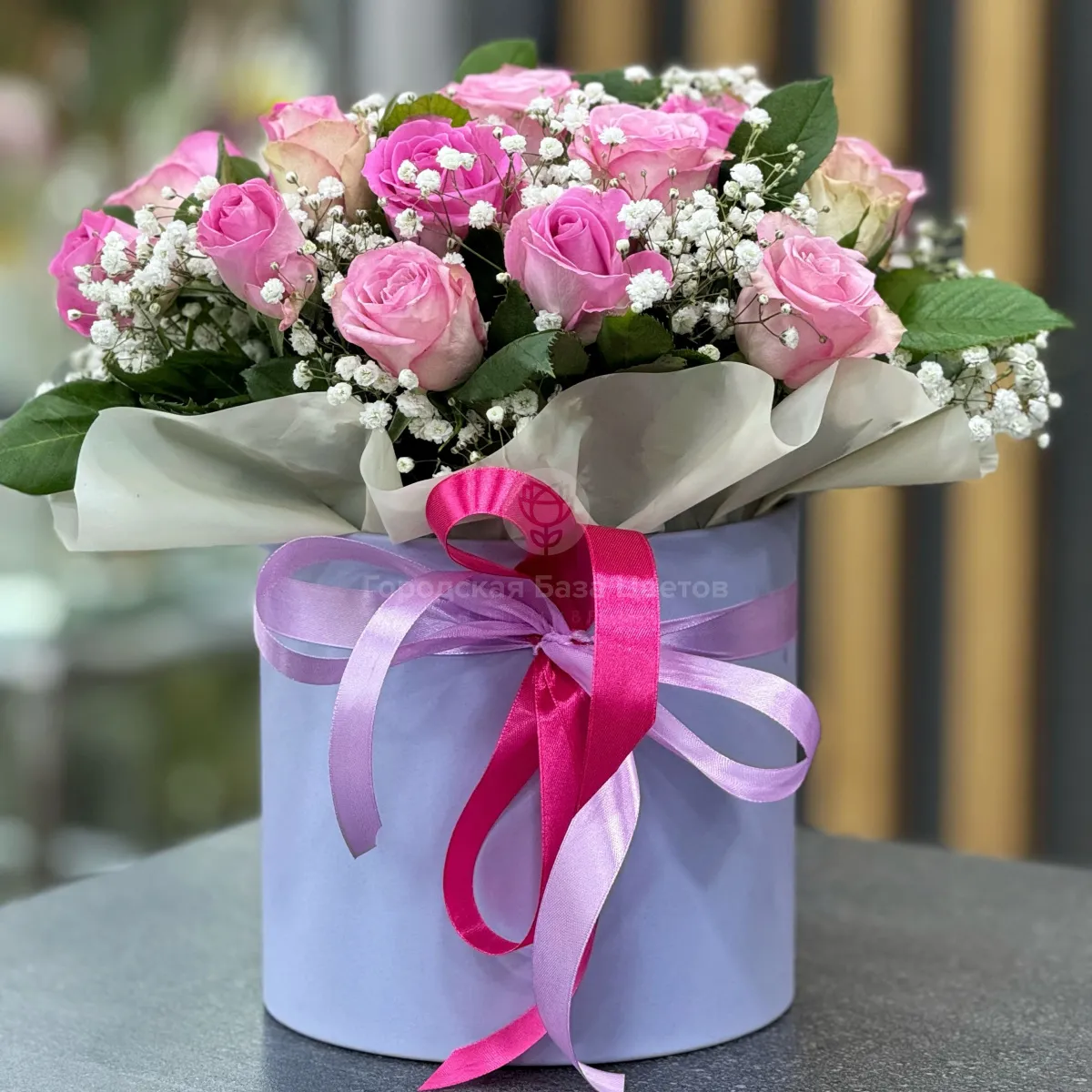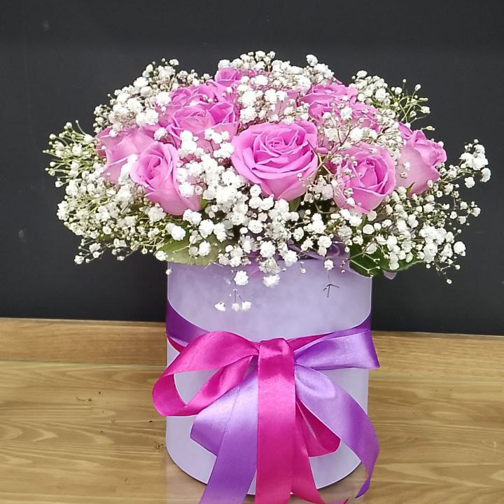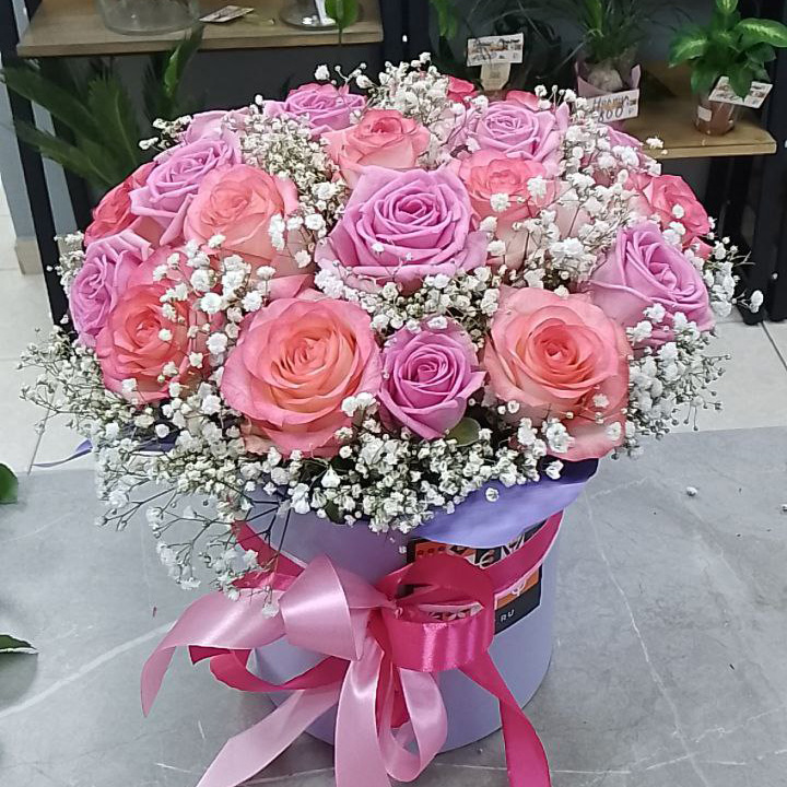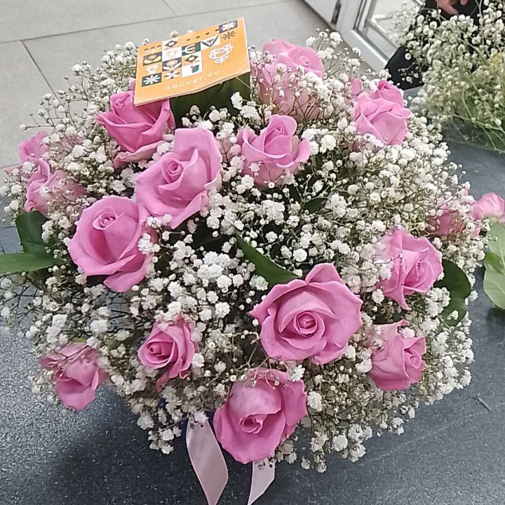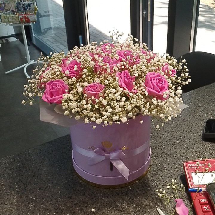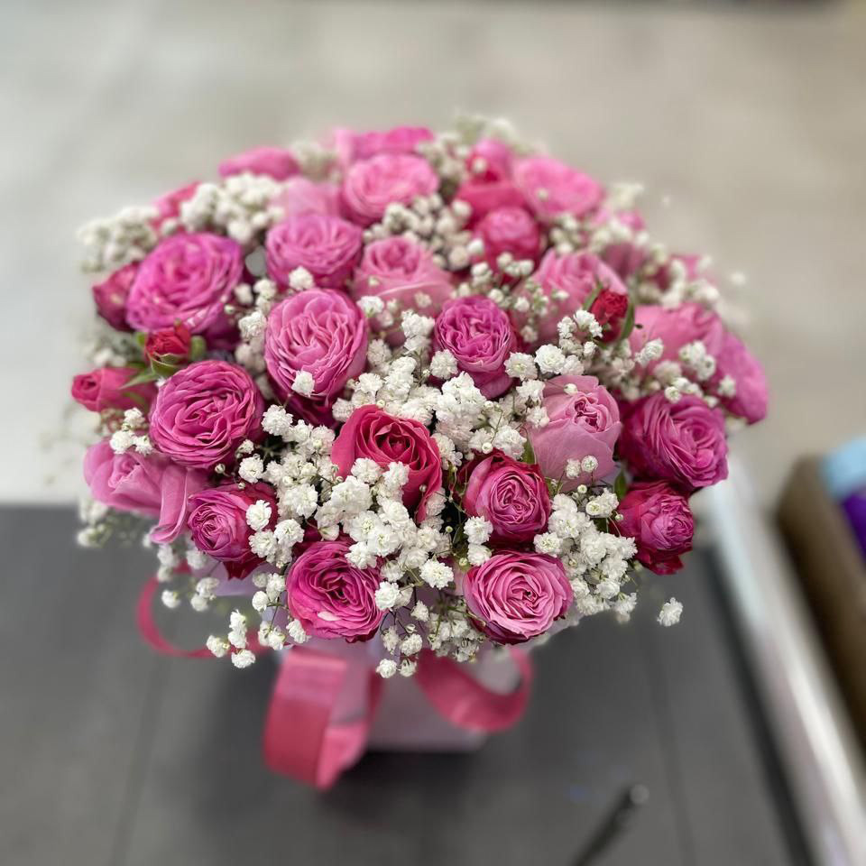 Розы и гипсофил в коробке