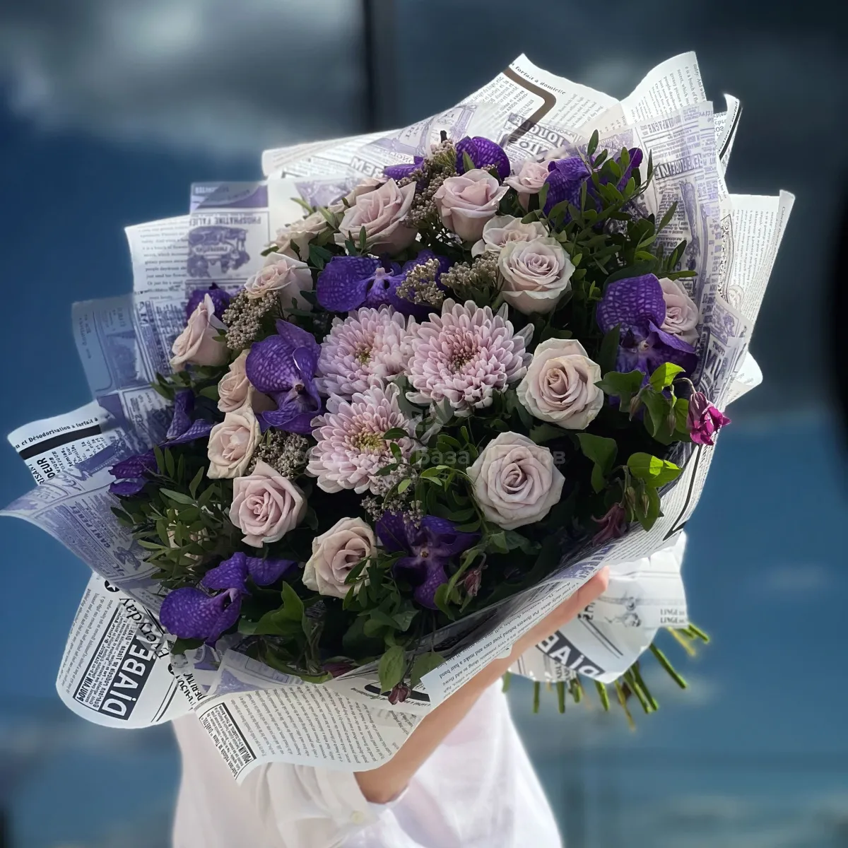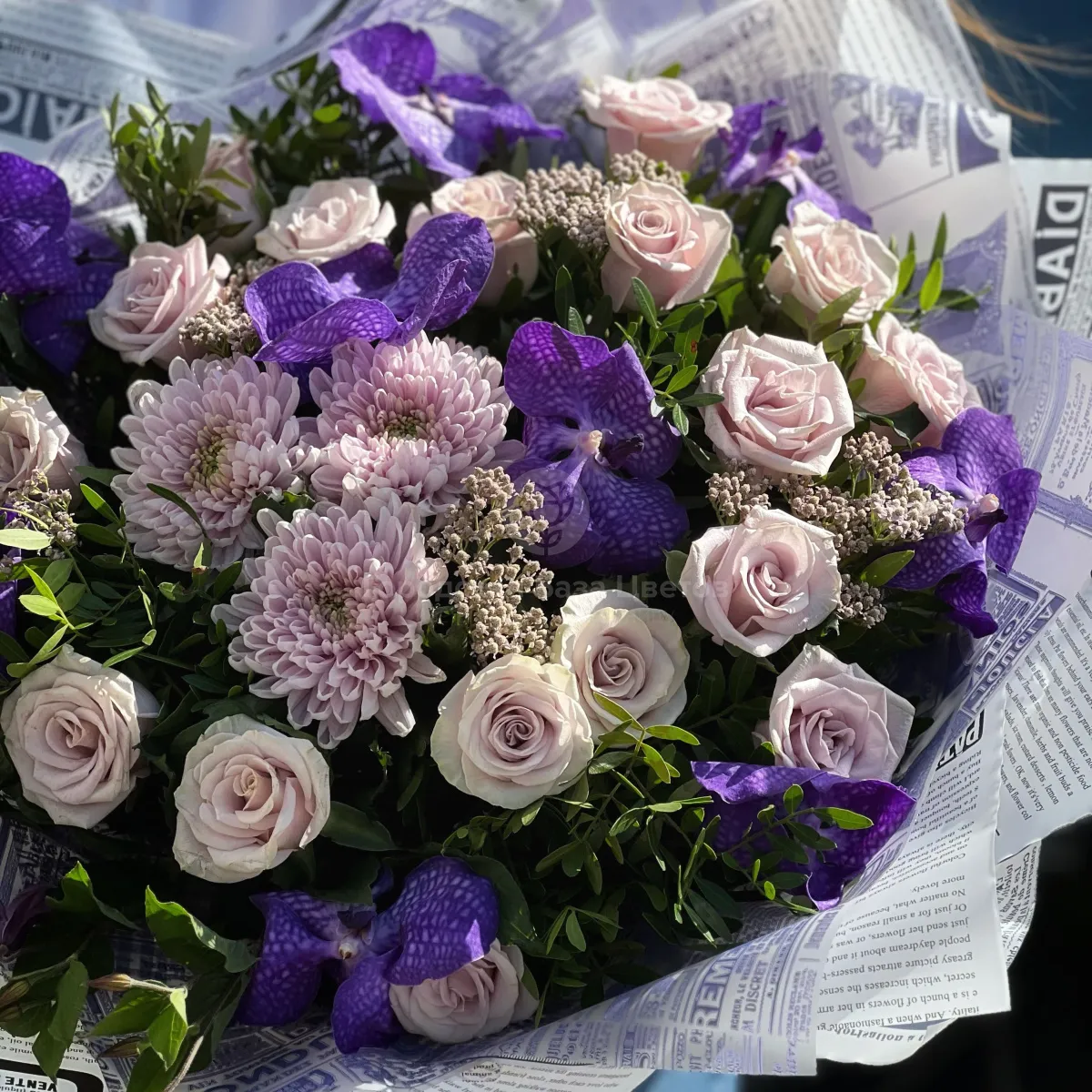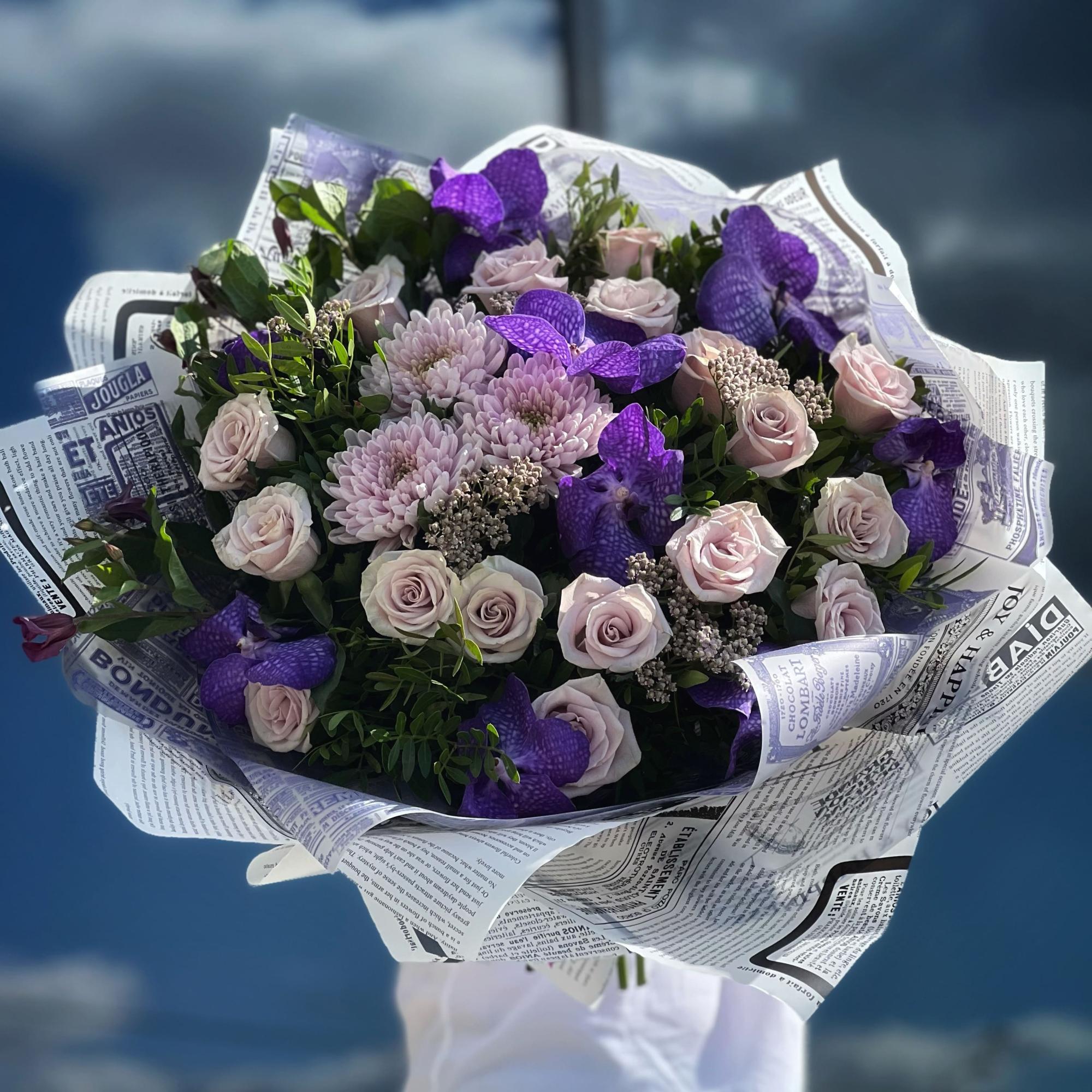 Букет из роз, хризантем и ахилея
