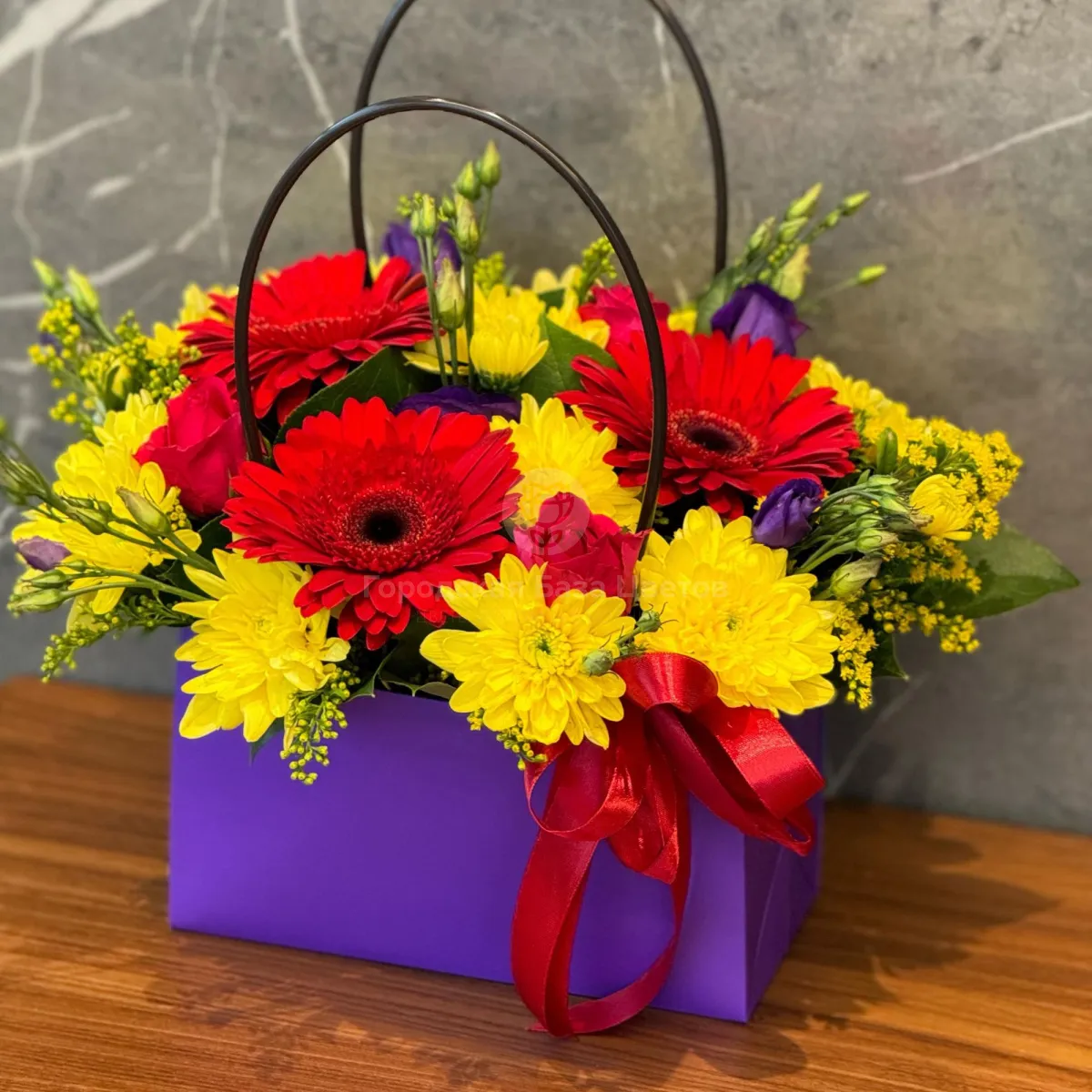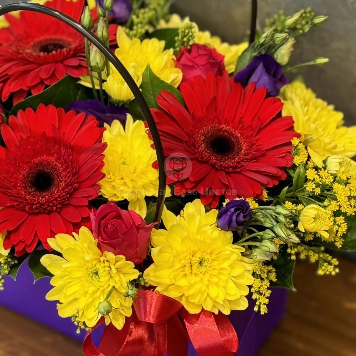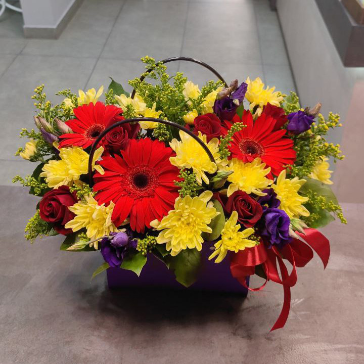 Розы, хризантемы и эустомы в коробке