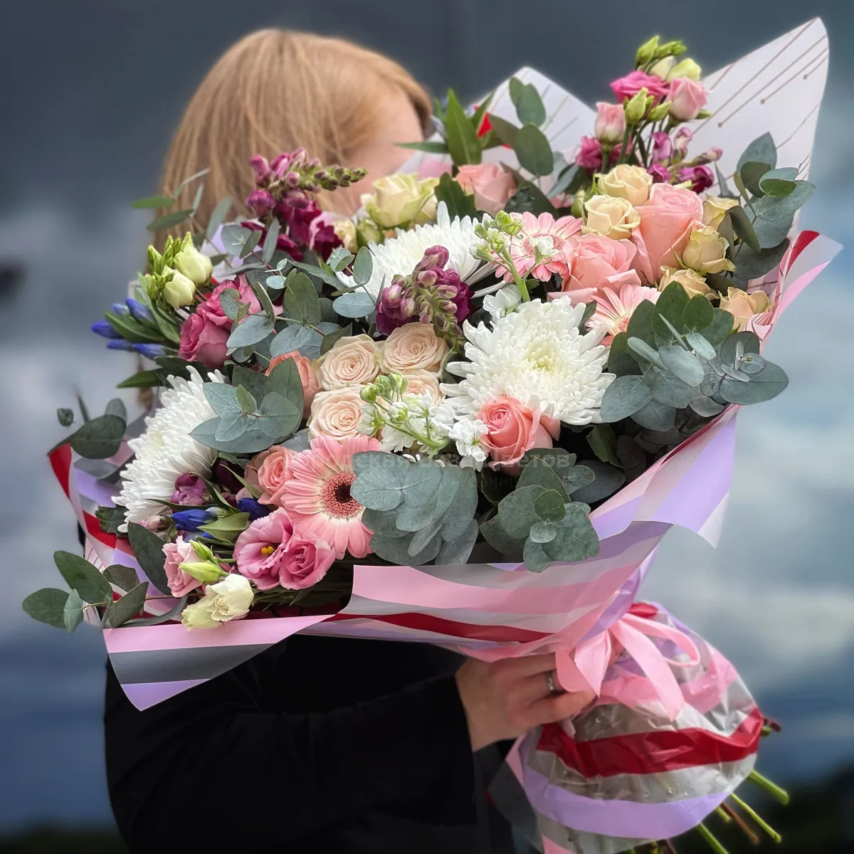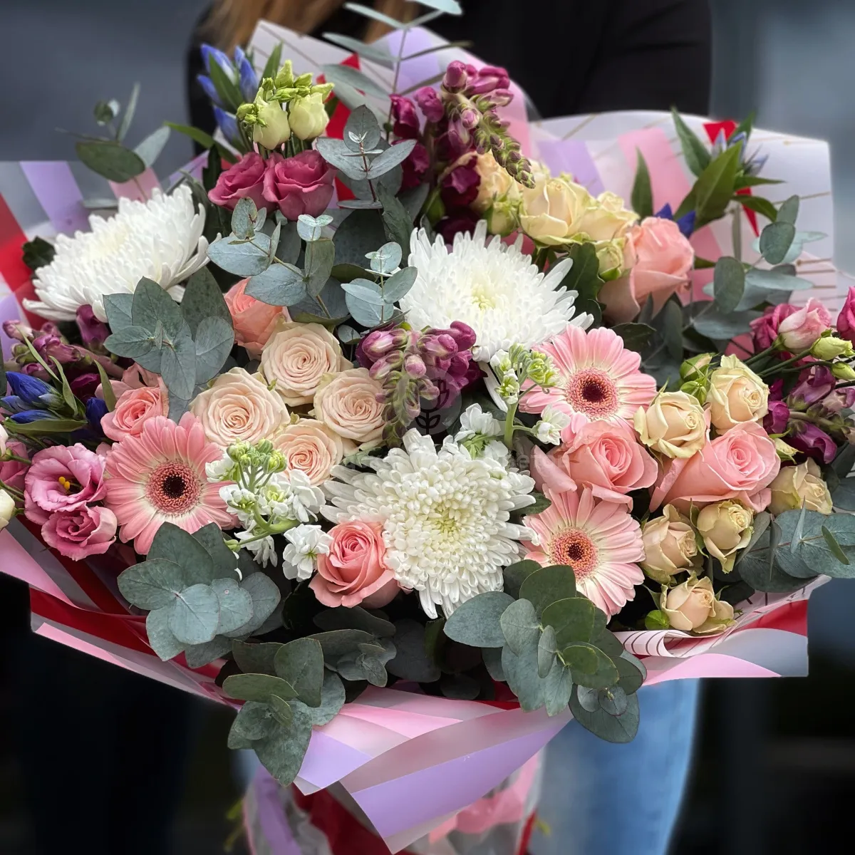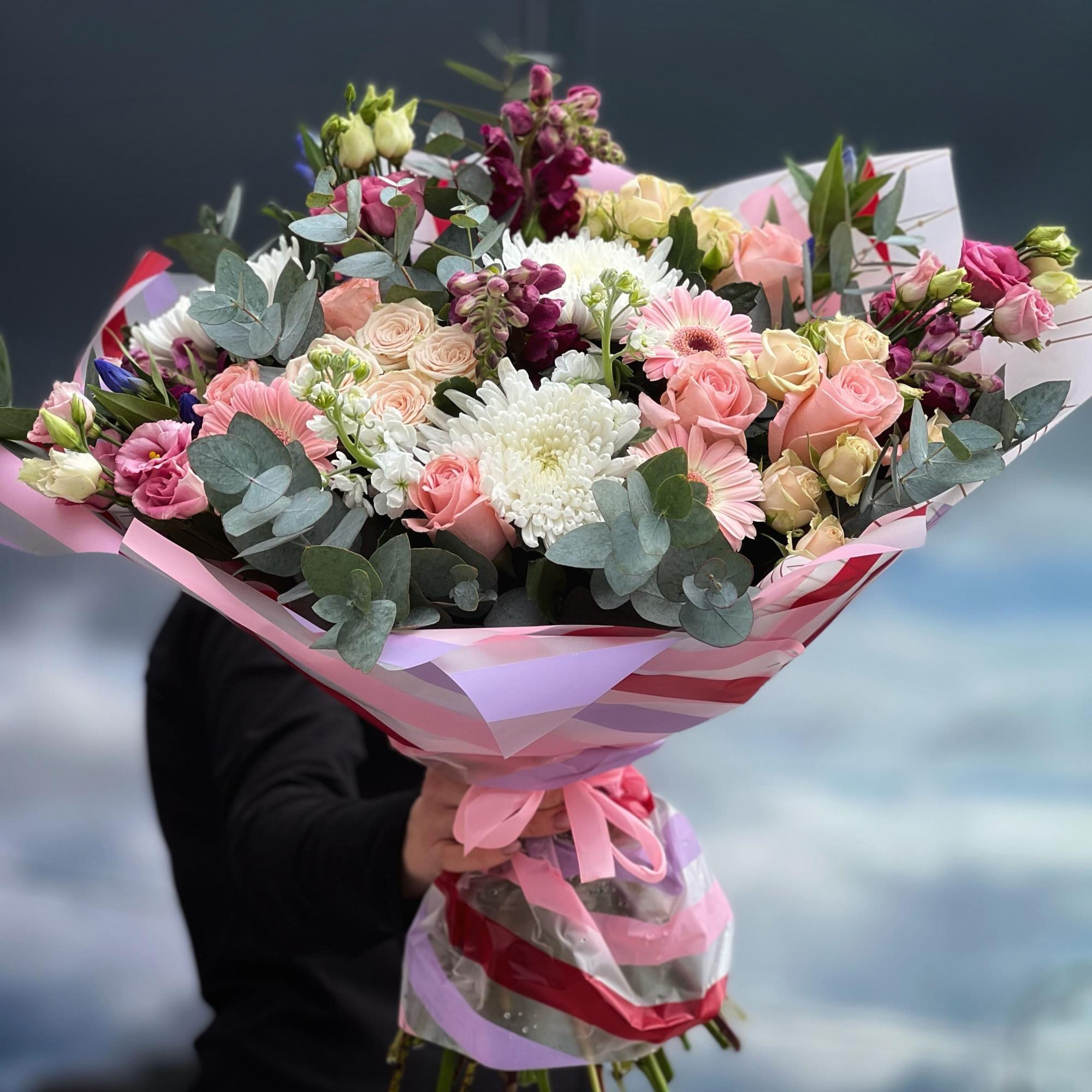 Огромный букет из роз, хризантем и эустома