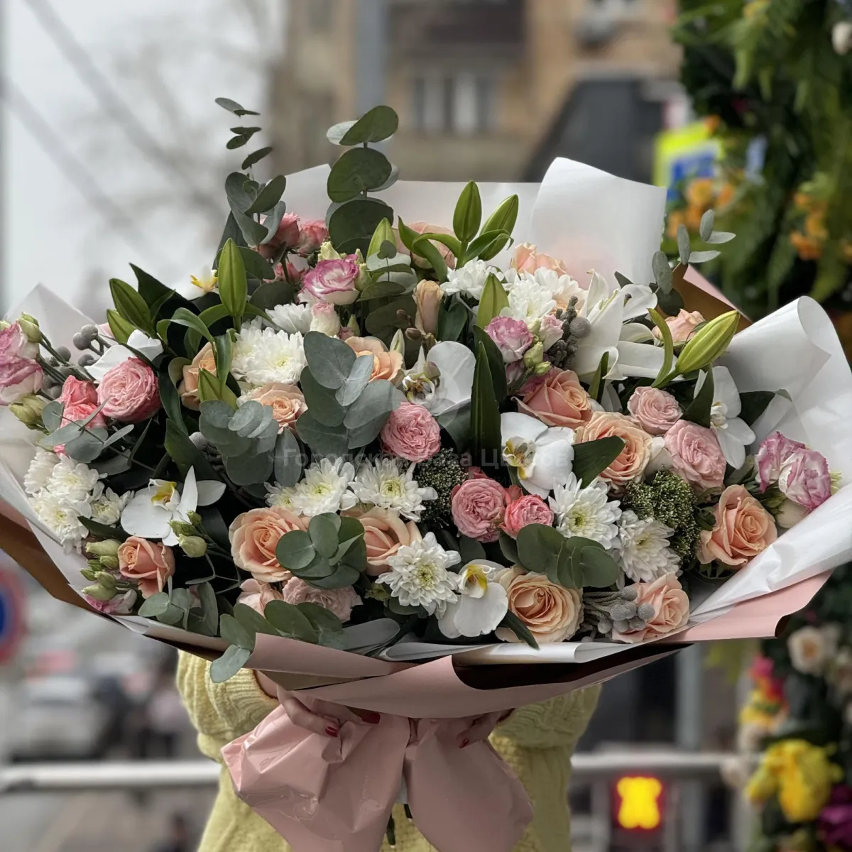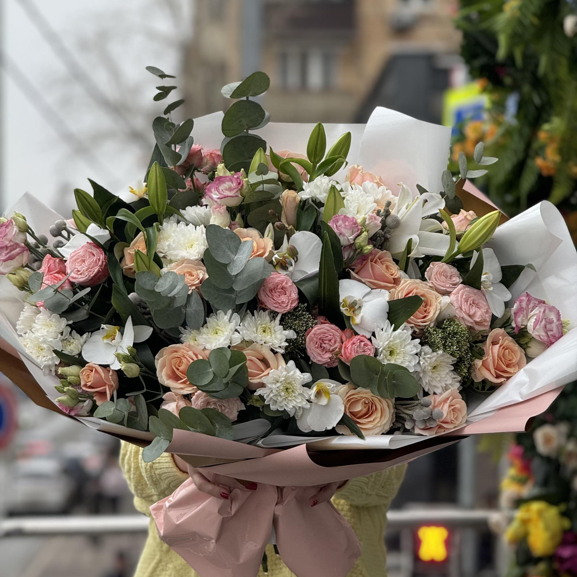 Букет из роз, хризантем и эустомы