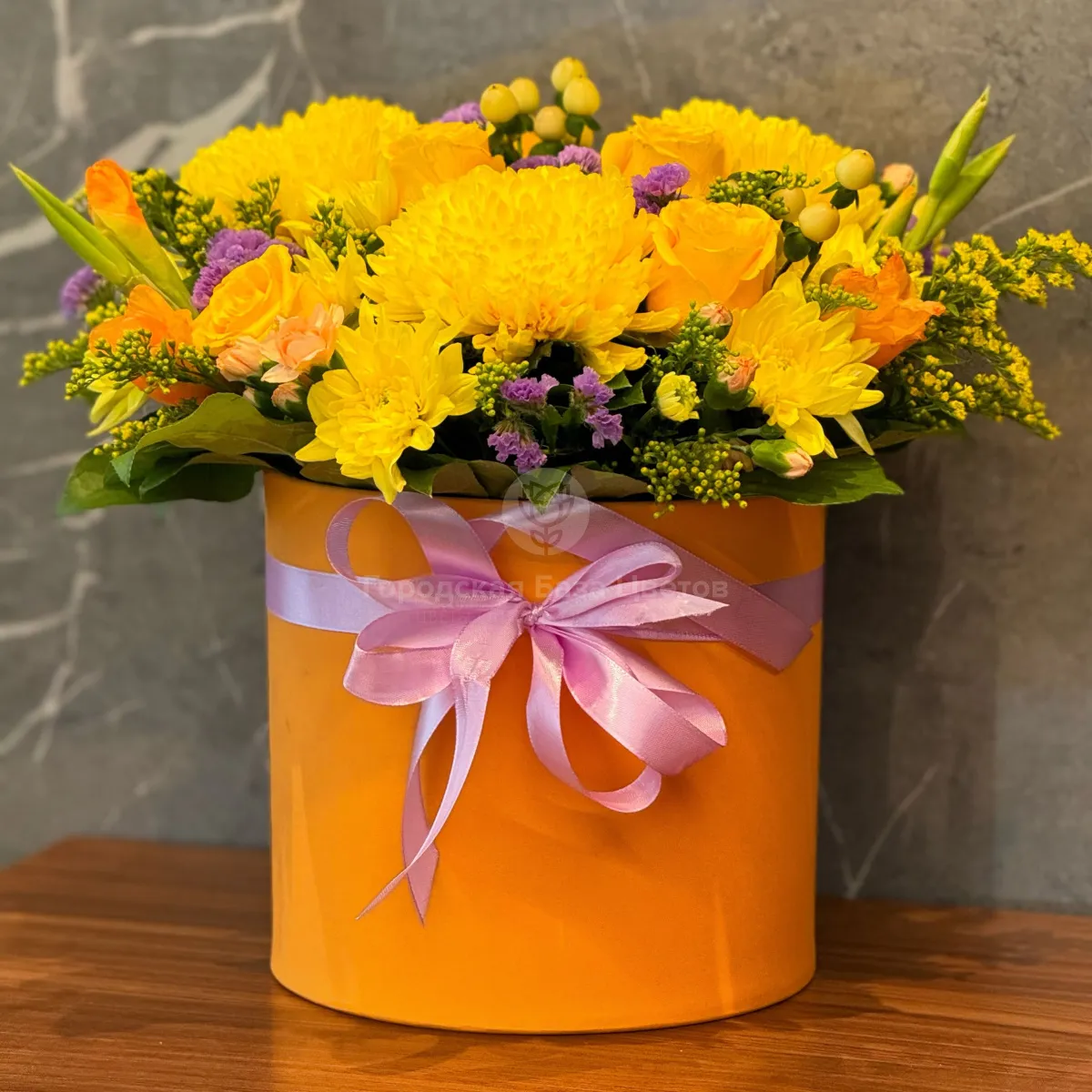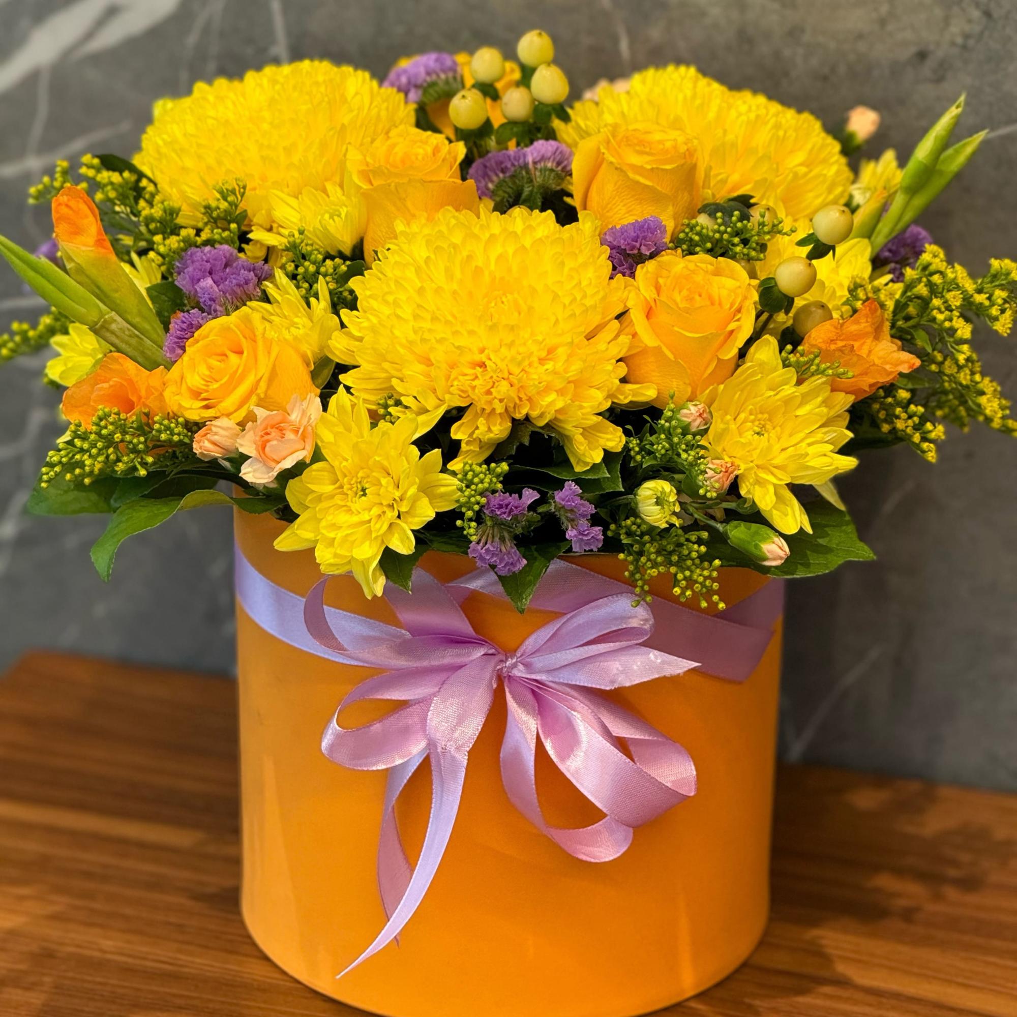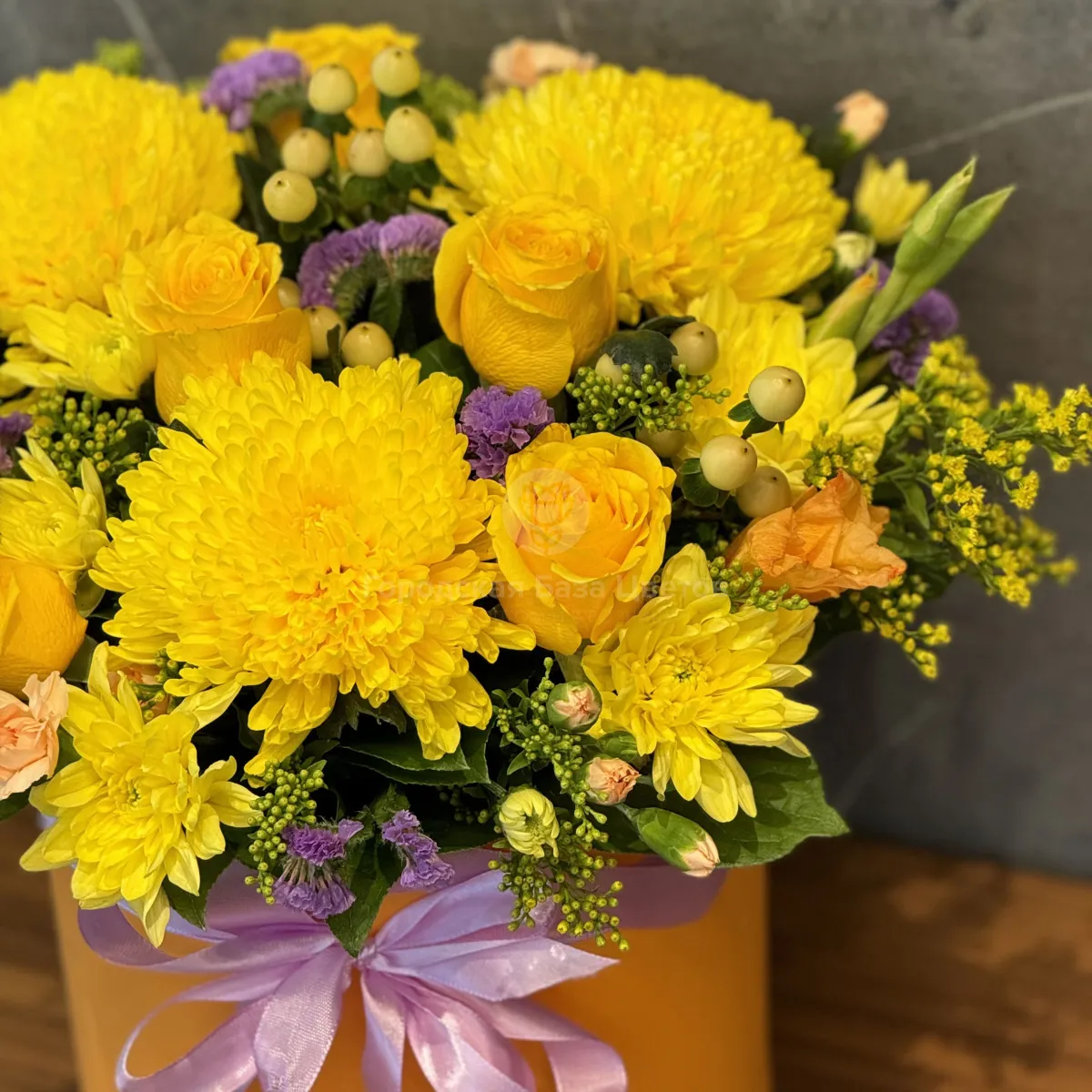Розы, хризантемы и гиперикума в коробке
