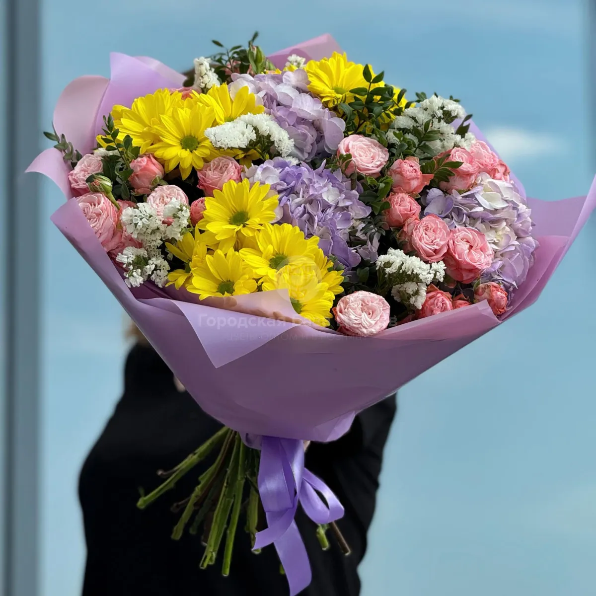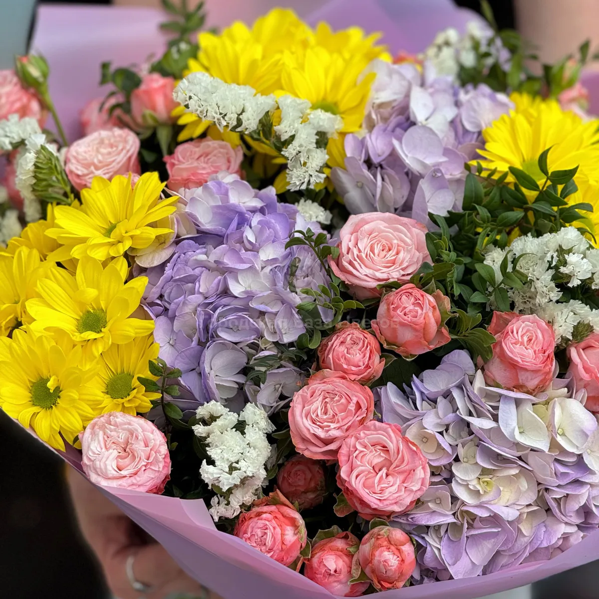 Огромный букет из роз, хризантем и гортензии