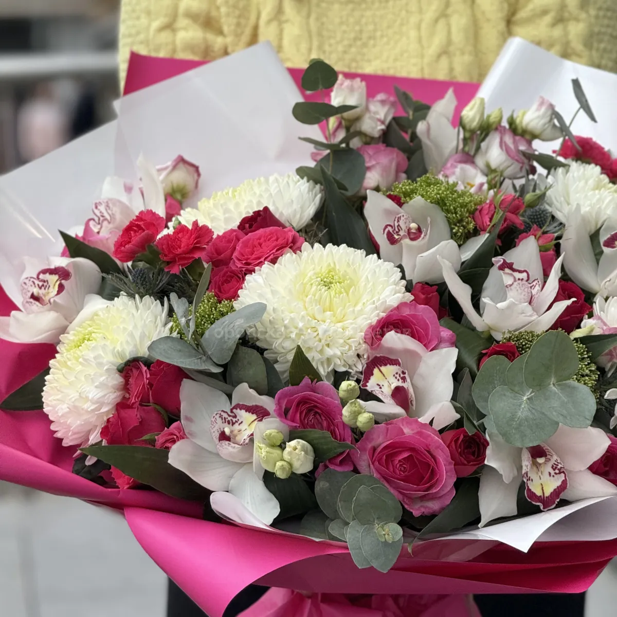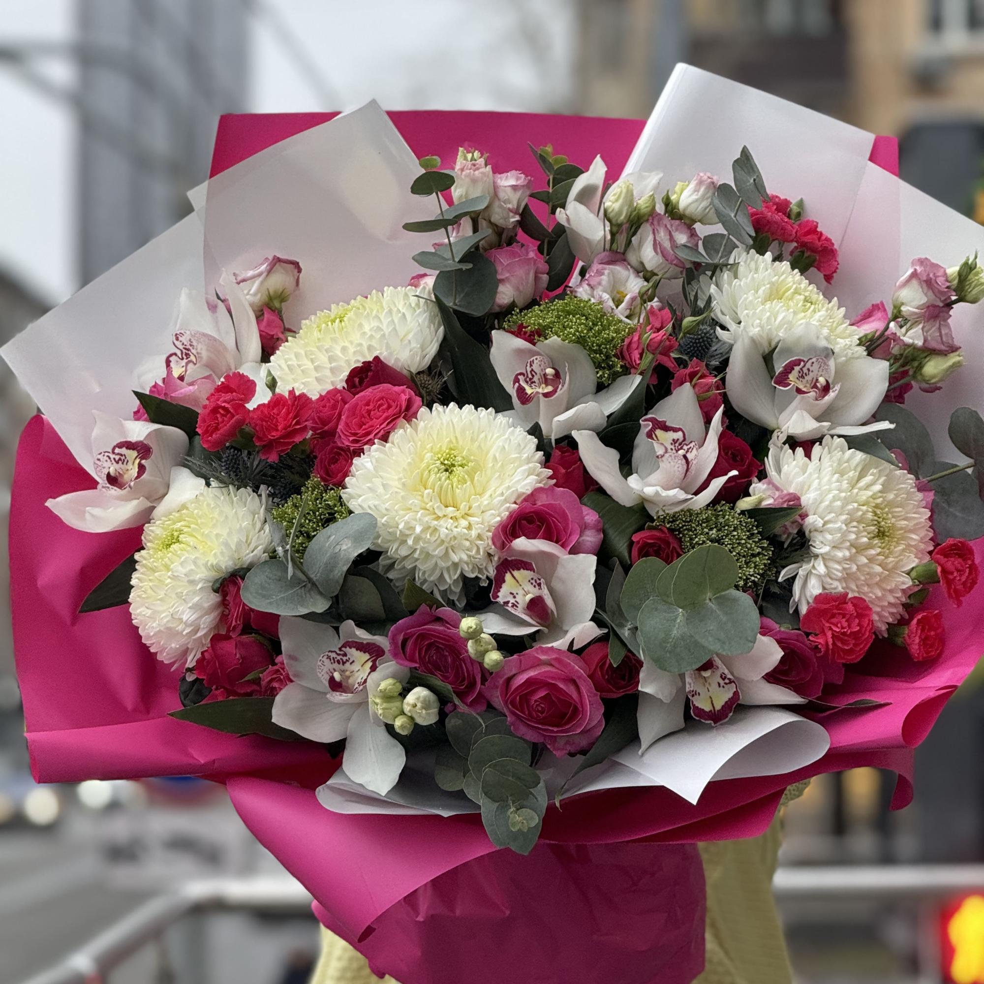 Букет из роз, хризантем и гвоздики