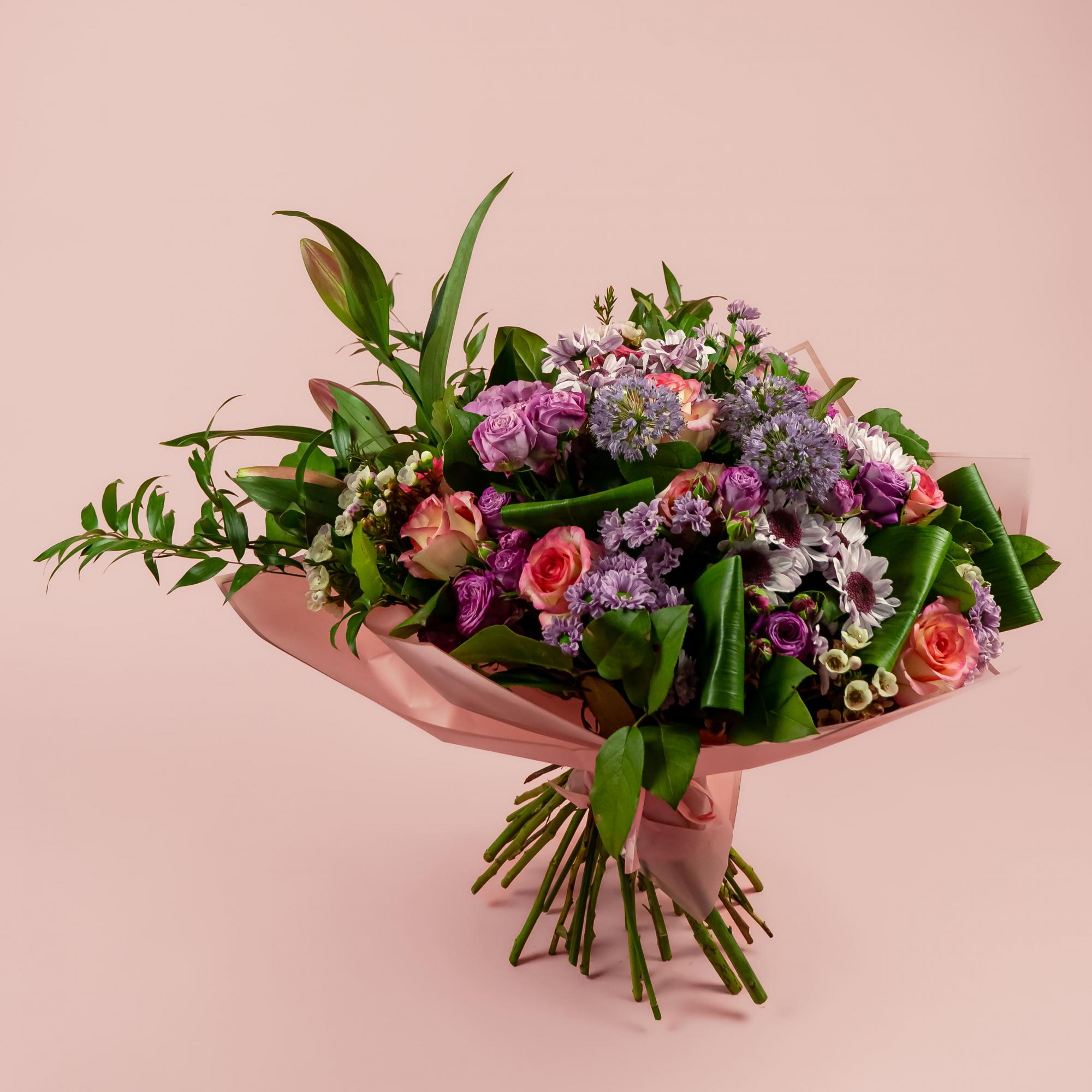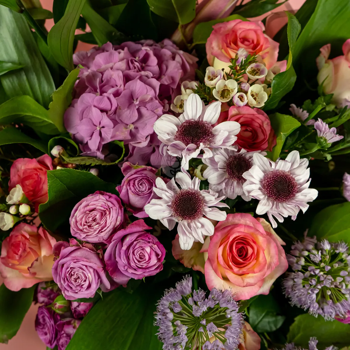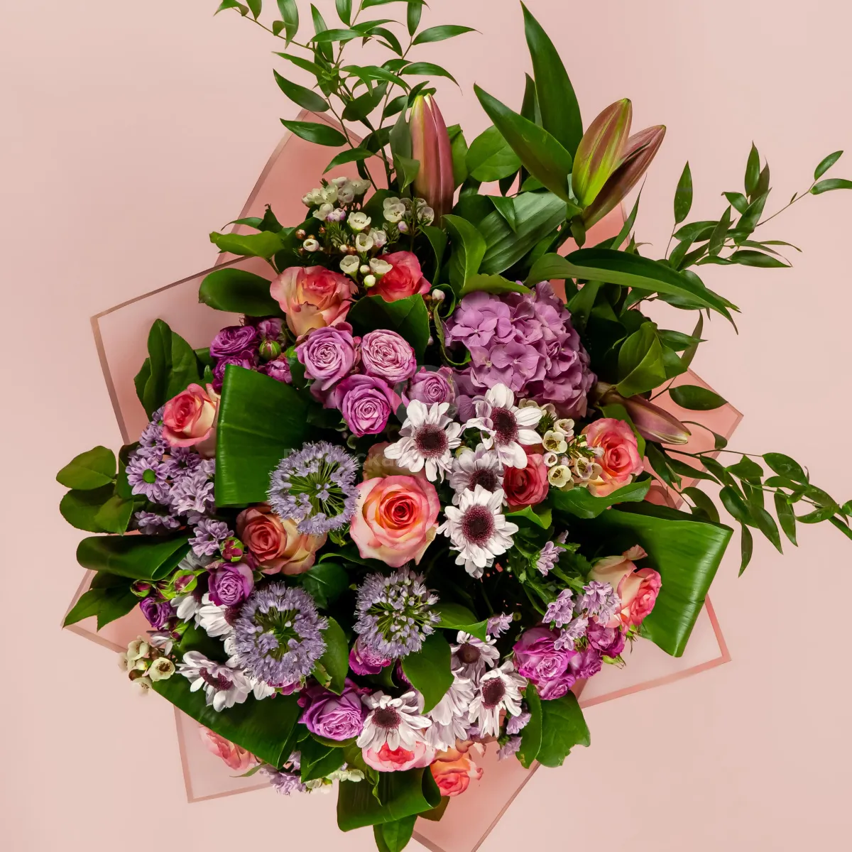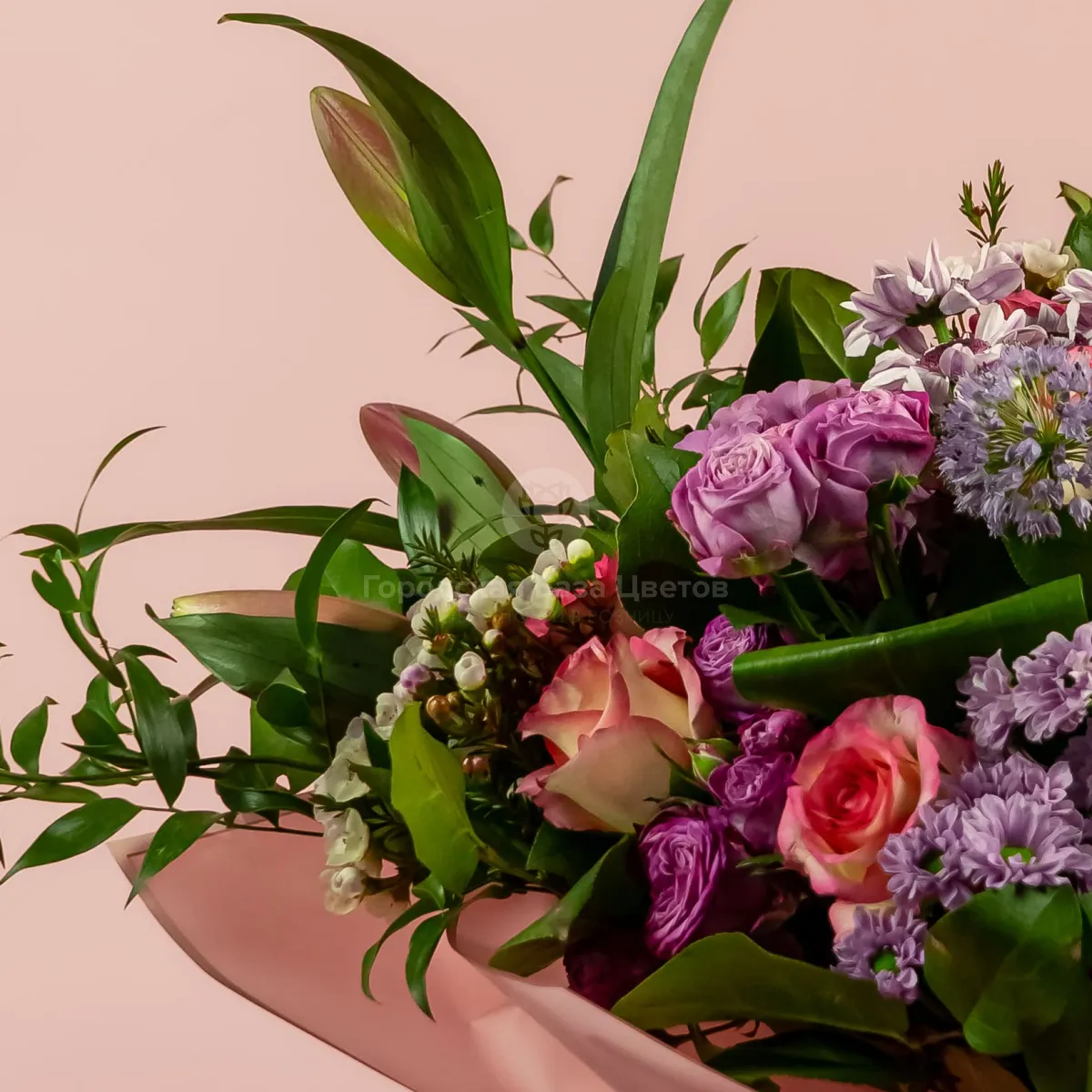 Букет из роз микс, лилии и гортензии