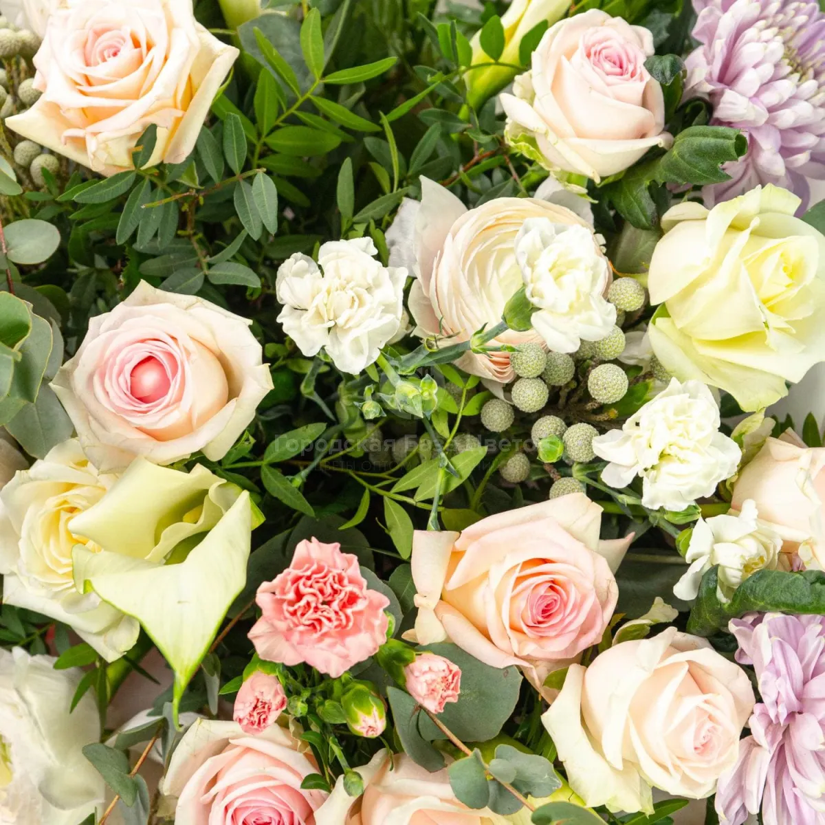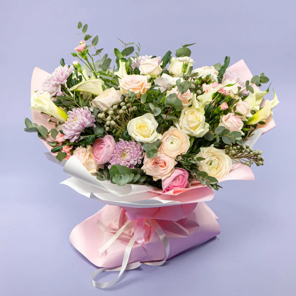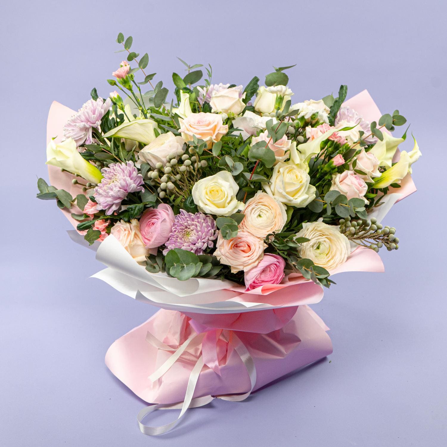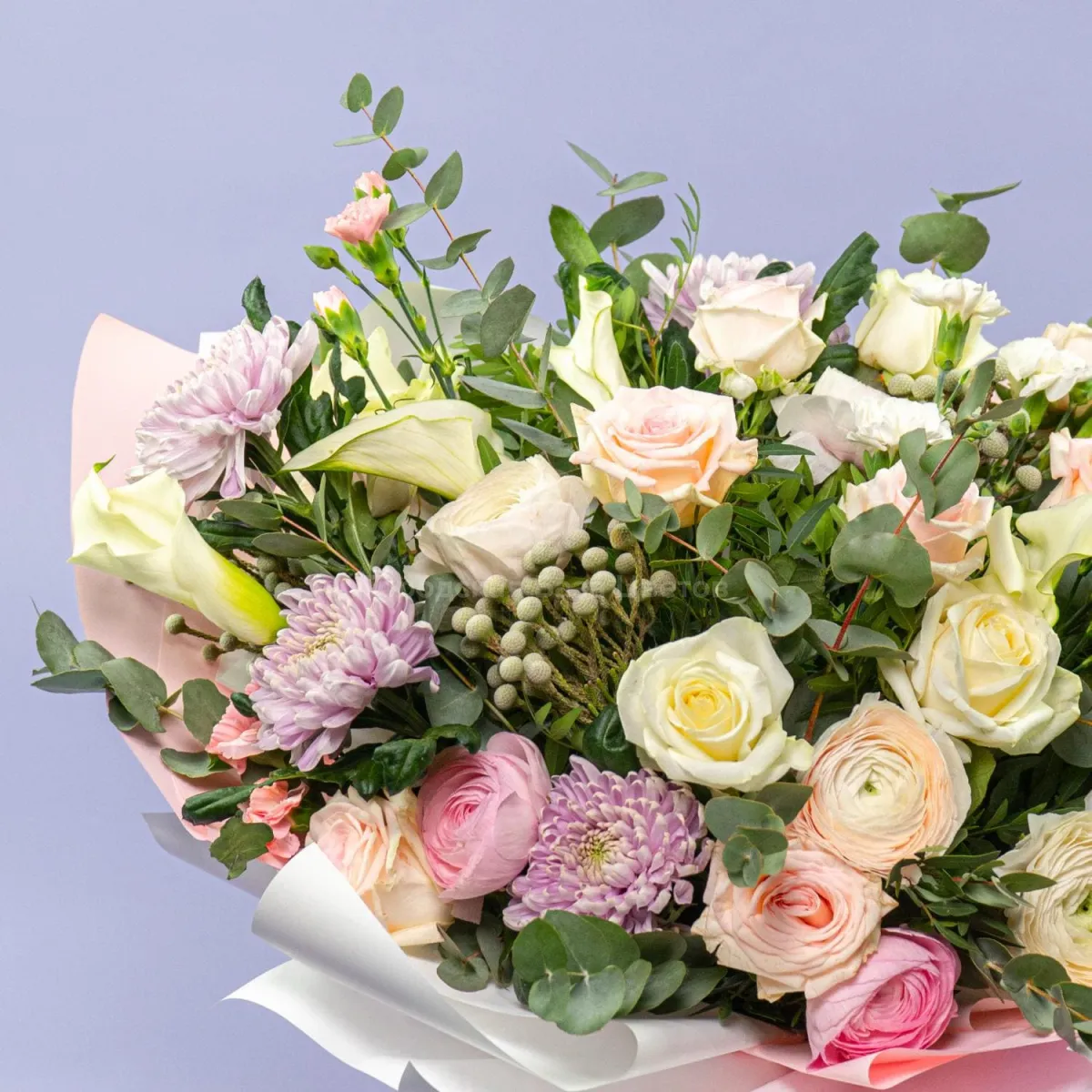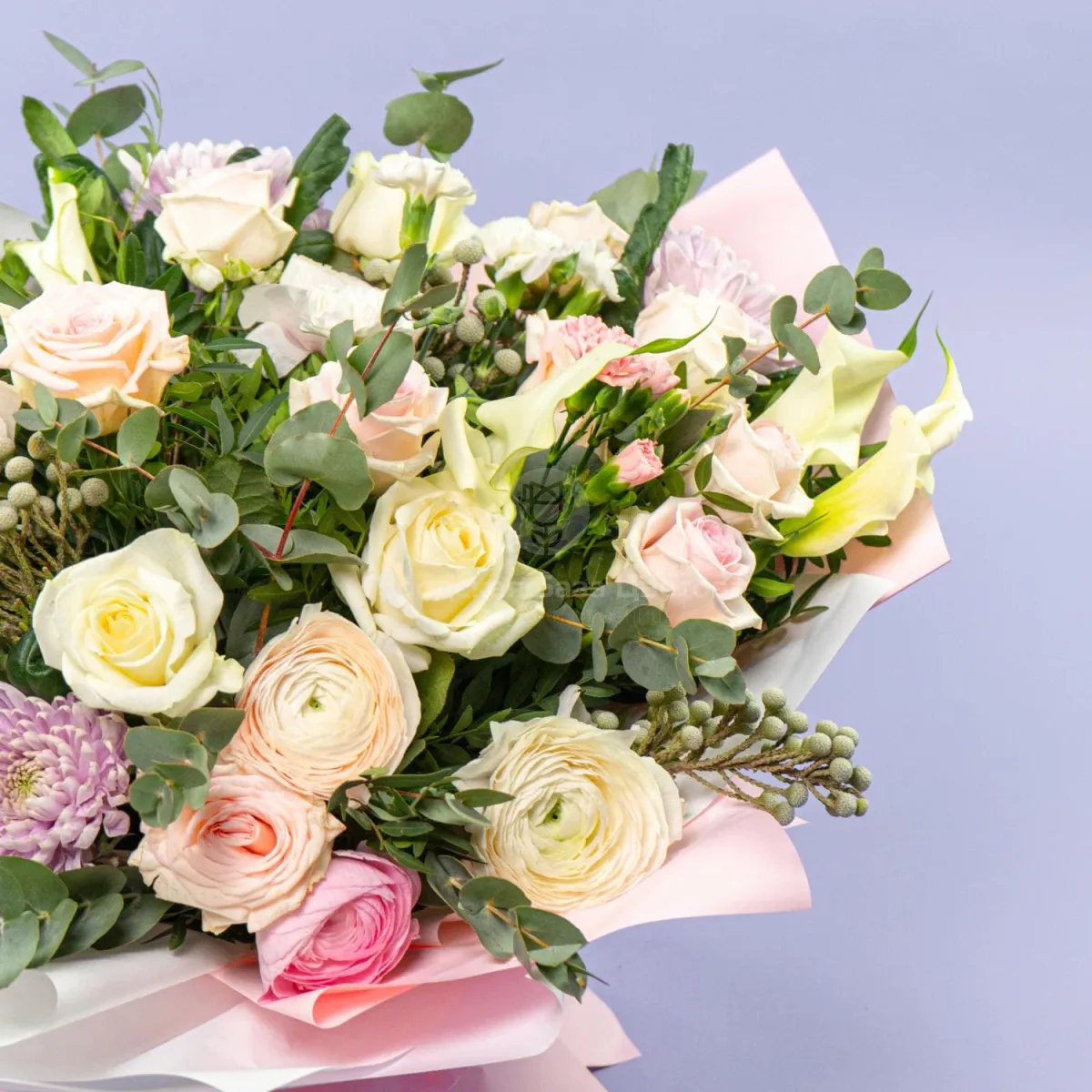 Букет из роз, ранункулюсов и хризантем