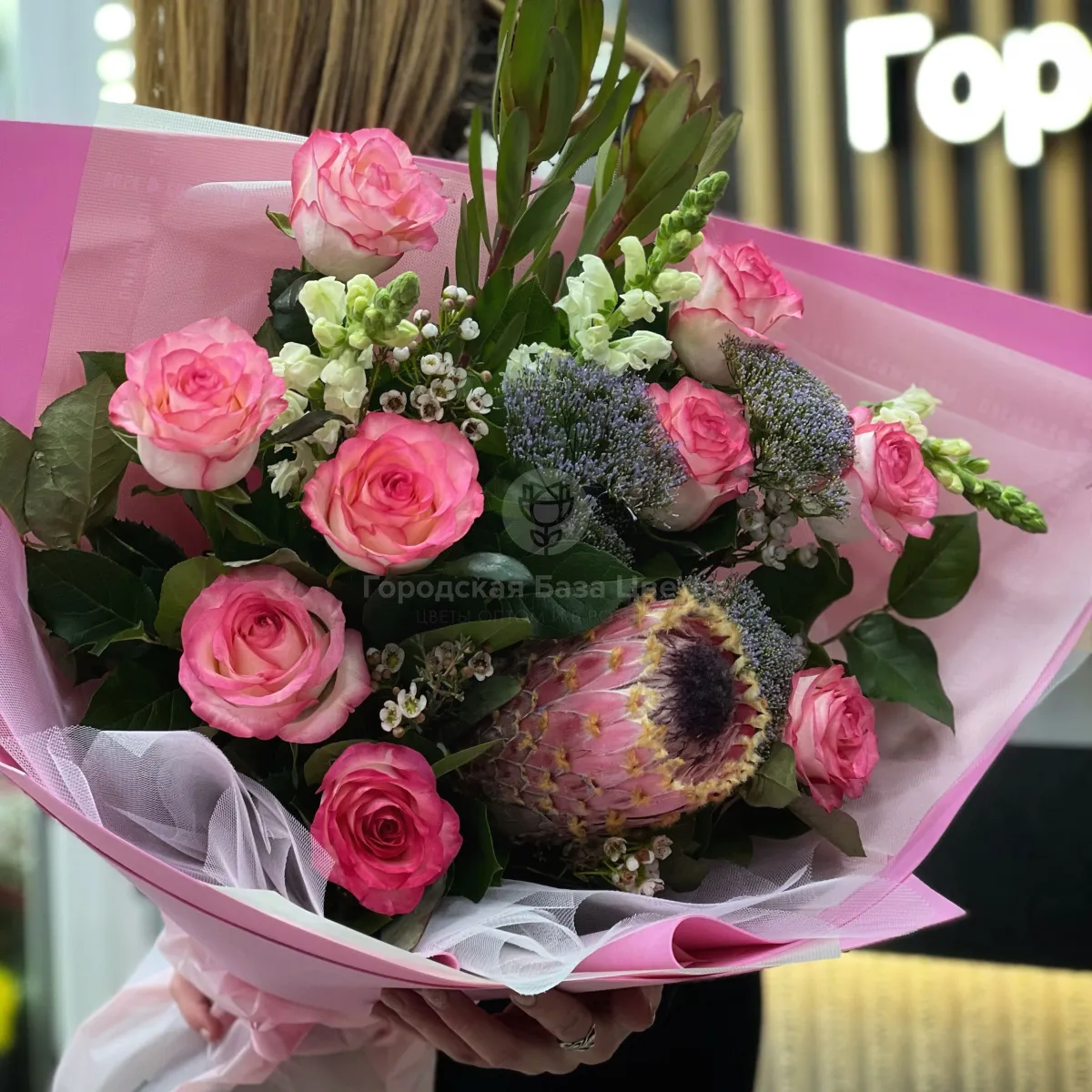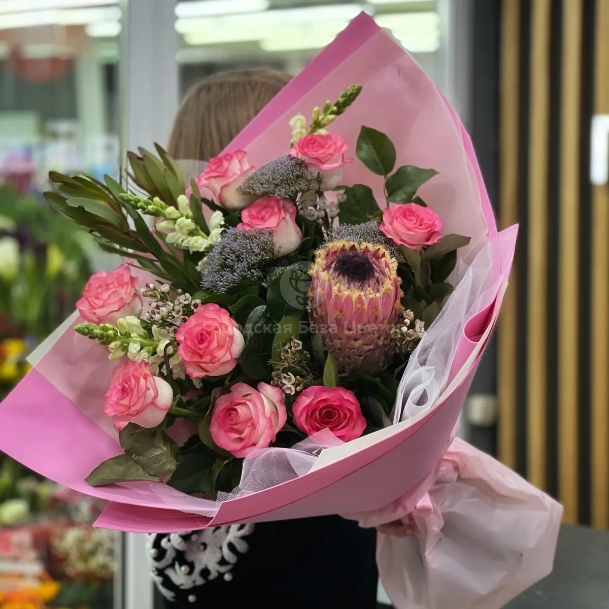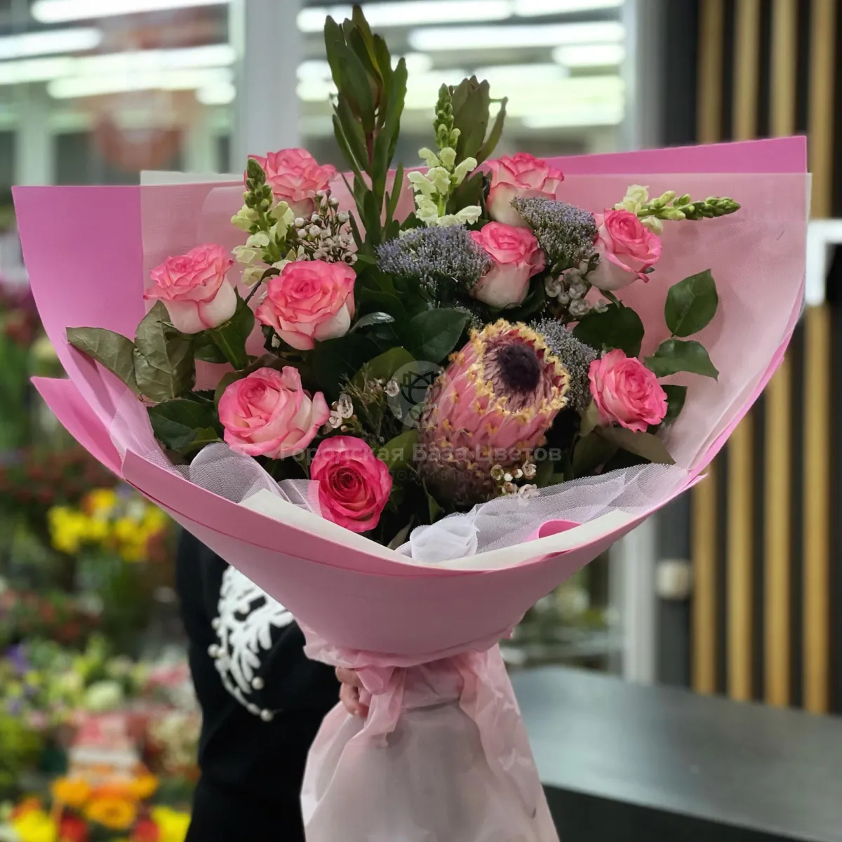 Большой букет из роз, сафари и хамелациума
