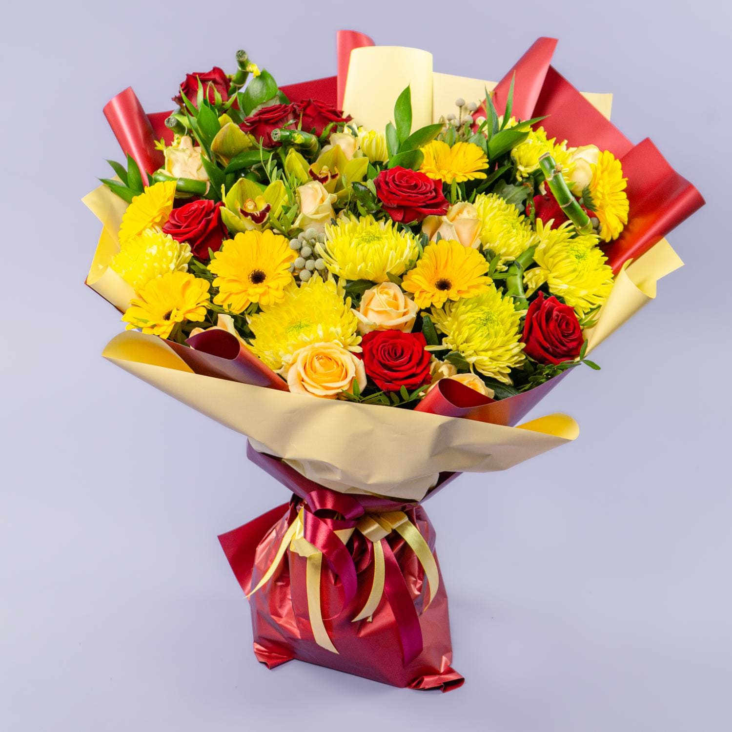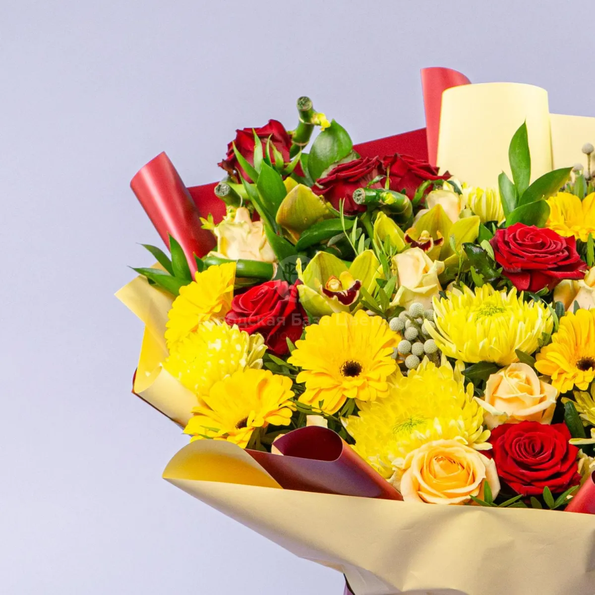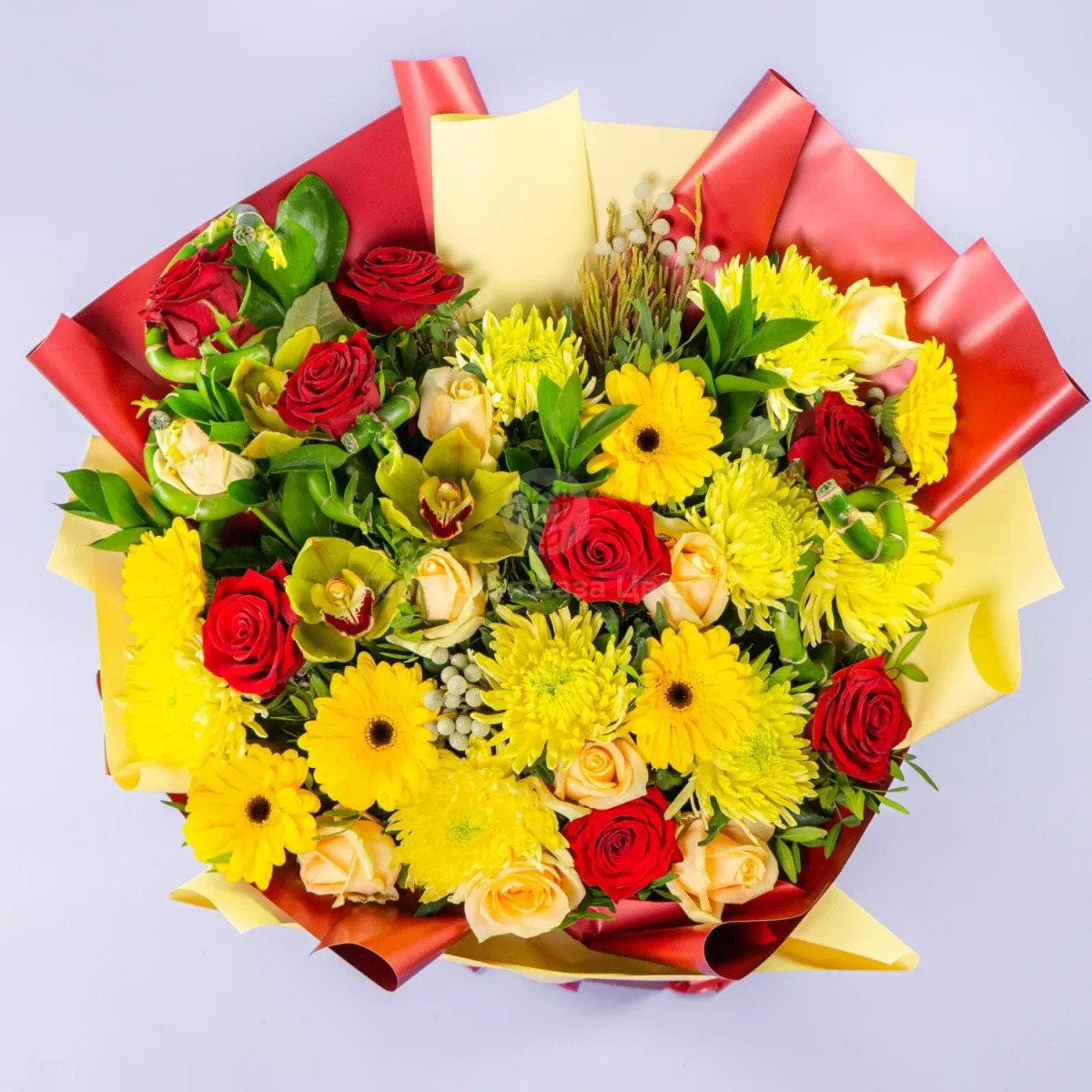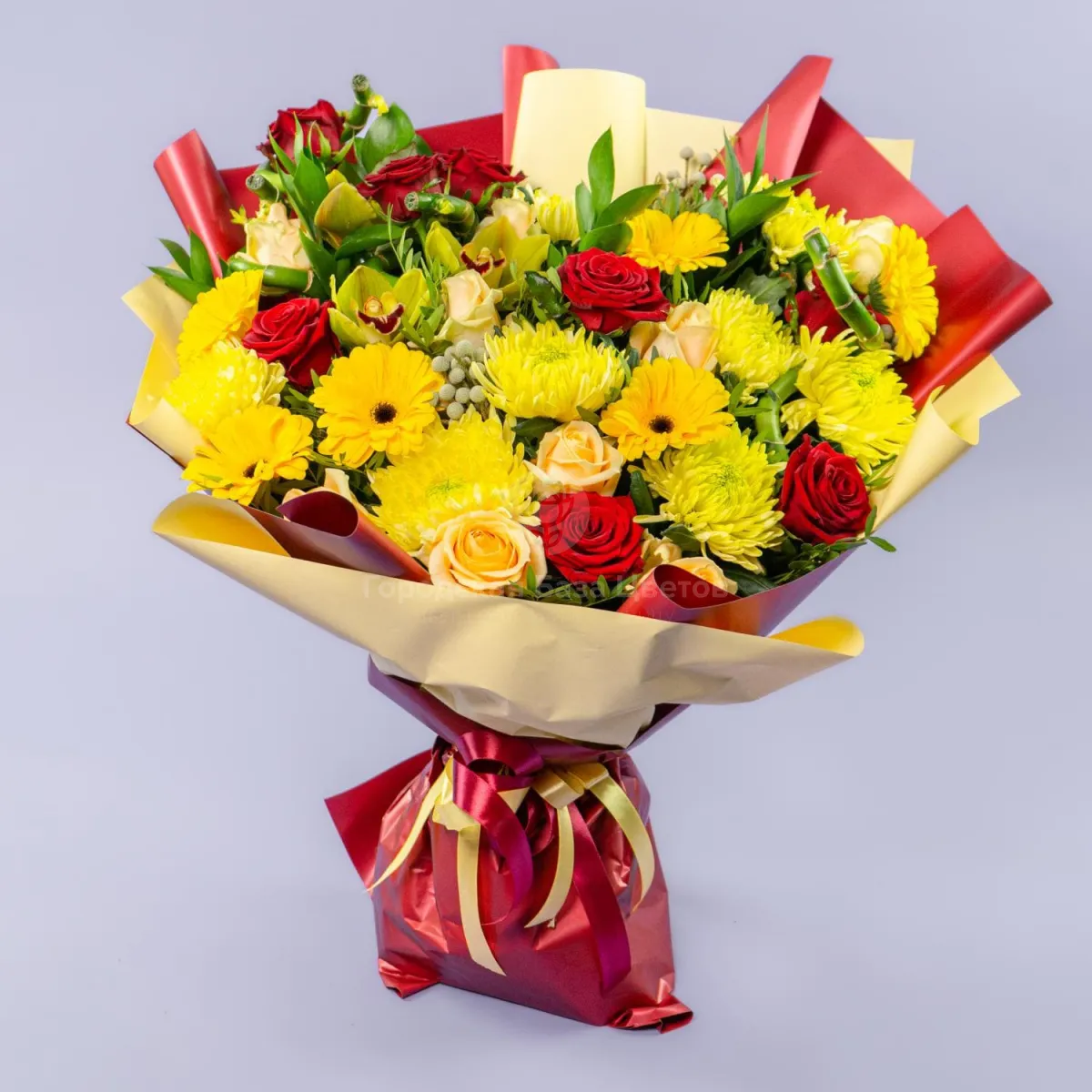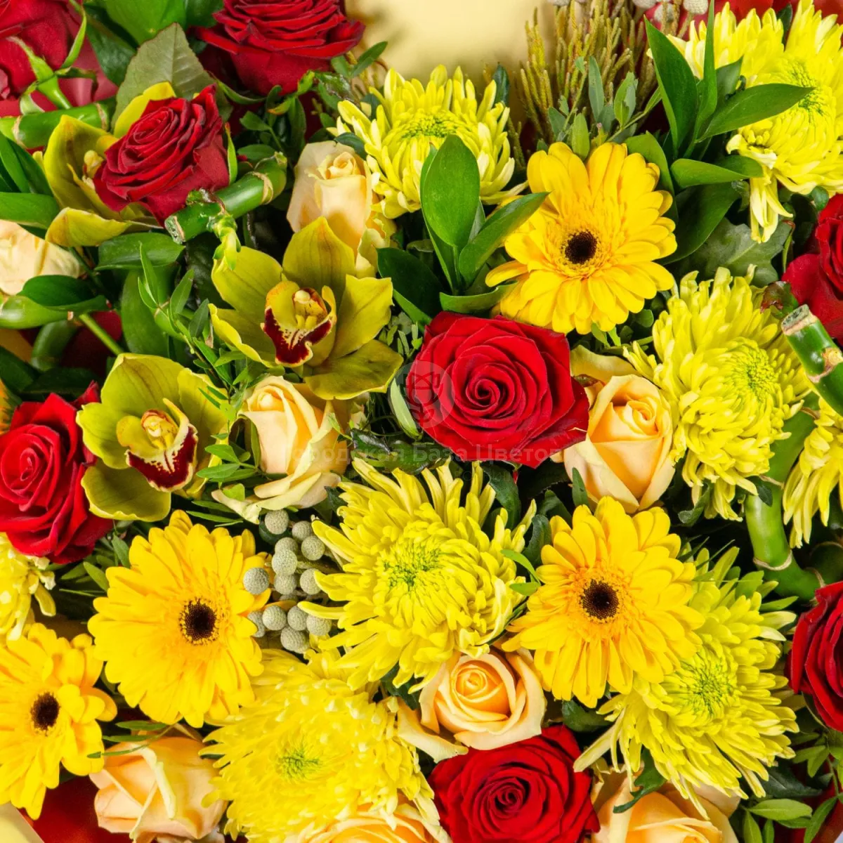Букет из роз, жёлтых гербер и хризантем