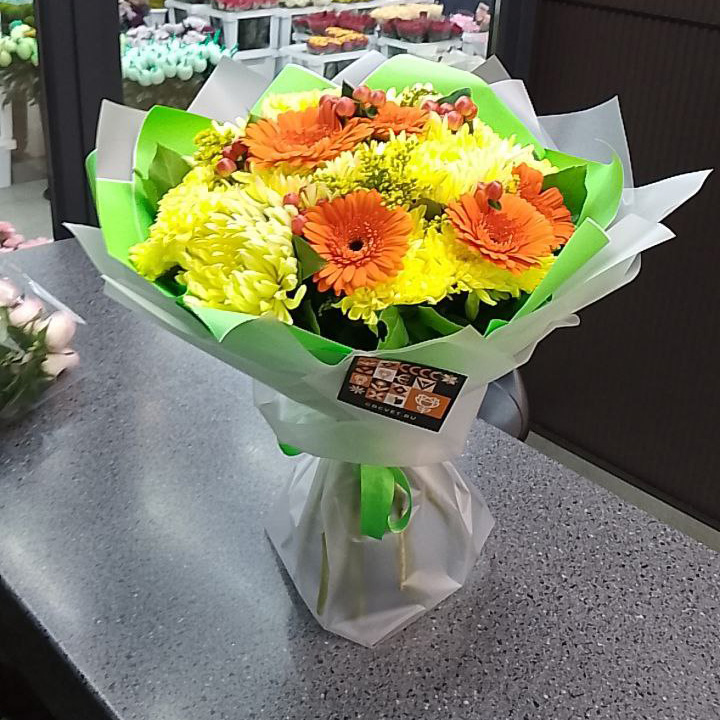 Дополнительно: открытку положили, как просил, и подписали все. Спасибо за букет, очень хороший!)