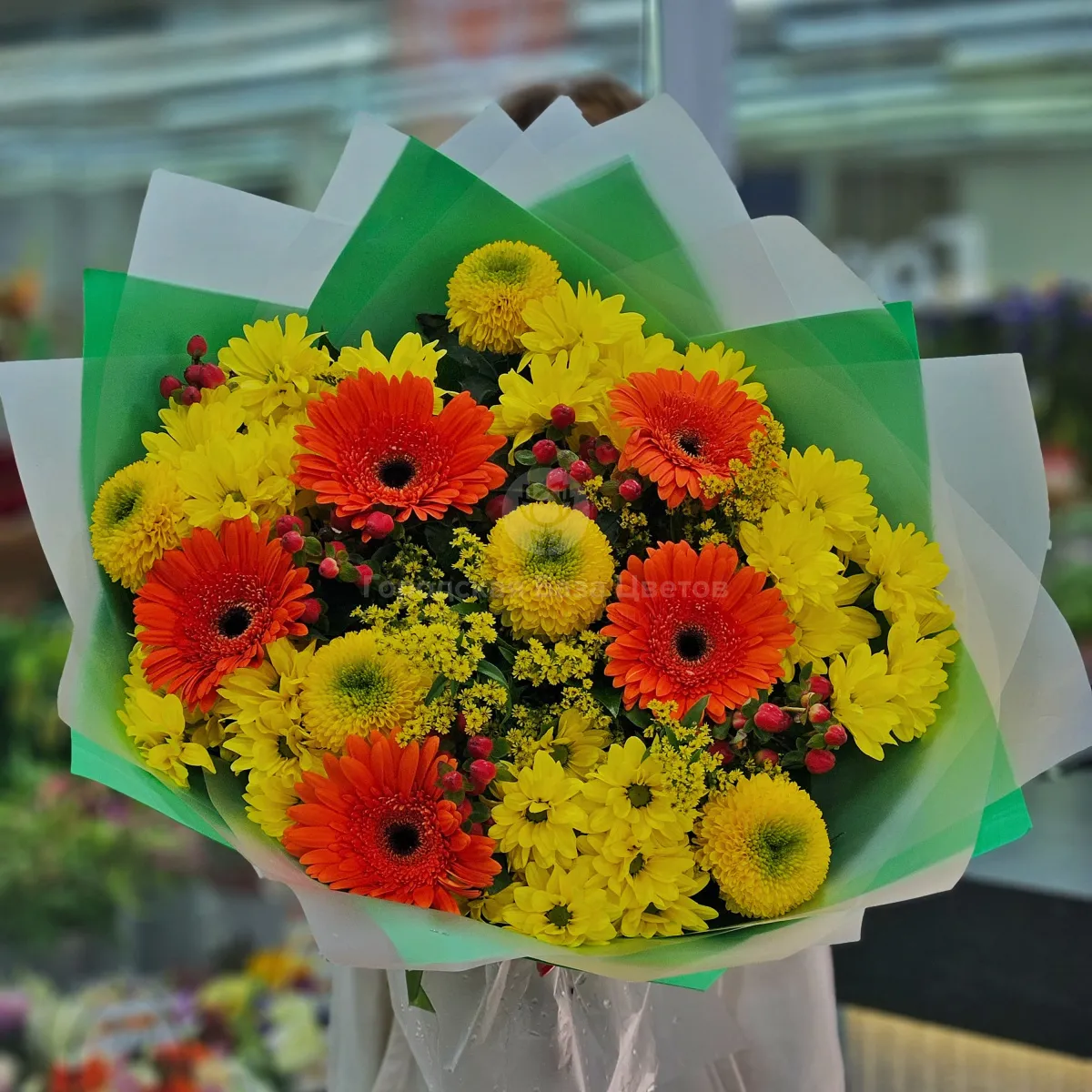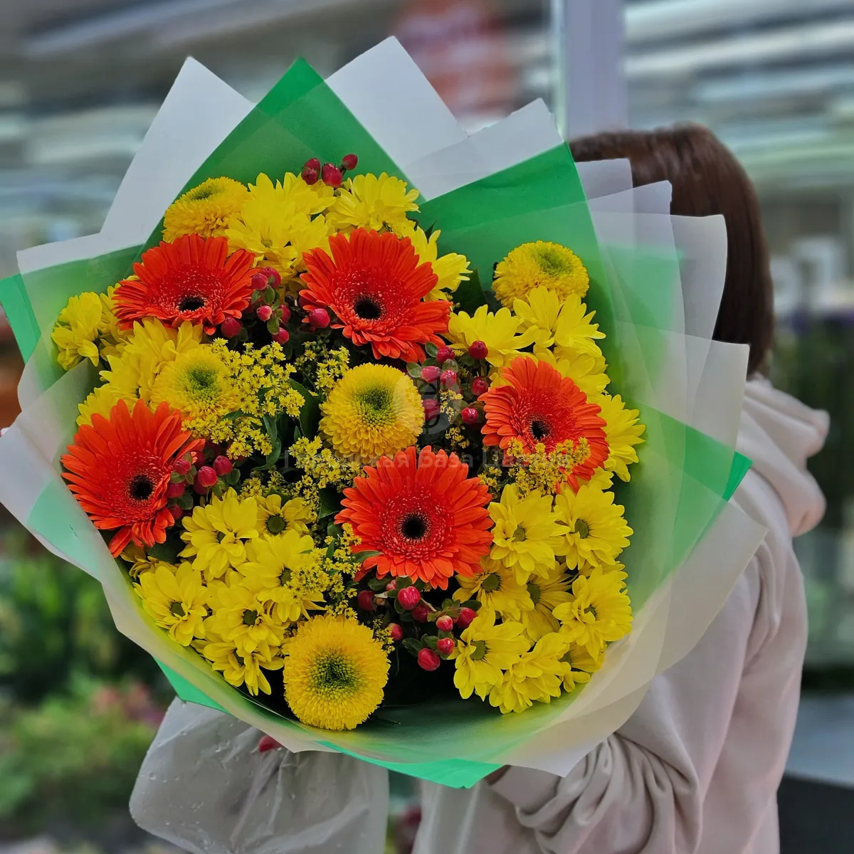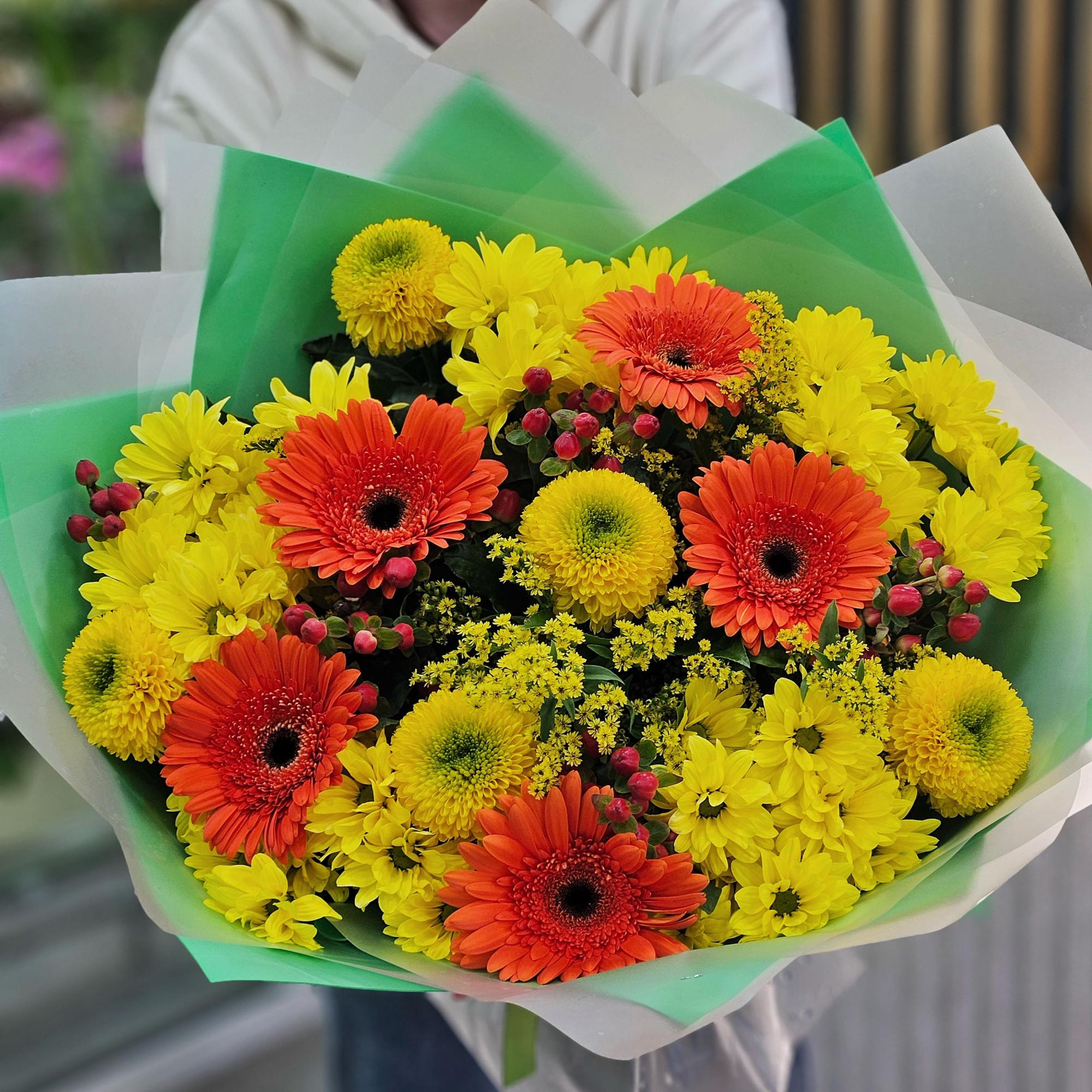 Букет из солидаго, хризантем и гербер