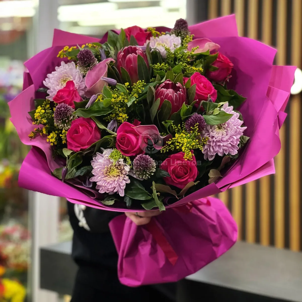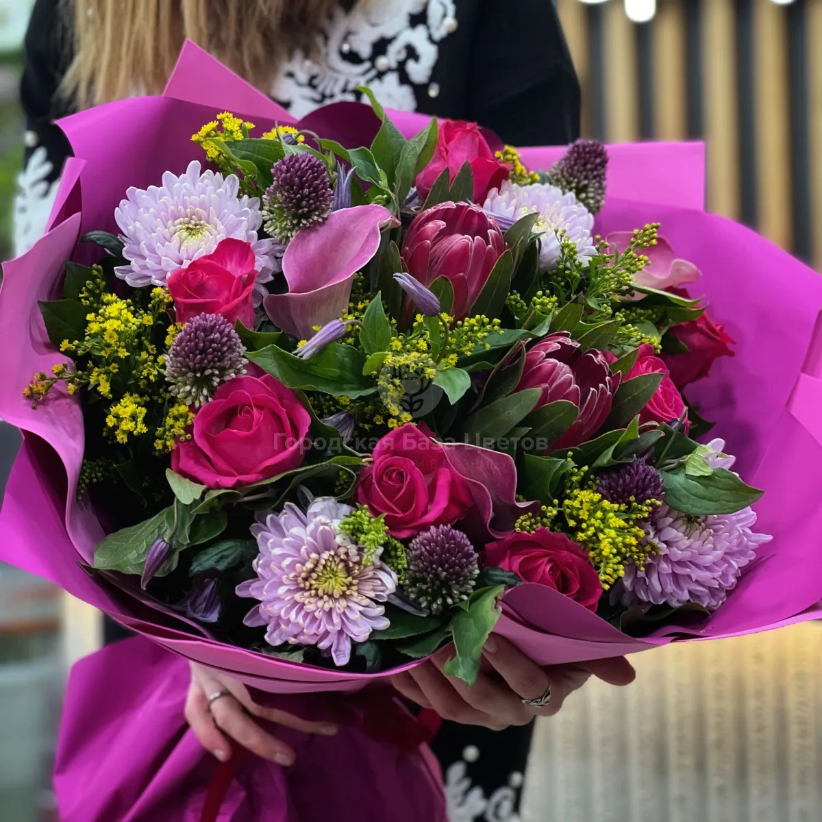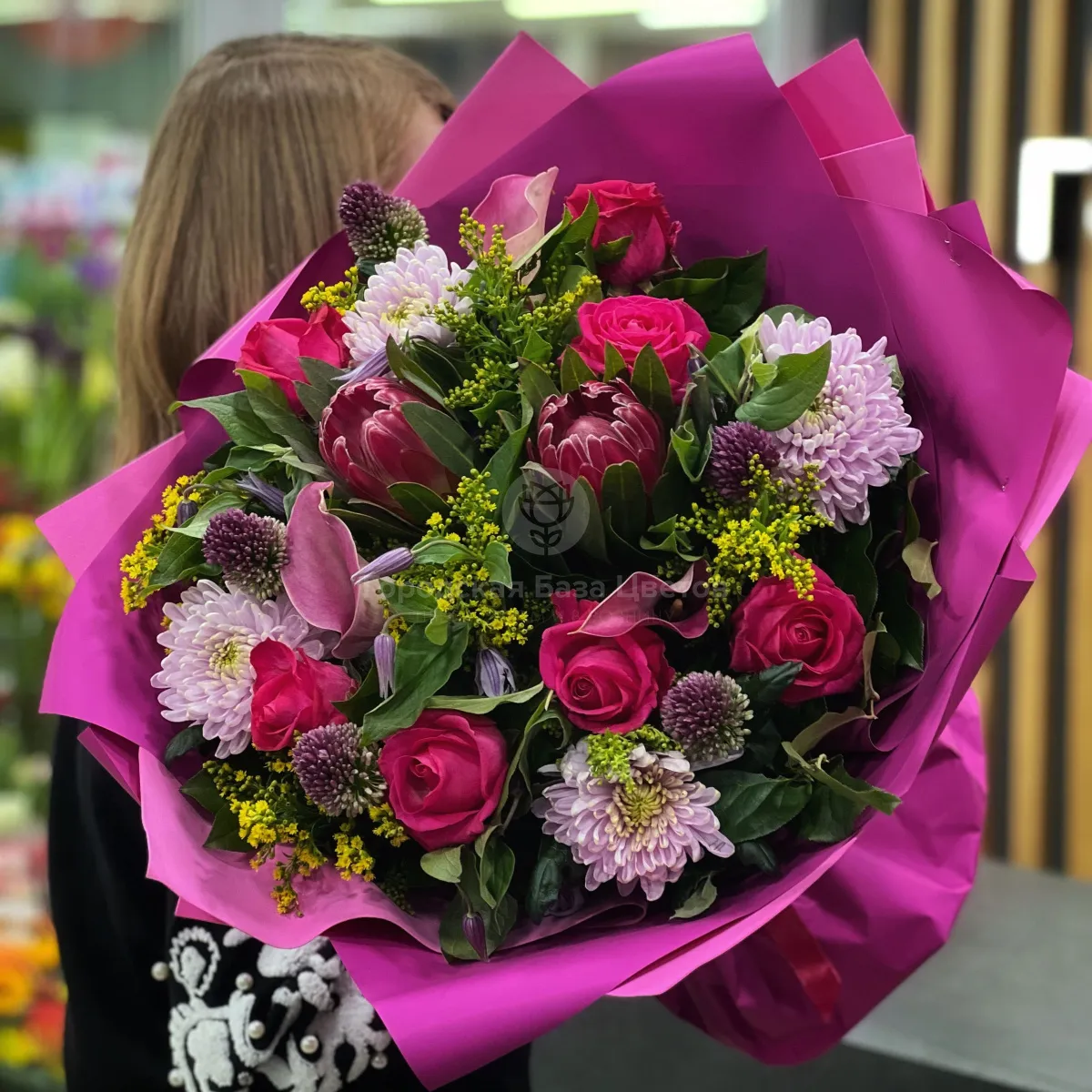 Огромный букет из солидаго, хризантем и роз
