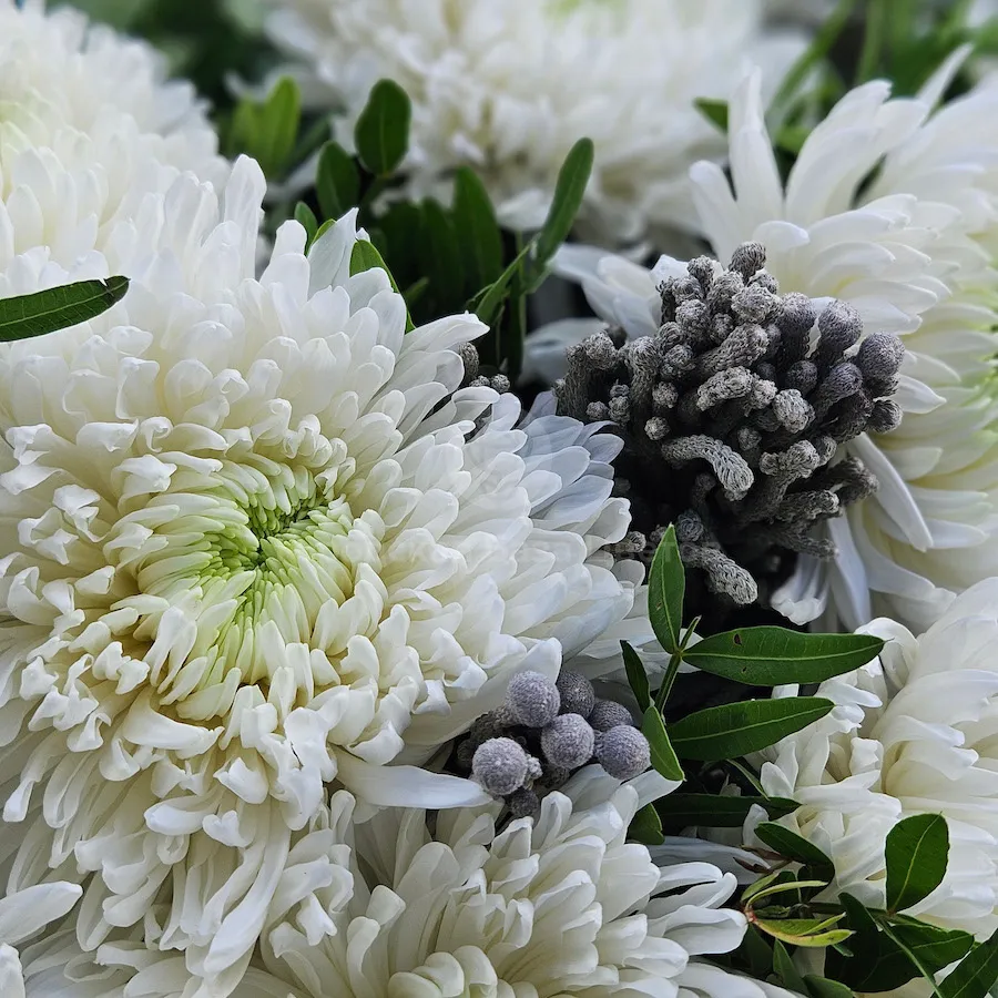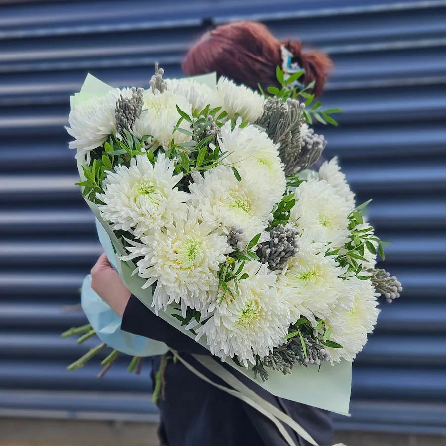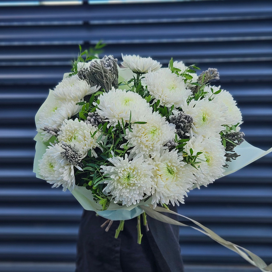 Букет хризантем, бруний и фисташек