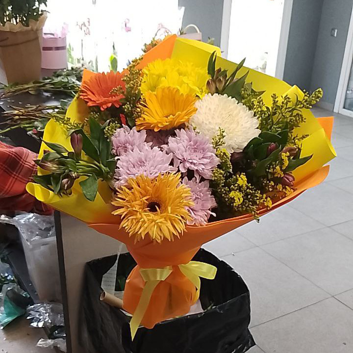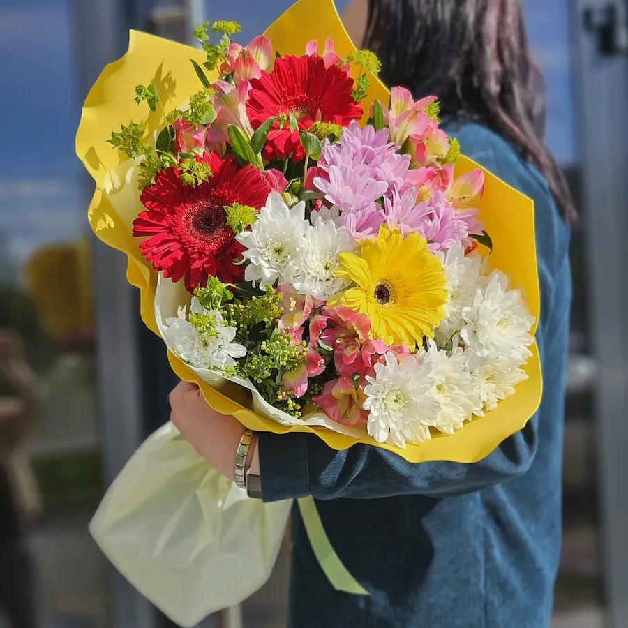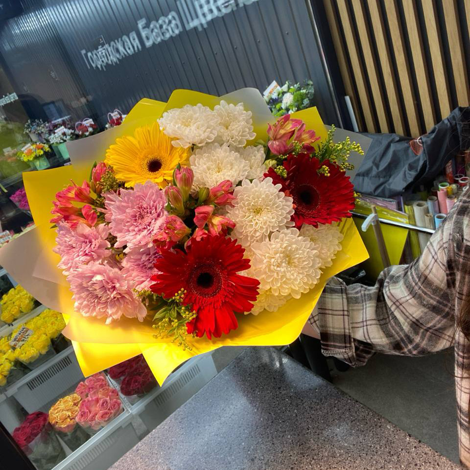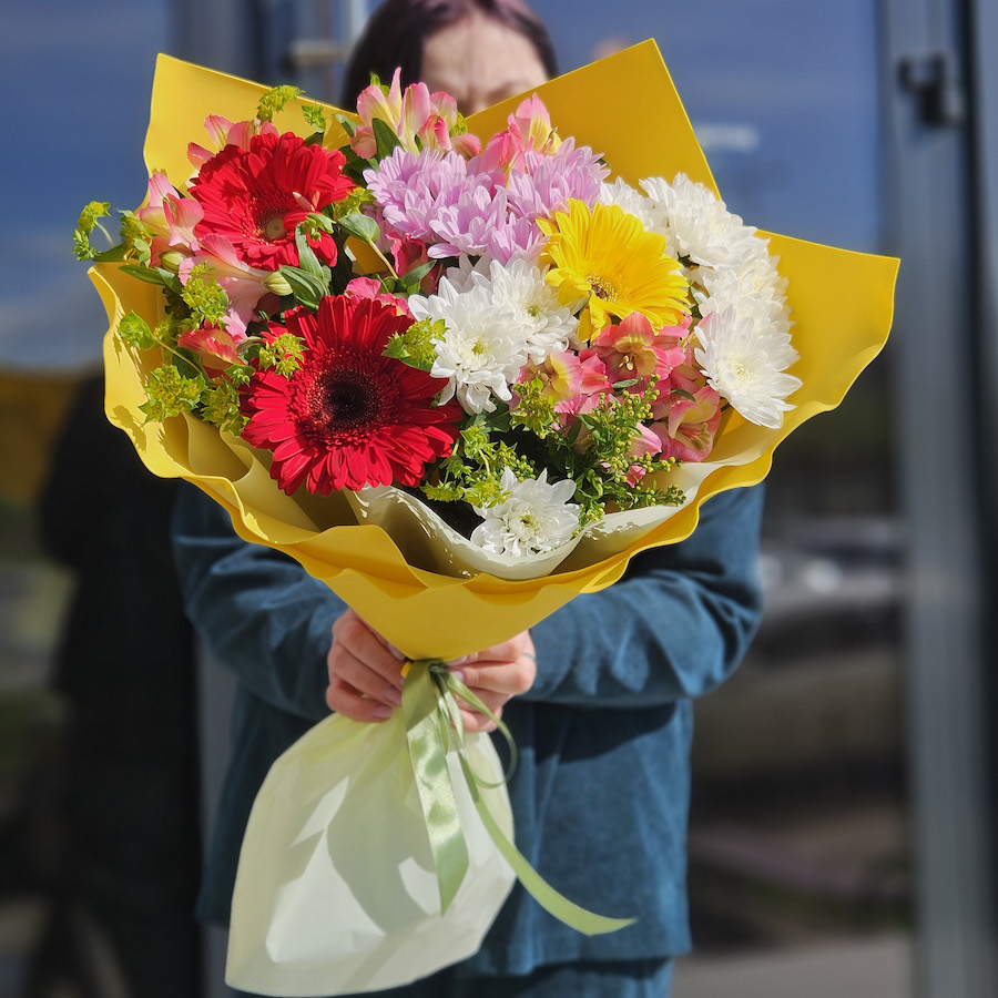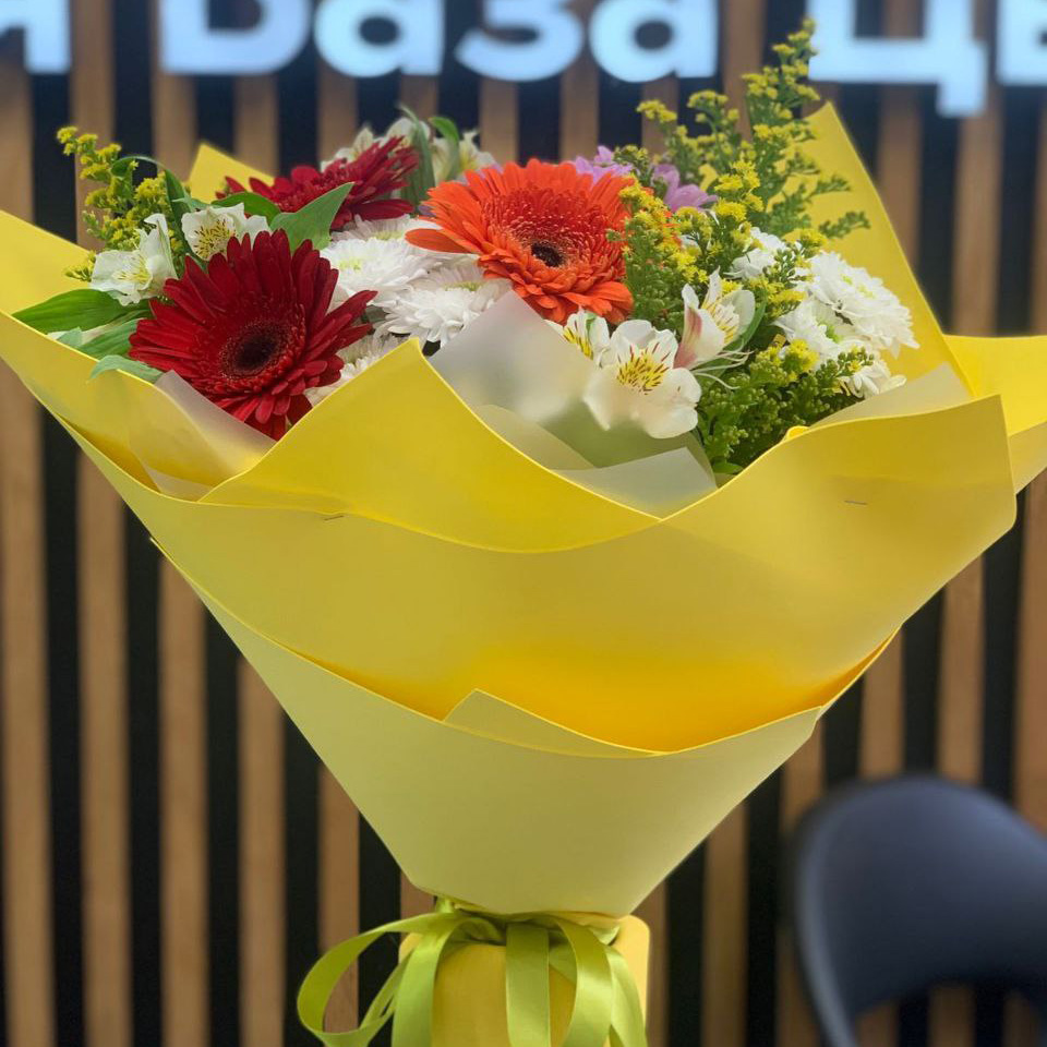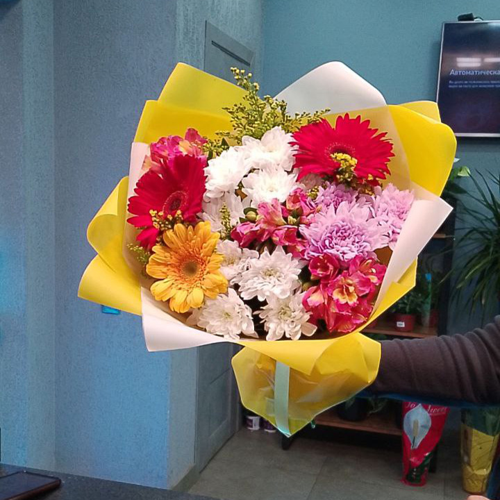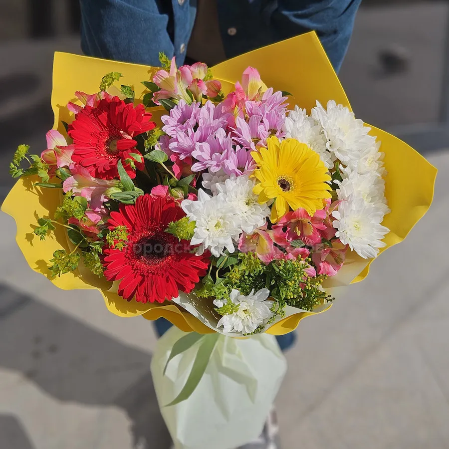 Букет хризантем, гербер и альстромерий