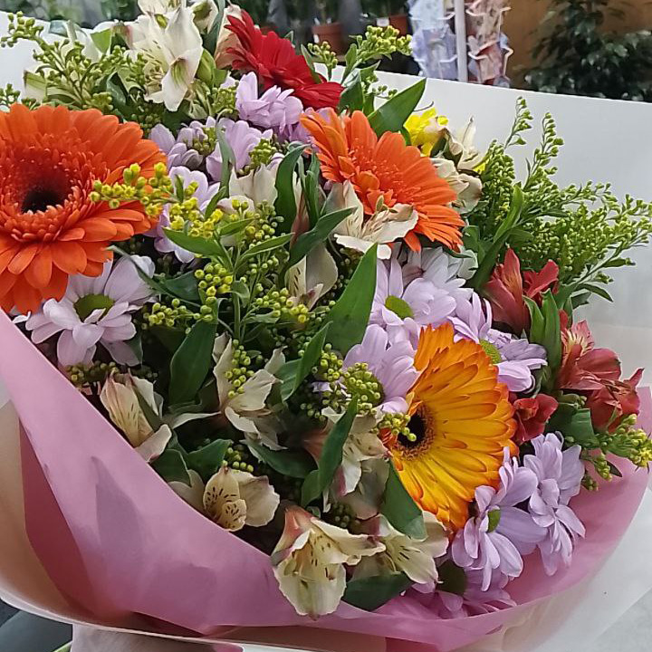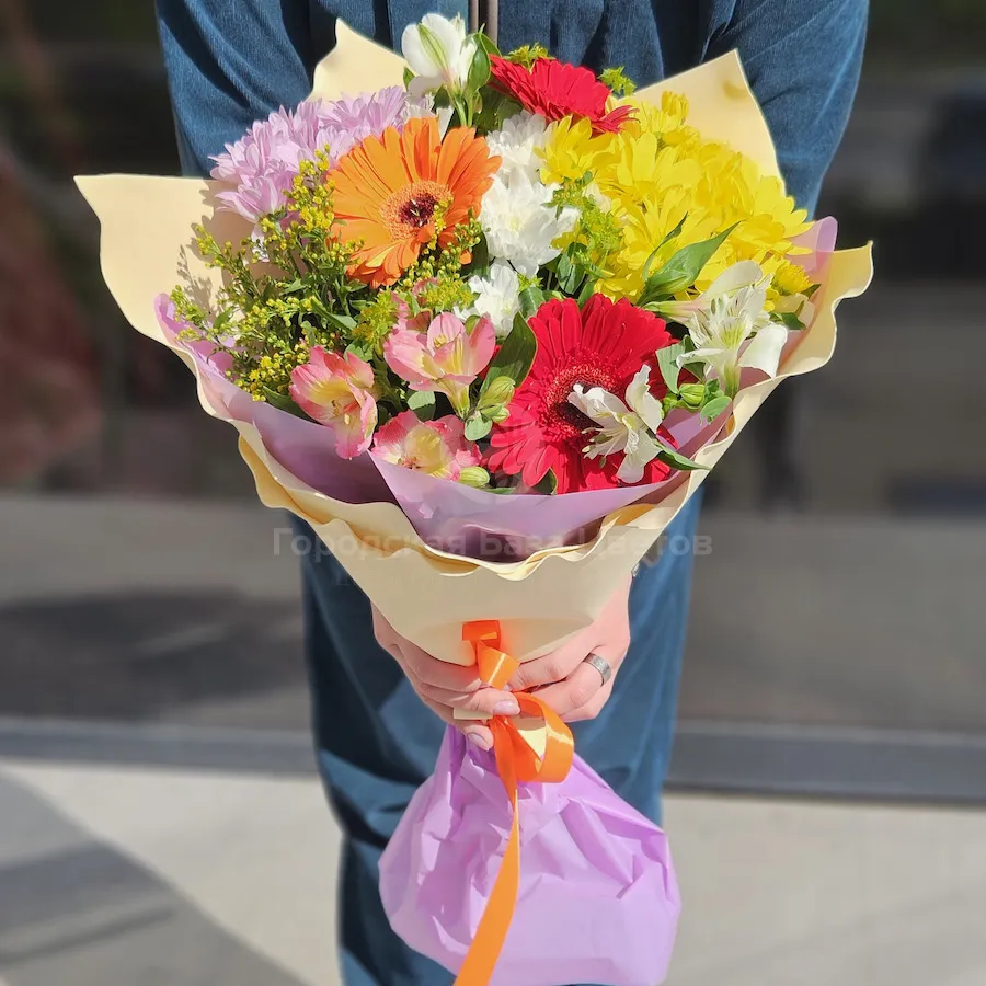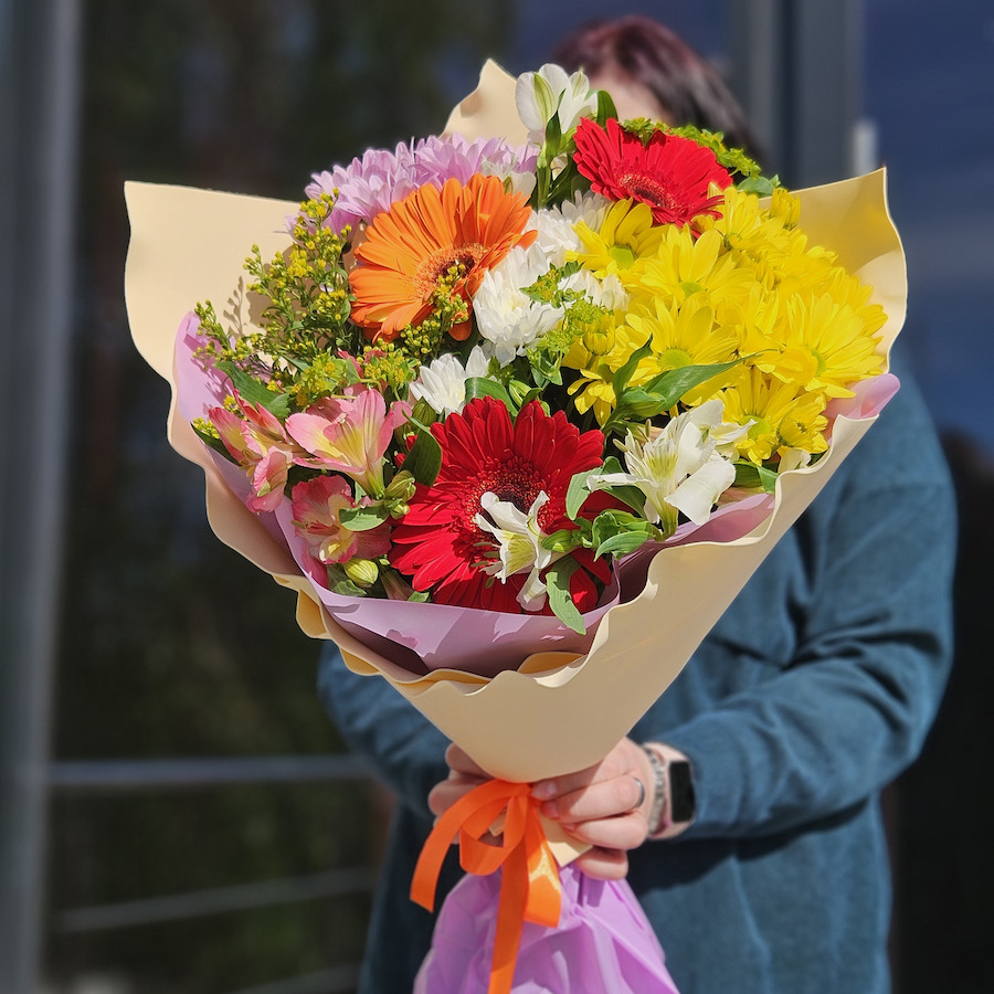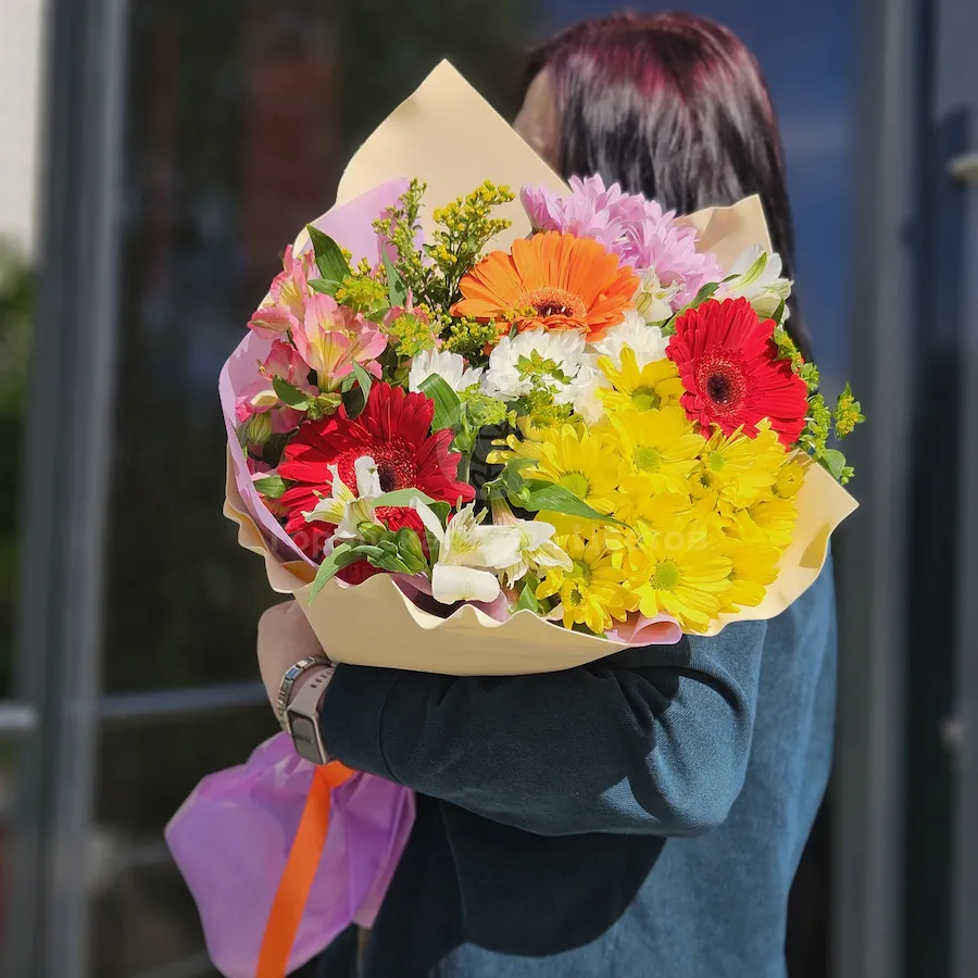 Большой букет хризантем, гербер и альстромерий
