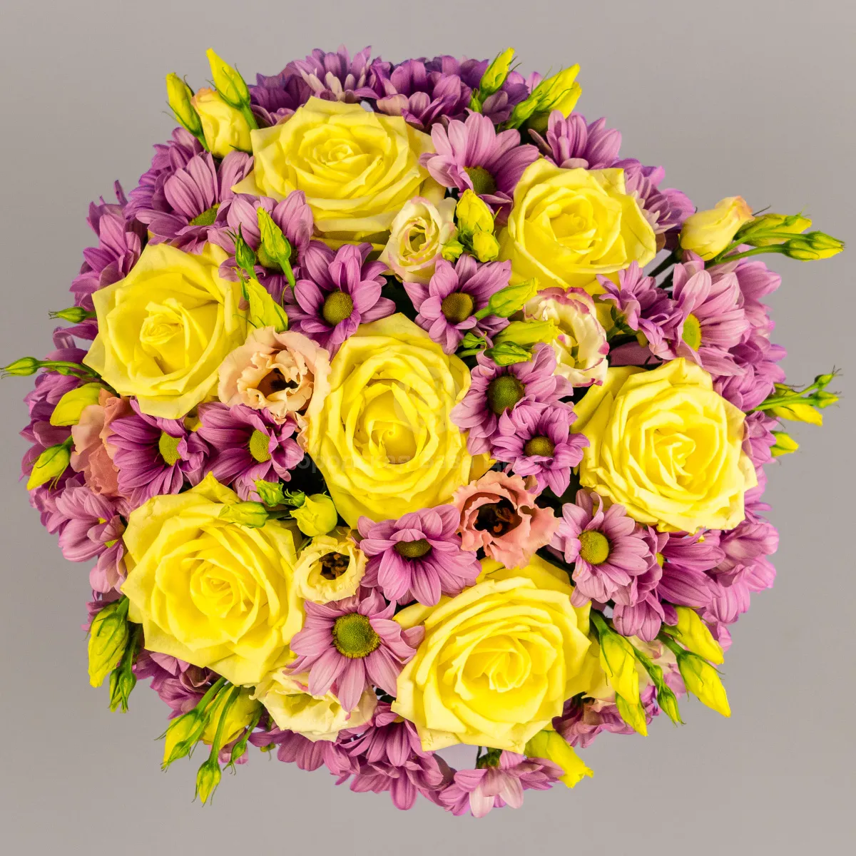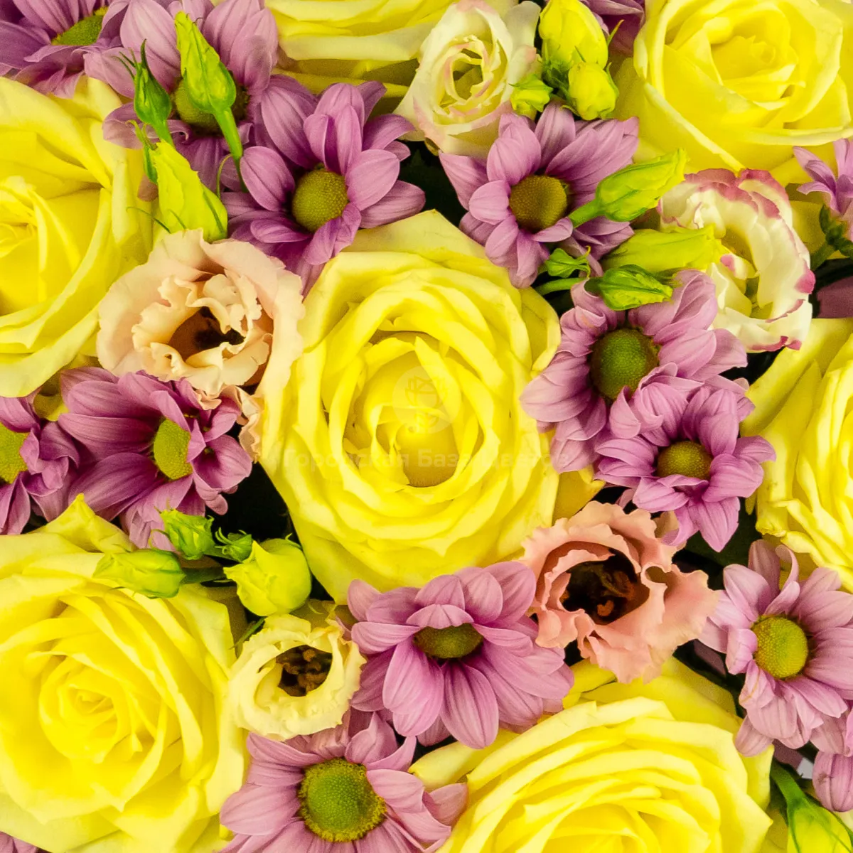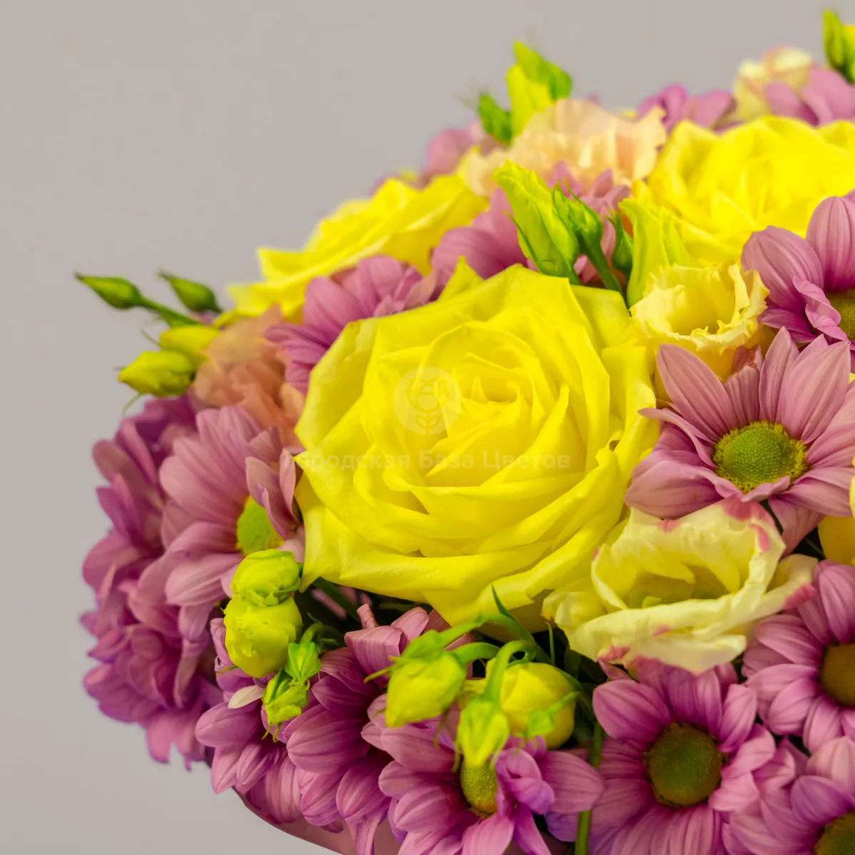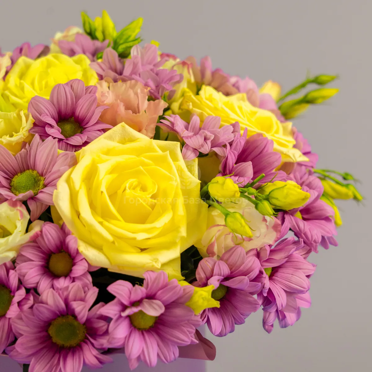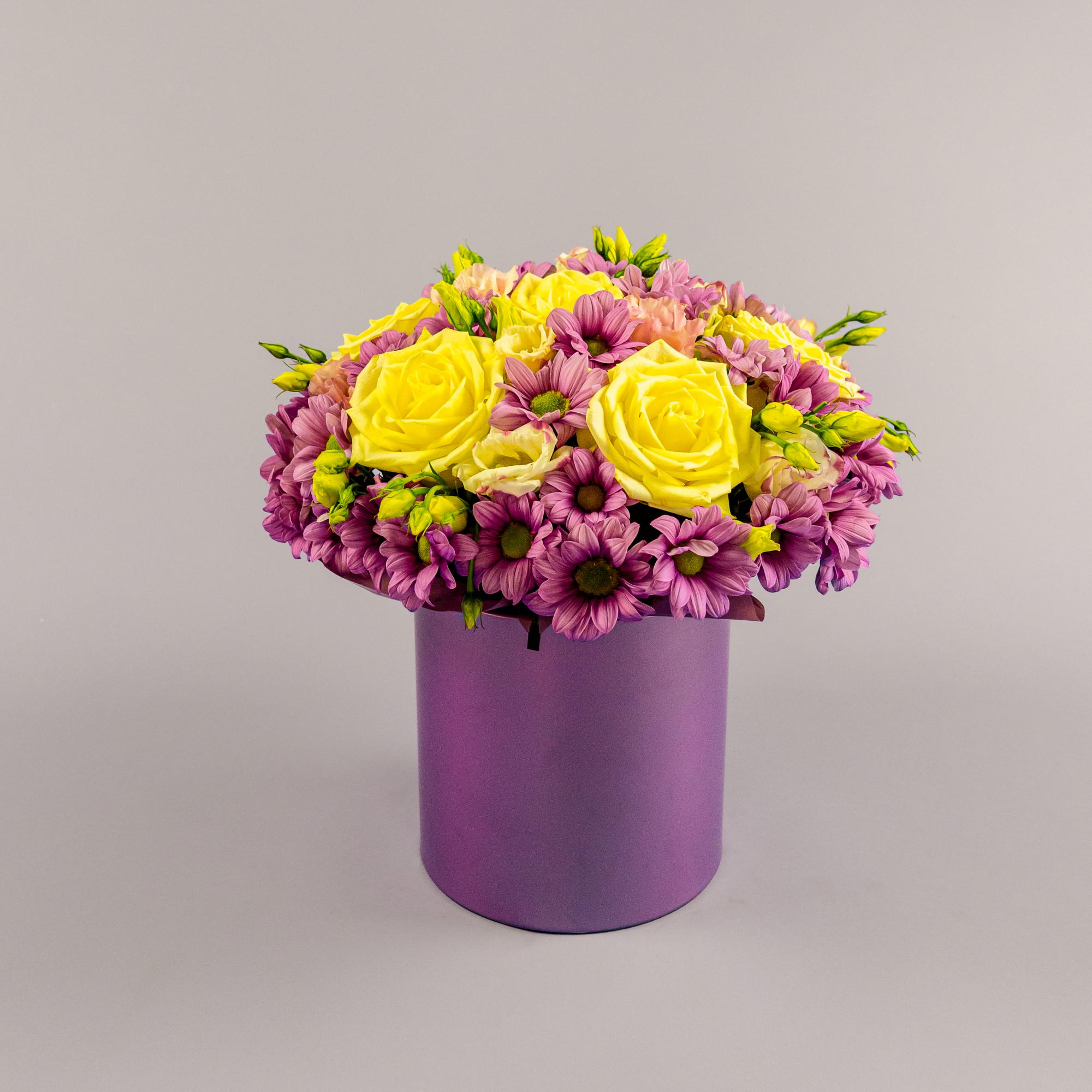Розы, хризантемы, эустомы в коробке
