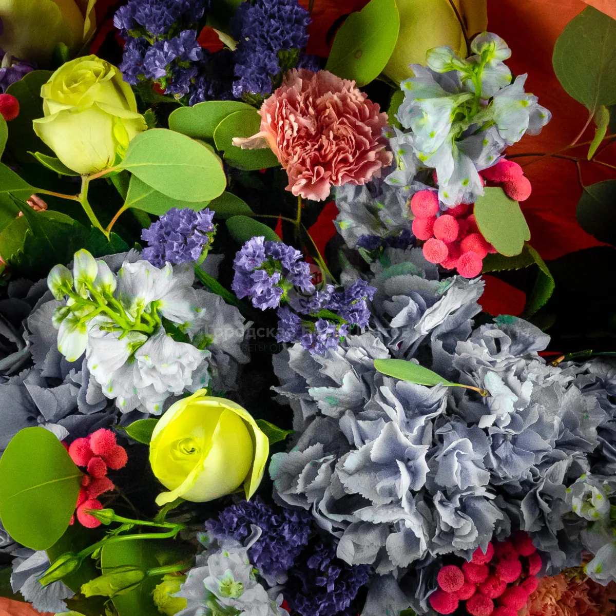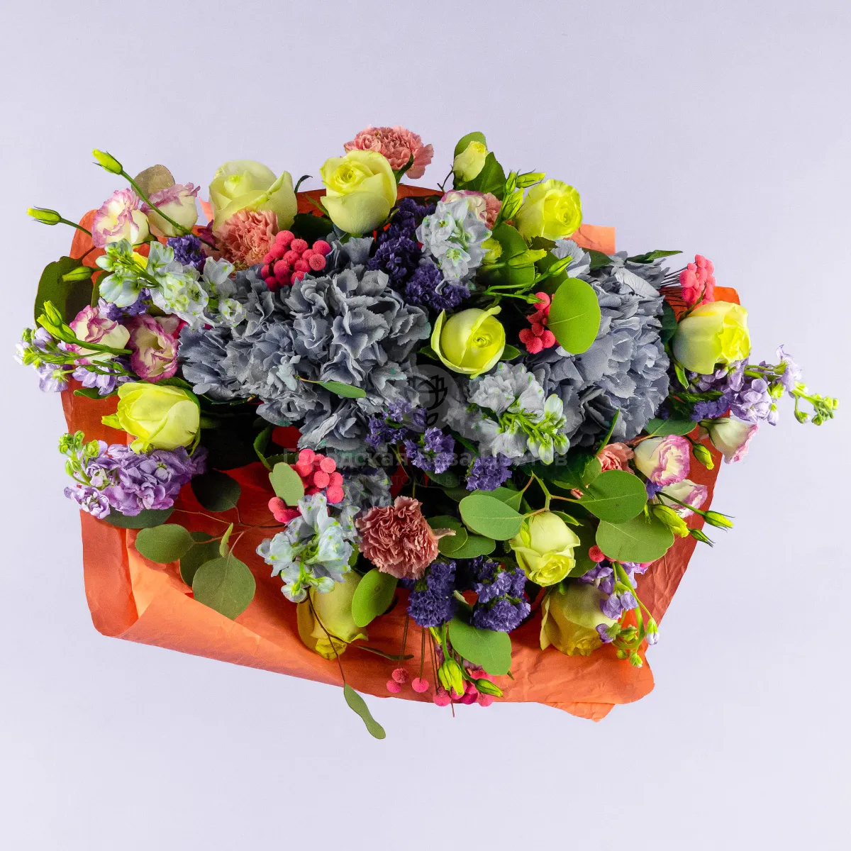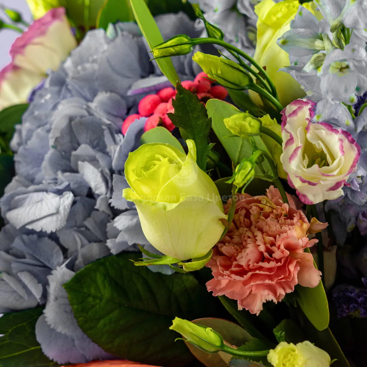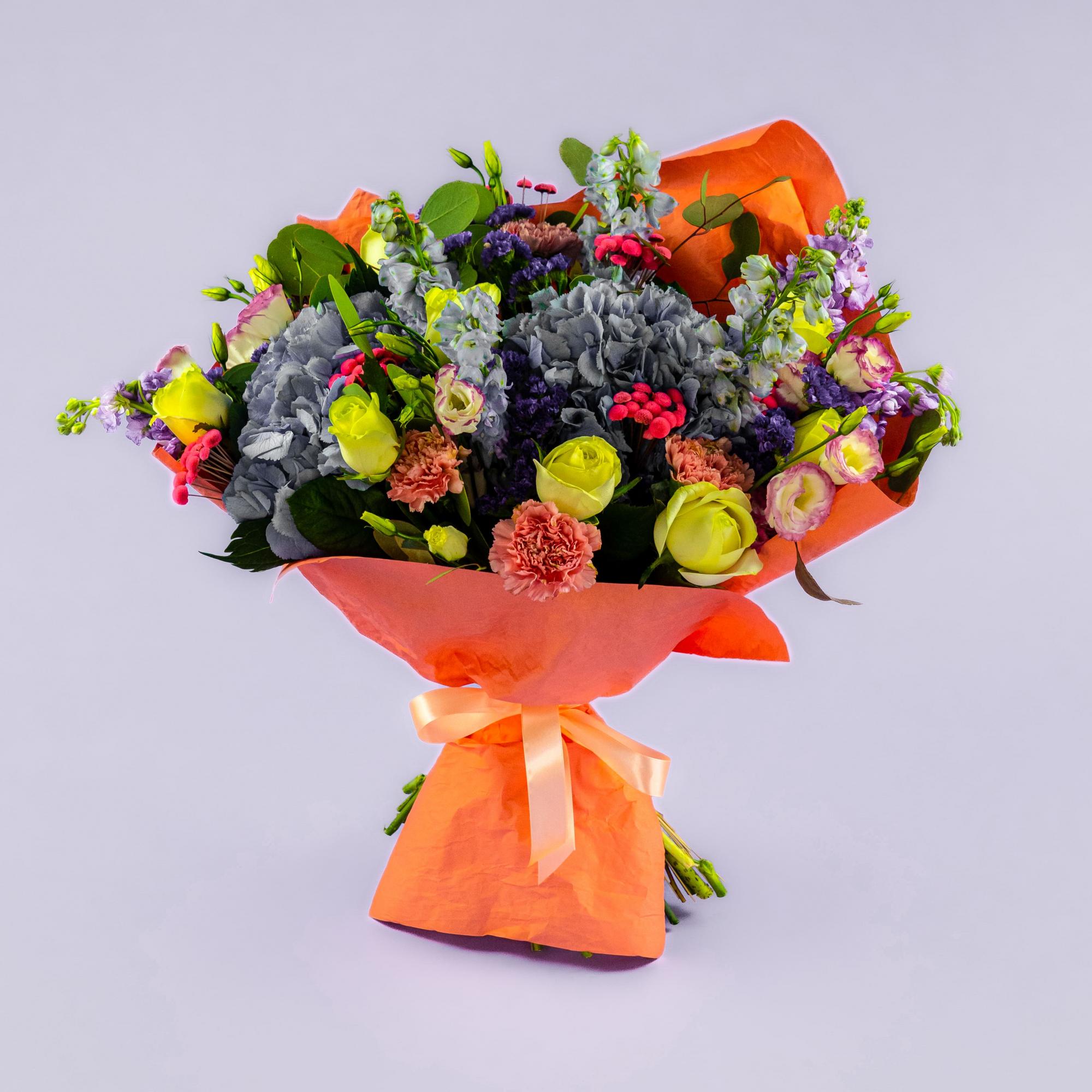 Букет из гортензии, роз и гвоздик