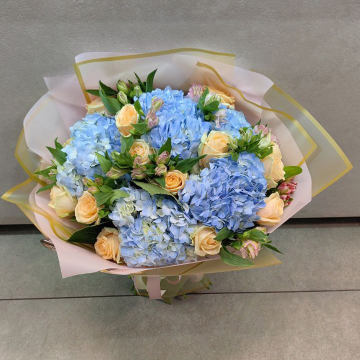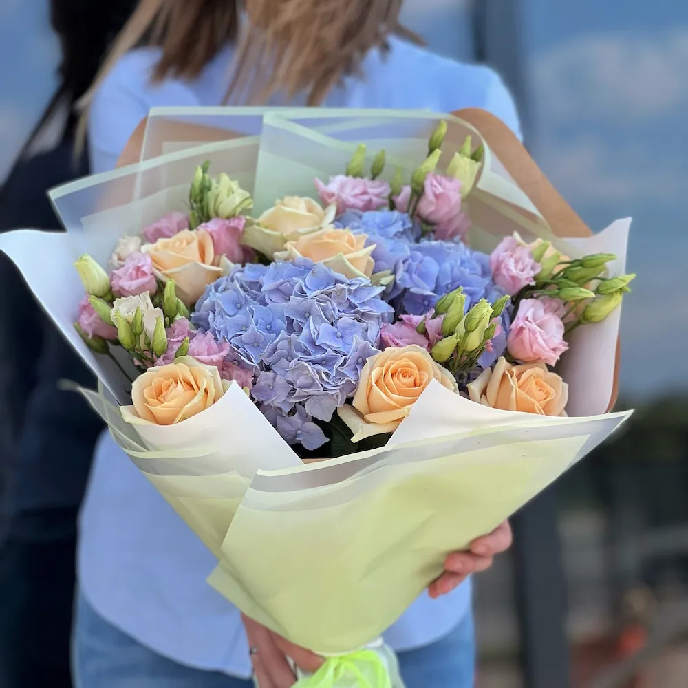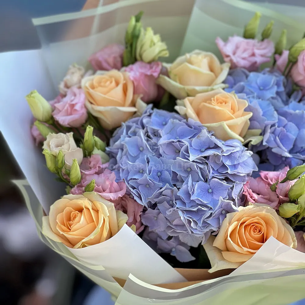Огромный букет роз, эустом и гортензии (60 см)