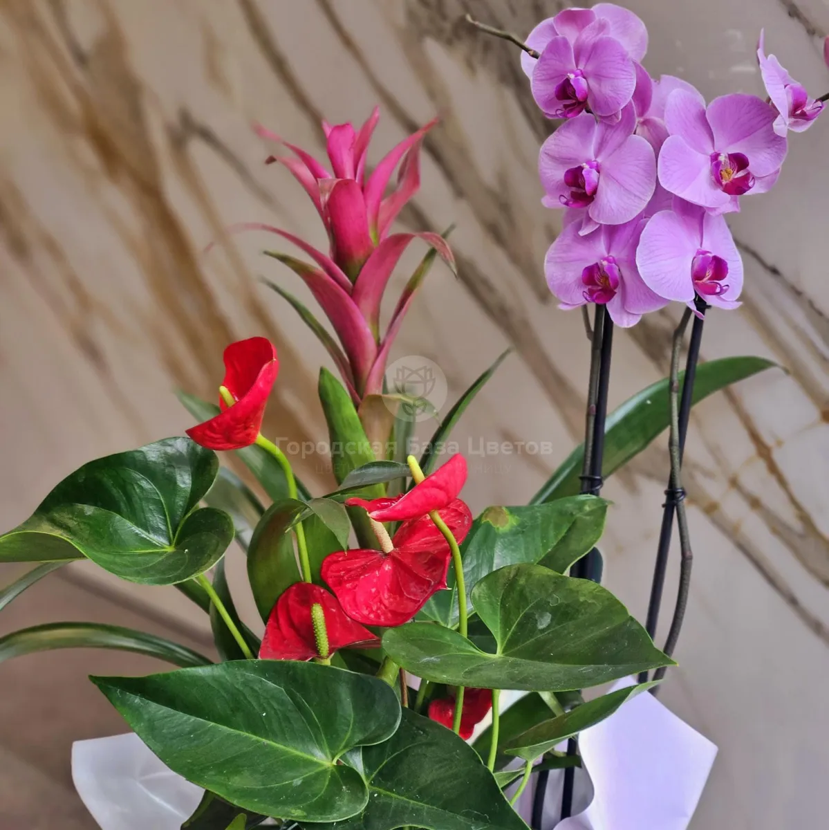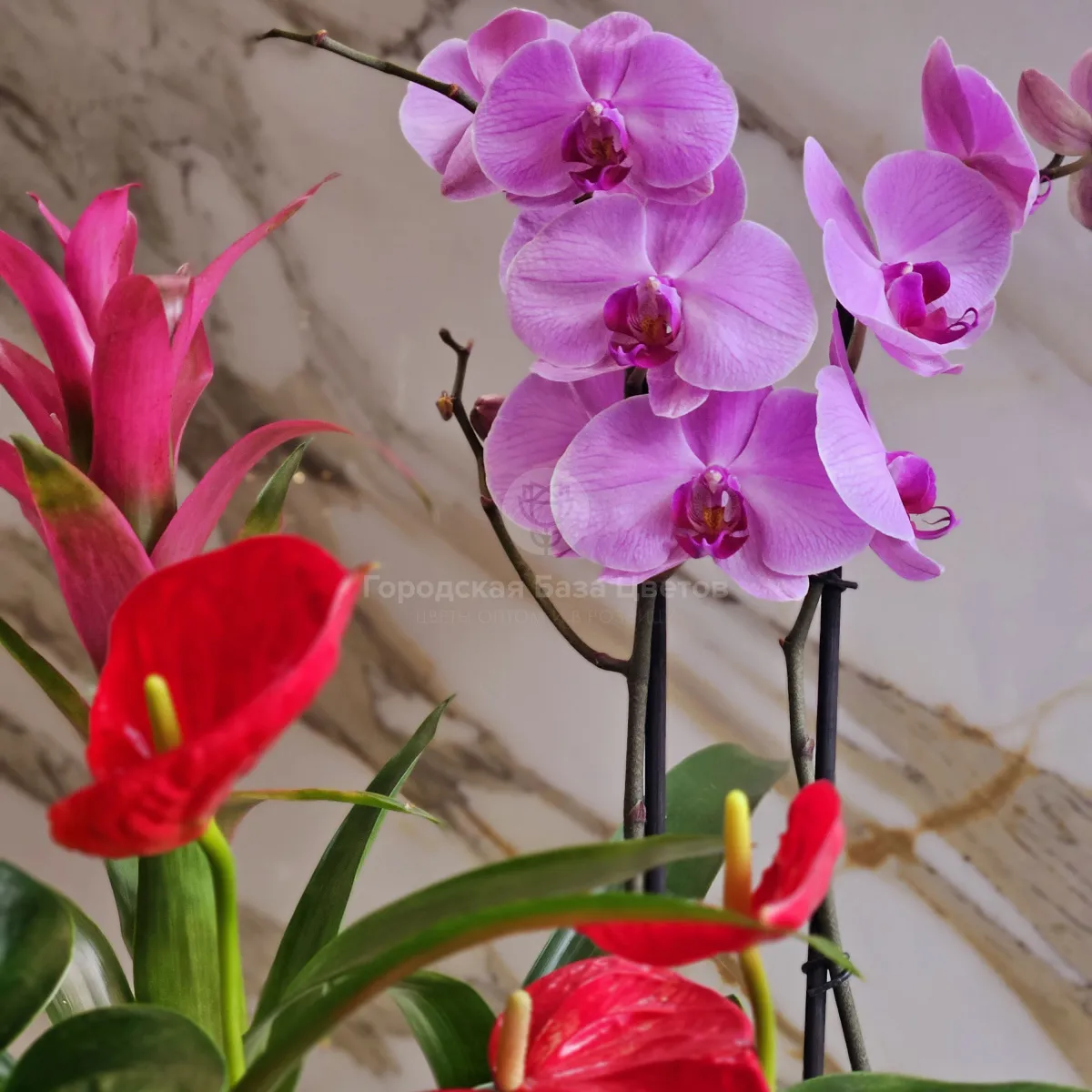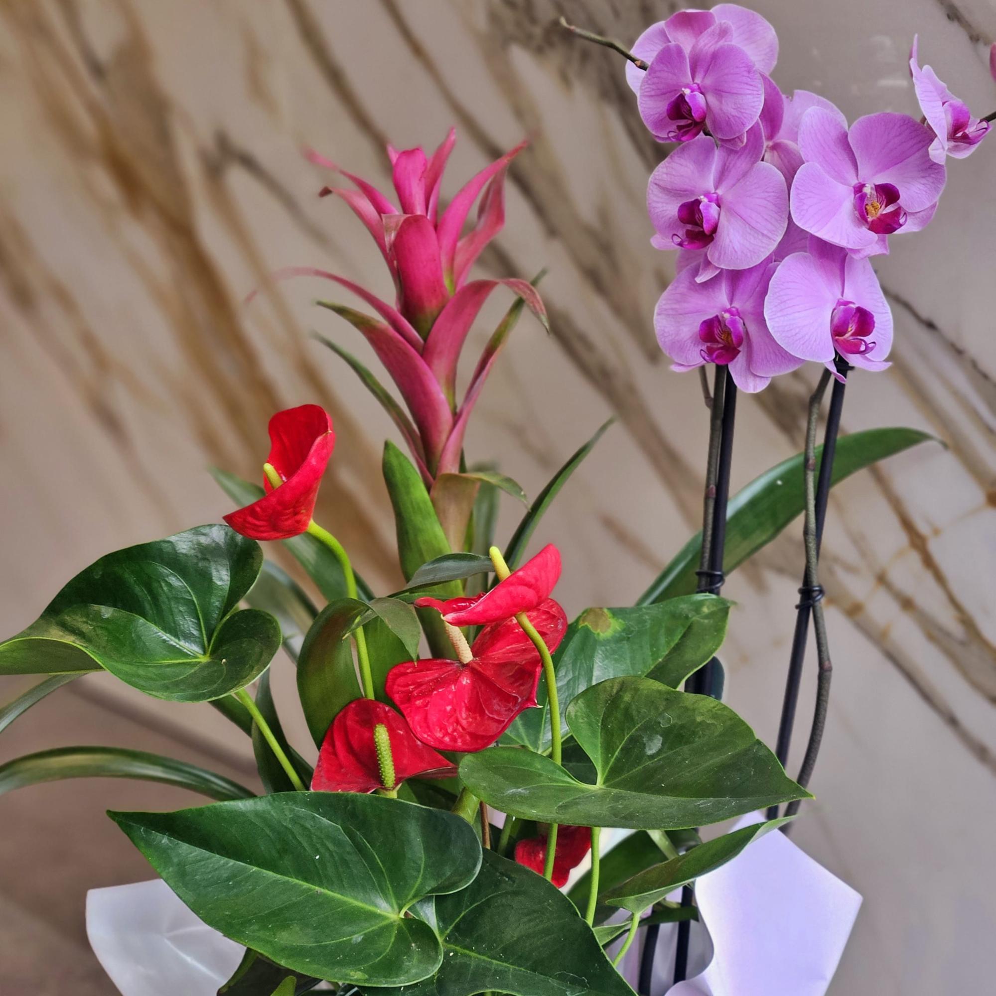 Композиция из орхидеи, гузмании и антуриума